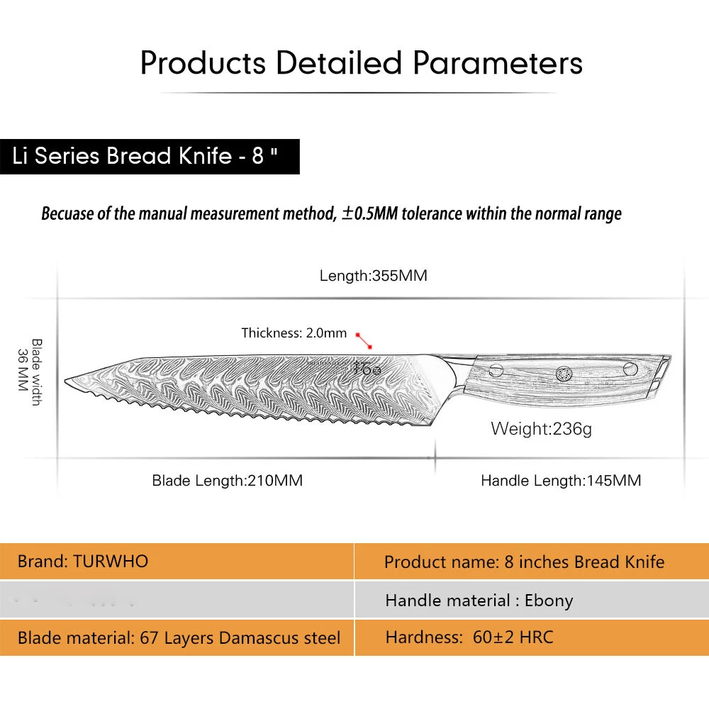 Feature: DAMASCUS KNIVES 6Pcs TURWHO Chef Knife VG10 Damascus Steel Kitchen Cleaver Slicing Boning Knife With Ebony Handle Feature: TURWHO Series kitchen knives are made of high quality Japanese 67-layer Damascus steel and treated with 60HRC vacuum heat treatment and liquid nitrogen cooling. The Rockwell hardness of the cutting core is 60+. The cutting edge is 16-18 degrees, which means the blade is super sharp. Compared with similar products at this price, it has outstanding performance advantages. Exquisite appearance: beautiful and impressive pattern. Every time you pick it up, you can't help but taking cooking seriously. AND remember? Serious men are always handsome. Then don’t forget to wipe your chef knife after using, to make a perfect finish to your cooking. Design Characteristics: these knives made of high quality Japanese 67-layer Damascus steel, The optimal size and weight own a best balance.Ergonomic ebony wood handle. The shade of handle is designed based on the human engineering. This can lessen your tiredness, numbness, and soreness even if you grasp it for a long time. Specification: Brand: TURWHO Blade Material: Japanese VG10 67-layer Damascus Steel Handle Material: Ebony Handle Cutting edge: 16-18 degrees Food Compatibility: vegetables, fruits, bread, meats, fish, salad, cheese, cake Manufacturer Warranty: Lifetime Weight: 2.95KG (including box) TURWHO Trust: We promise a superior product that will give you a lifetime of exemplary service, try it risk free, we know you'll love it. Package included: 1x TURWHO 8.2inch Chef Knife 1x TURWHO 8inch Bread Knife 1x TURWHO 8inch Slicing Knife 1x TURWHO 7inch Cleaver 1x TURWHO 7inch Santoku Knife 1x TURWHO 6.5inch Boning Knife 1x Premium Gift Box 1x Operation Instructions Item Specifics Features Easy Clean, Well Balance, Very Sharp, Gift Box Manufacturer Warranty Lifetime Material Japanese VG10 Damascus Steel Making Method Hot Air MPN EB1116-6P Bundle Description 6x Knives in Gift Box Number of Items in Set 6 Blade Length 6.5in, 7in, 7in, 8in, 8in, 8.2in Blade Edge Straight Handle Material Ebony Cutting edge 16-18 degrees Brand TURWHO Color Black Set Includes Knife Set Room Kitchen Food Compatibility Universal Type Knife Set Payment All purchases will go through eBay secured checkout to ensure that your order is processed without any delays. After you have made your purchase you can either click on 'Pay now' or follow the instructions in an automated email that you will receive shortly after your purchase. During the checkout, you can make an immediate payment by PayPal account, MasterCard, Visa or select an alternative method of payment, and receive the necessary payment details. Please note: If you have already marked payment as sent But actually not paid, then you MUST mark as payment not sent otherwise the PAY NOW button will not be available. Shipping 1.all orders will be Dispatched within 2 working days after payment. 2.orders are not processed on weekends or public holidays. 3.usually takes 3-6 business days to most US destinations. 4.Your patience would be much appreciated. 5.all items will be checked carefully and packaging well before send out. 6.All orders are including the tracking number. Any questions, please feel free to contact us. Returns Refund or replacement request is available only the requests within 60 days after parcel received & return the item as the same condition as received. Please contact us to request a return authorization. Your name, auction number, and reason for return should be included in the email. All items returned must contain all original packaging materials. Please repack the item carefully. Item returned will be tested and a new replacement will be shipped to the buyer immediately when found defective. In the event that a suitable replacement is not available then a refund will be issued. If the item is found non-defective and buyer just don't like it, we will still make you a full refund, but the return shipping fee at buyer's expense. All item return must have a RMA number, Please contact us to request a return detail address and the RMA number, this can help us identify return items accurate. Buyer is responsible for additional shipping costs for items that are returned refused or undeliverable. We do not accept any returns without an authorization number on the box or label it is being returned in. Contact Us We care about our valued buyers, if you have any questions, our Customer Service will be very glad to help you. For more information, please contact us through ebay message system. All questions would be answered within 48 hours. DAMASCUS KNIVES DESCRIPTION PAYMENT SHIPPING RETURN POLICY CONTACT US Shop Category Store Home Damascus Steel Kitchen Knife Hot Item 16x TURWHO Kitchen Knife Shears German Stainless Steel Meat Chef Knife Block Set USD 168.00 TURWHO 8in Chef Knife Japanese VG10 Damascus Steel Gyuto Knife Stabilized Wood USD 64.99 TURWHO 7inch Nakiri Knife Kitchen 67-Layer Japanese VG10 Damascus Steel Knives USD 68.80 TURWHO Chef Knife + Nakiri Knife 9Cr18Mov Hi-Carbon Steel Handmade Kitchen Knife USD 74.99 TURWHO 24cm Sashimi Knife Yanagiba Fish Sushi Salmon Slicing Kitchen Chef Knife USD 49.99 New List Item 7x TURWHO Chef Knife Set German Steel Kitchen Santoku Kiritsuke Knife Block Set USD 168.00 TURWHO 8in Chef Knife +10.5in Slicing Knife Japanese VG10 Damascus Steel Knife USD 134.00 TURWHO 7in Nakiri Knife Japanese VG10 Damascus Steel Chef Knife W/ Rose Pattern USD 68.80 7x TURWHO Kitchen Knife Block Set Japan VG10 Damascus Steel Chef Knife Scissors USD 299.00 4Pcs TURWHO 5inch Steak Knife Dinner Cutlery Beef Meat Knife + Kitchen Scissors USD 59.99 Delivery Help & Info Payment Policy Shipping Policy Return Policy FAQ About Us 6Pcs TURWHO Chef Knife VG10 Damascus Steel Kitchen Cleaver Slicing Boning Knife With Ebony Handle Feature: TURWHO Series kitchen knives are made of high quality Japanese 67-layer Damascus steel and treated with 60HRC vacuum heat treatment and 