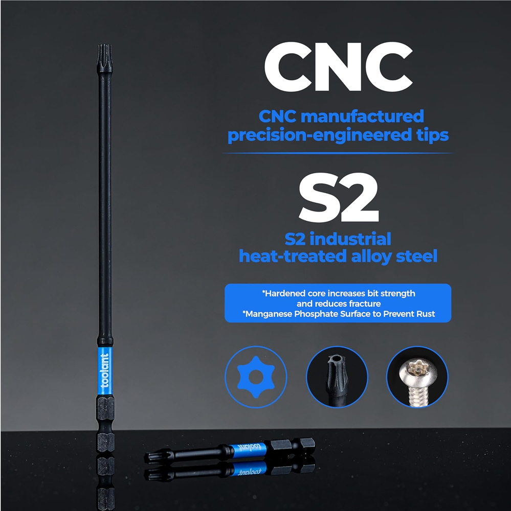 toolant impact security torx bit set 13pcs. Torsion zone to absorb torque peaks to avoid breakage. 10 times life expectancy versus standard bits. For impact driver, drill and screwdriver. 13pcs tamper proof torx bits-tt7, tt8, tt9, tt10, tt15, tt20*2, tt25*2, tt27, tt30, tt35, tt40-1/4” quick release hex-shank, 6” long. CNC machined tips, S2 alloy steel body, hardened core to increase bit strength and reduce fracture. Manganese Phosphate surface to prevent rust. Strengthened magnetic impact torx bits helps you easy pick up screws. The magnetism doesn’t decay after multiple uses. Widely used in home repairs, automobiles, woodworking and other screw driving applications. All day after-sale service. Thanks for choosing toolant. Product Description toolant Impact Torx Bit Set Features S2 Alloy Steel Industrial heat-treated high quality steel body to ensure durability CNC Machined Magnetic Tip CNC manufactured precision-engineered magnetic tips reduces breakage and cam-out Torsion Zone Absorbs high torque of impact driver to avoid fracture when heavy screw driving,10X lifetime over standard bit Phosphating Surface Rust-proof treatment to ensure good condition even in humid environment SAFETY TORX BIT LONGER FOR WIDER APPLICATION 1 MOTORCYCLE 2 MACHINE 3 CHAIR toolant Impact Bit Set Add to Cart Add to Cart Add to Cart Add to Cart Add to Cart Customer Reviews 4.6 out of 5 stars 3,316 4.7 out of 5 stars 5,568 4.5 out of 5 stars 633 4.6 out of 5 stars 173 4.6 out of 5 stars 237 Price $13.99 $ 13 . 99 $12.99 $ 12 . 99 $11.99 $ 11 . 99 $20.99 $ 20 . 99 $39.99 $ 39 . 99 Material S2 Alloy steel S2 Alloy steel S2 Alloy steel S2 Alloy steel S2 Alloy steel Impact resistance √ √ √ √ √ Drive System torx hex philips impact bit set torx Magnetism √ √ √ √ × Number of Pieces 27 20 11 52 8 Size T7-T40 Metric:1.5-8mm SAE:5/64”-5/16” ph2 1",2",4"&6" 1"&3.5" T30-T70