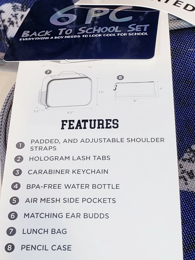 Love2design 6 Piece School Backpack Set Dinosaurs lunch bag ear buds. Features included Backpack padded and Adjustable shouldrr straps/ hologram lash tabs/ carabiner Keychain/ bpa free water bottle/ air mesh side pockets/ matching ear budds/ lunch bag and pencle case brand new .