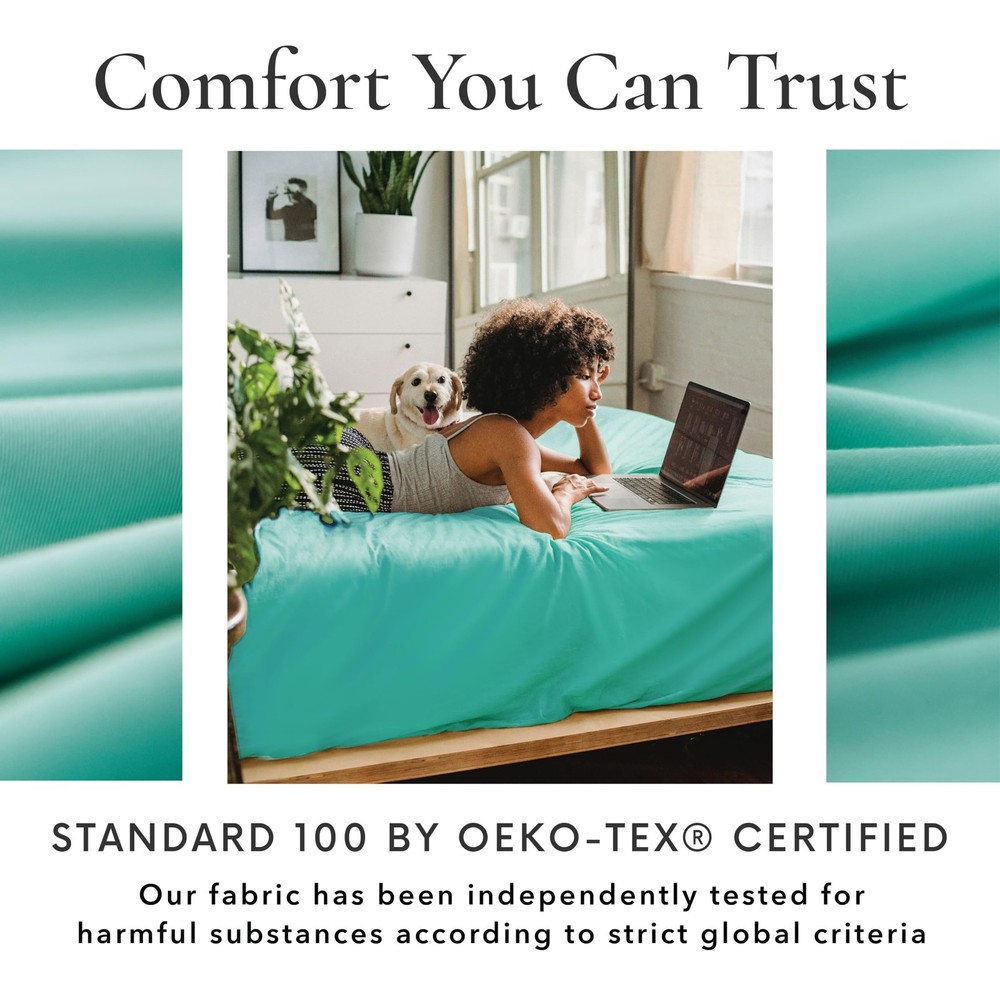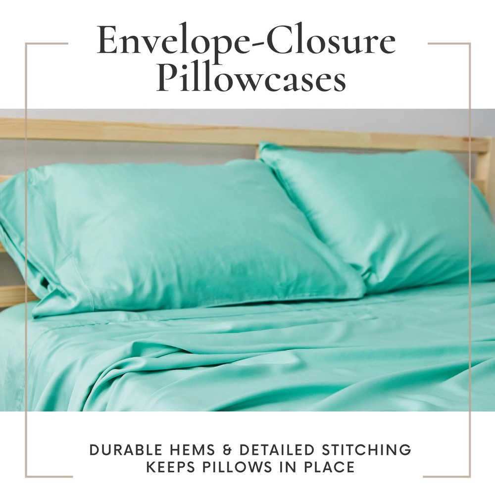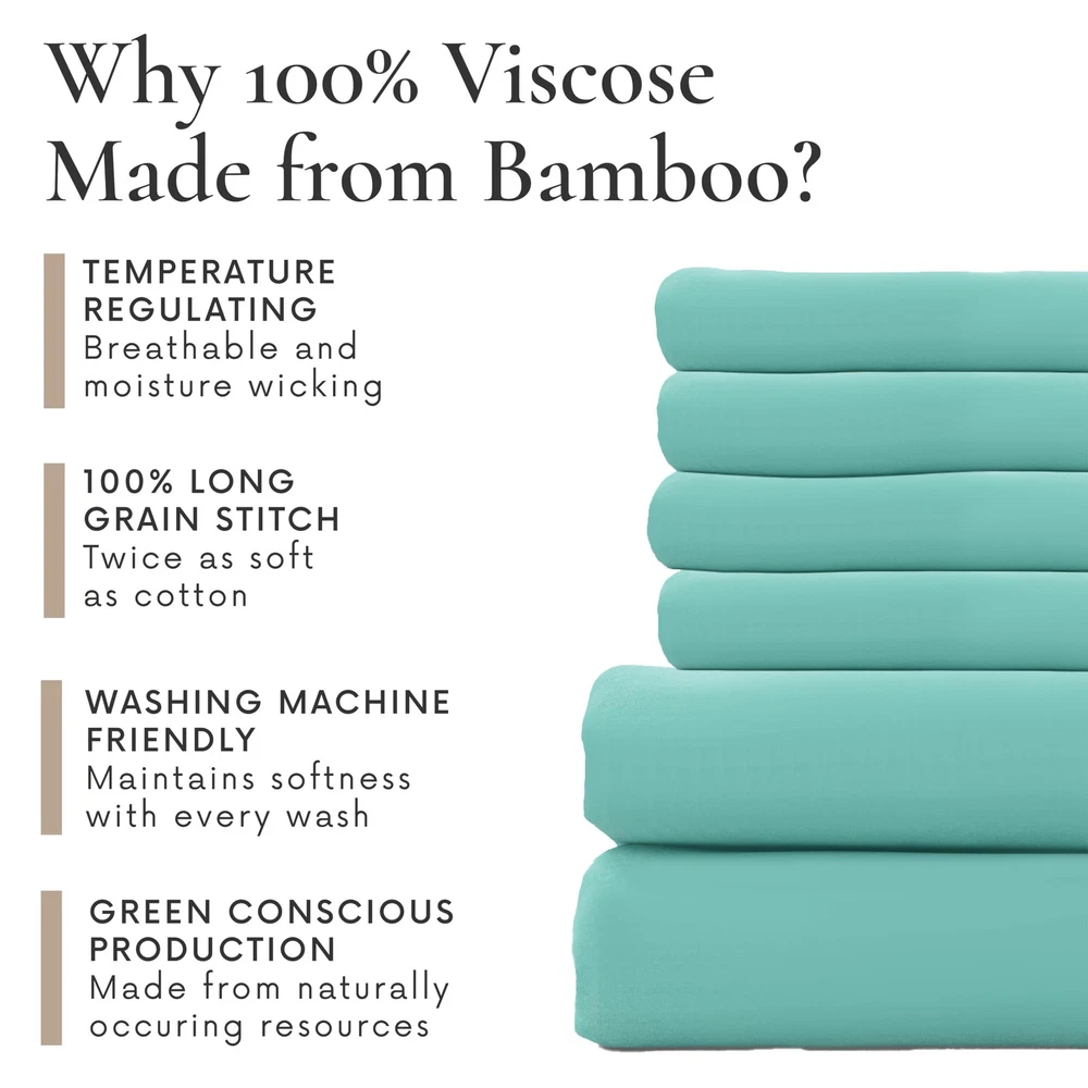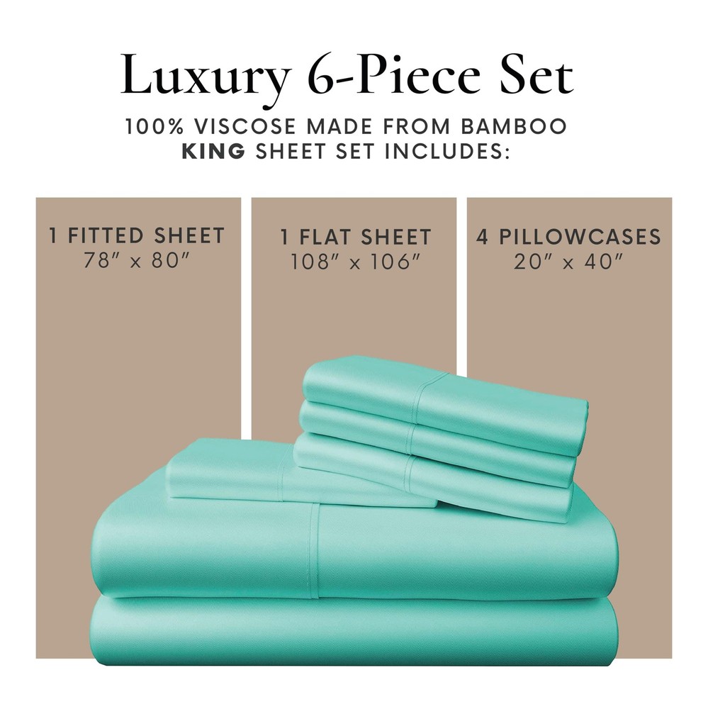 Transform your sleep experience with our Bed Sheets Set. Made of 100% viscose derived from bamboo, these bed sheets are durable, long-lasting, and offer a luxuriously soft, silky-smooth, and breathable feel. Cooler than cotton and perfect for hot sleepers, each of these cooling sheets is moisture-wicking, helping regulate temperature and keeping you cool and dry throughout the night. This king size sheets set includes 1 fitted sheet (78” x 80”), 1 flat sheet (108” x 106”), and 4 oversized pillowcases (20” x 40”). Designed with extra-deep pockets, the fitted sheet fits mattresses up to 16 inches thick, while reinforced elastic and fully elasticized edges ensure a secure, stay-put fit. The pillowcases have envelope closures for a clean, tailored look that keeps your pillows in place. Caring for your king size bed sheets set is easy–just machine wash cold and tumble dry low. No special treatments or fabric softeners needed. The fabric is also less prone to pilling compared to traditional cotton, ensuring a smoother surface wash after wash. They’re also wrinkle-resistant, so your bed always looks effortlessly polished with minimal maintenance. Plus, these sheets are OEKO-TEX certified, ensuring they're free from harmful substances and safe for you and your family. As a proud USA-based, veteran-founded business, we are committed to delivering high-quality, eco-conscious products. And with our 180-night satisfaction promise, you can rest easy knowing your comfort is guaranteed. Upgrade to breathable, silky-smooth bed sheet & pillowcase sets and discover what it means to sleep in sustainable luxury night after night. Soft, Luxurious, & Gentle on Skin. Our Bed Sheets Set is made from 100% viscose derived from bamboo. With a silky, breathable weave, these bed sheets feel cool, soft, and smooth, making it perfect for restful, skin-friendly sleep all night long. Stay Cool & Dry All Night. Designed for hot sleepers, our cooling sheets wick away moisture, reduce heat build-up, and fight night sweats. These king size bed sheets help regulate body temp so you stay cool and dry, and wake up feeling refreshed. Complete King Size Set. This king size sheets set includes 1 fitted sheet (78” x 80”), 1 flat sheet (108” x 106”), and 4 oversized pillowcases (20” x 40”). With its deep pockets and reinforced elastic, our bed sheet set can fit mattresses up to 16”. Naturally Safe & Planet-Friendly. Our premium king size sheets are OEKO-TEX certified, free from harsh chemicals, safe for you, and kinder to the planet. Made from sustainable materials, they’re machine washable, fade-resistant, and easy to clean. Veteran Founded & 180-Night Promise. Our king size bedding set and pillowcases are part of a USA-based, veteran-founded small business. We take pride in our quality, provide unrivaled customer support, customer satisfaction and a 180-night promise.