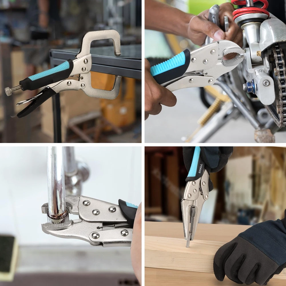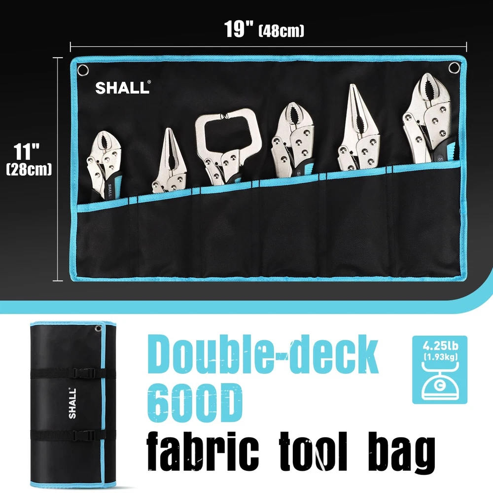 Complete Locking Pliers Set: Including 5", 7" & 10" curved jaw locking pliers (Max jaw capacity: 1-1/4", 1-1/2" & 2-1/8 "), 6-1/2" & 9-1/2” long nose locking pliers (Max jaw capacity: 2-1/8" & 4-1/16"), 6" locking c-clamp (Max jaw capacity: 2"). Notice: Pliers’ surfaces covered with slushing oil for rust protection and it’s normal and harmless. Wipe these pliers before using then them in a dry environment Adjustable Tightening Screw & Quick Release Lever: Applicable for adjusting suitable jaw openings in order to deliver the ideal clamping pressure for different projects. Able to close the jaw immediately for storing -Color TPR Handle: Ergonomic design, providing non-slip grip and comfortable hand feel. lightweight and labor-saving, reducing hand fatigue. More efficient, operating with less effort Roll Up Storage Pouch: Made of black double-deck 600D fabric, featured with 6 pockets inside and plastic buckle for organized storage. Easy to carry, compact and save storing space in storeroom Multiple Use: Used to loosen frozen nuts and bolts (curved jaw locking pliers), clamp narrow materials and grip staples and other small fasteners (long nose locking pliers), grip tapered or thin materials, join edges to ends in face frames, and reach around rolled edges, I-beam lips, angle iron bends, and other barriers (locking c-clamp)
