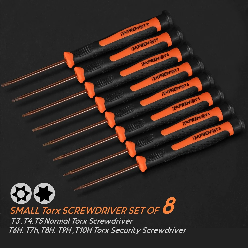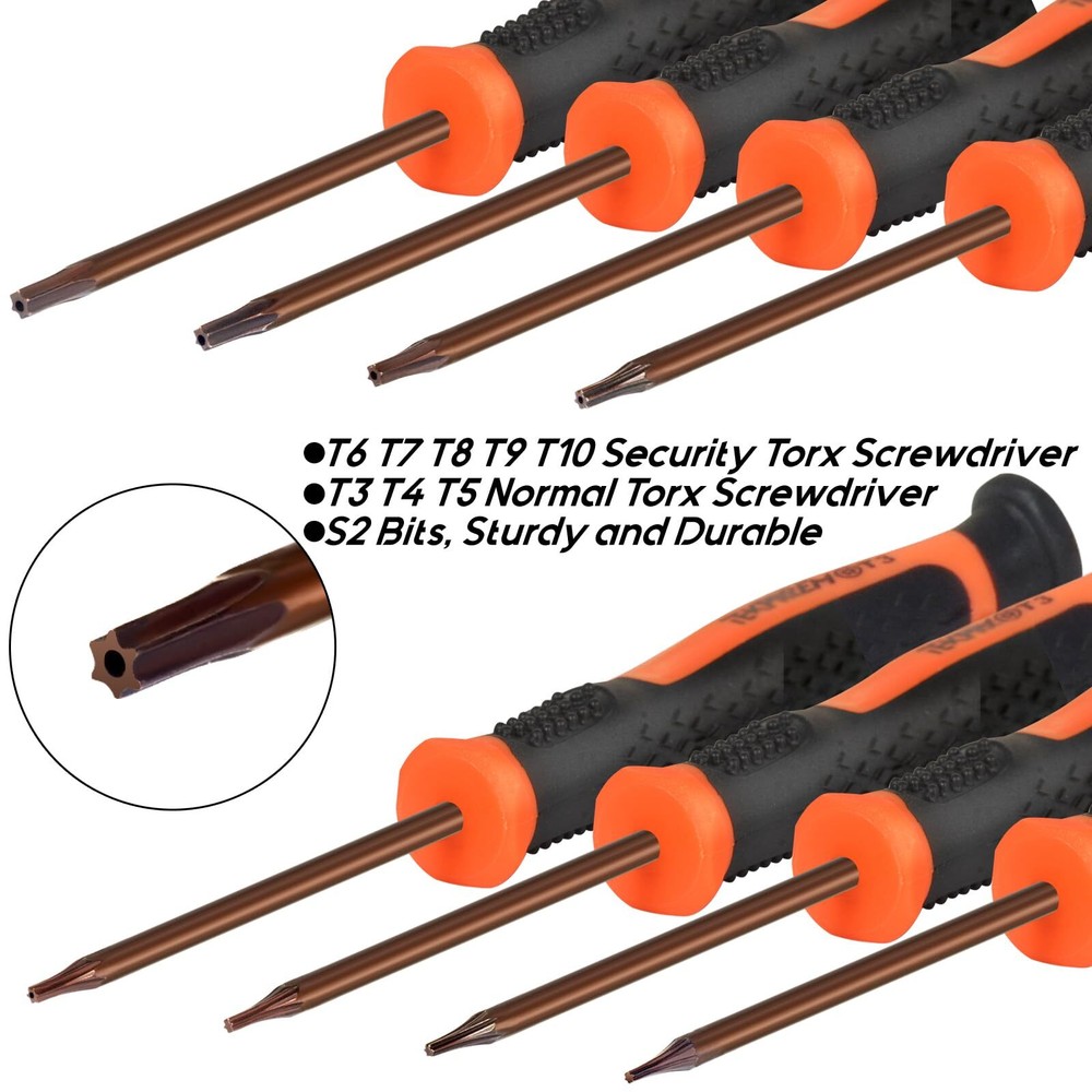 [Small Torx Screwdrivers Tool Set]: The new TEKRREM small, complete Torx screwdriver set includes T3, T4, and T5 Torx screwdrivers, as well as T6, T7, T8, T9, and T10 security Torx screwdrivers. This compact and convenient tool kit comes neatly packed in a plastic zip-lock bag, ensuring easy storage. [Hardened S2 Steel Torx Screwdriver Bits]: All Torx bits are crafted from hardened S2 steel, providing exceptional durability and strength for daily use. These bits are precisely designed to fit and remove small Torx screws effortlessly. [A MUST-HAVE Torx Set]: The bit shafts are 2.16 inches (55mm) long, making them ideal for screws located in deep holes. This set is suitable for use with Xbox One, Xbox 360 and controllers, MacBook, Mac Mini, PS3, PS4, computers, laptops, electronics, smartphones, small devices, folding knives, and more. [Magnetic Torx Screwdrivers]: The precision Torx screwdrivers are magnetic, making it easy and convenient to pick up tiny screws. [Non-slip Handle]: These Torx screwdriver handles are made of plastic with TPR and PP materials. They feature an ergonomic grip for repeated use and a swivel cap for convenient handling.