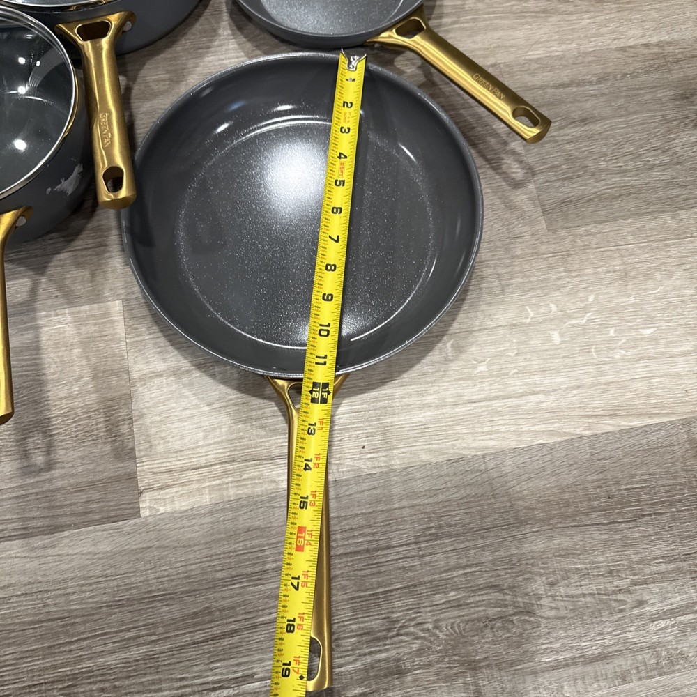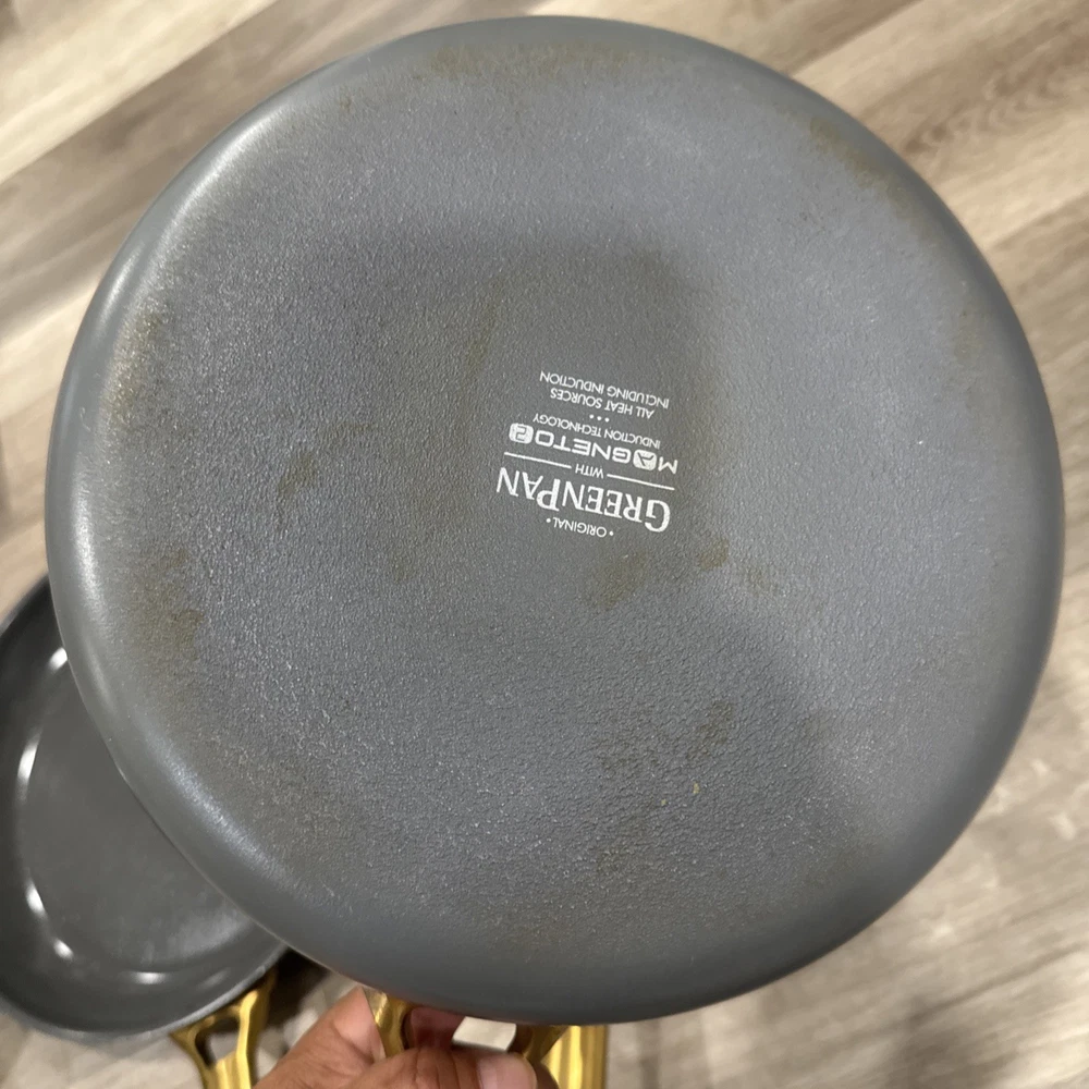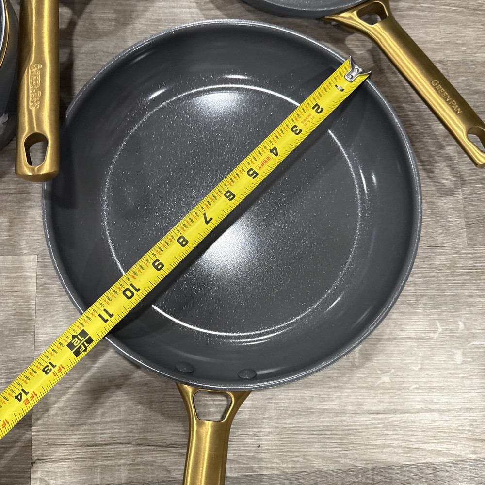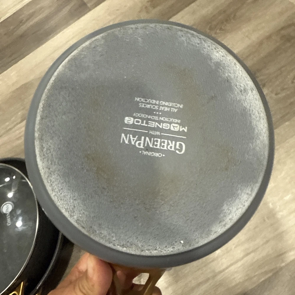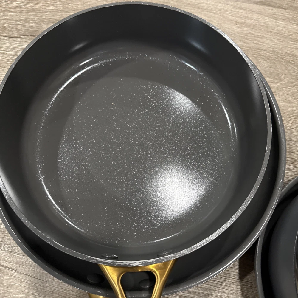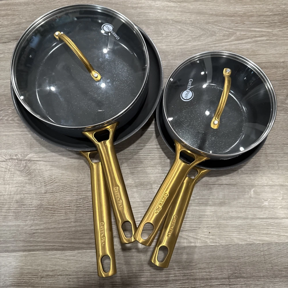 This 6-piece set of nonstick frying pans by GreenPan is perfect for any kitchen. With a sleek navy black and gold design, these round pans are compatible with induction, electric, gas, and ceramic stoves. Featuring a long handle, flat-bottomed design, and easy-clean surface, these pans are perfect for everyday cooking. The non-stick coating ensures easy food release and clean-up, while the dishwasher-safe feature makes for convenient maintenance. Upgrade your cooking experience with this versatile and high-quality set of frying pans. Insure if they been used or not so I marked as used Look at the pictures before making your purchase