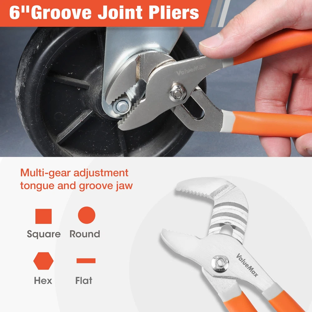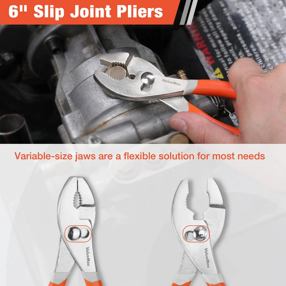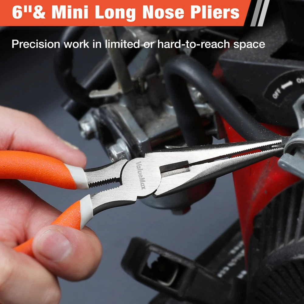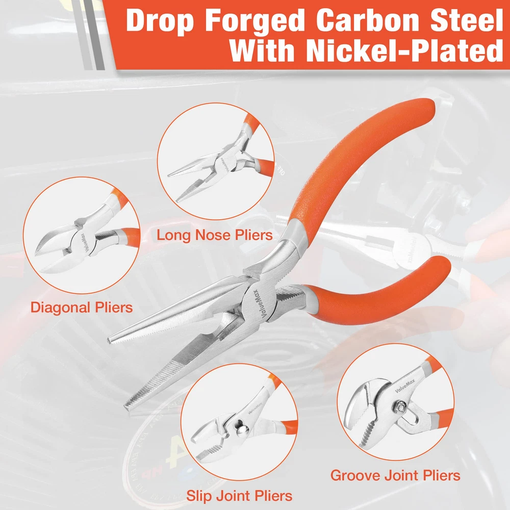 PACKAGE INCLUDING: Our pliers tool set including 6 Inch Long Nose Pliers, 6 Inch Diagonal Pliers, 6 Inch Slip Joint Pliers, 8 Inch Groove Joint Pliers, 4-3/4 Inch Long Nose Pliers, 4-1/4 Inch Diagonal Pliers. Variety of pliers for projects and tasks ranging from fastening to wire cutting. PREMIUM QUALITY: Pliers are made of premium drop forged hardened carbon steel with nickel-plated, which ensures our pliers are sturdy, durable, and long-lasting. Tips: pliers are covered in grease to prevent getting rusty, wipe grease off before using. ERGONOMIC DESIGN: Non-slip, comfort grip handles provide better leverage when gripping objects. Hardened cutting edges for extra-tough and easy cutting. Heat-treated jaw help with gripping power and the overall life of the product. 6 PIECES BASIC PLIERS TOOL SET: Our 6-piece set of pliers can be used for gripping small parts, bend, shape, and twist wire, tightening & loosening nuts, bolts, pipe & fittings, holding or bending flat or round stock and cutting wires. WIDE APPLICATION: These pliers are great for home repair, gardening, and a variety and general use.