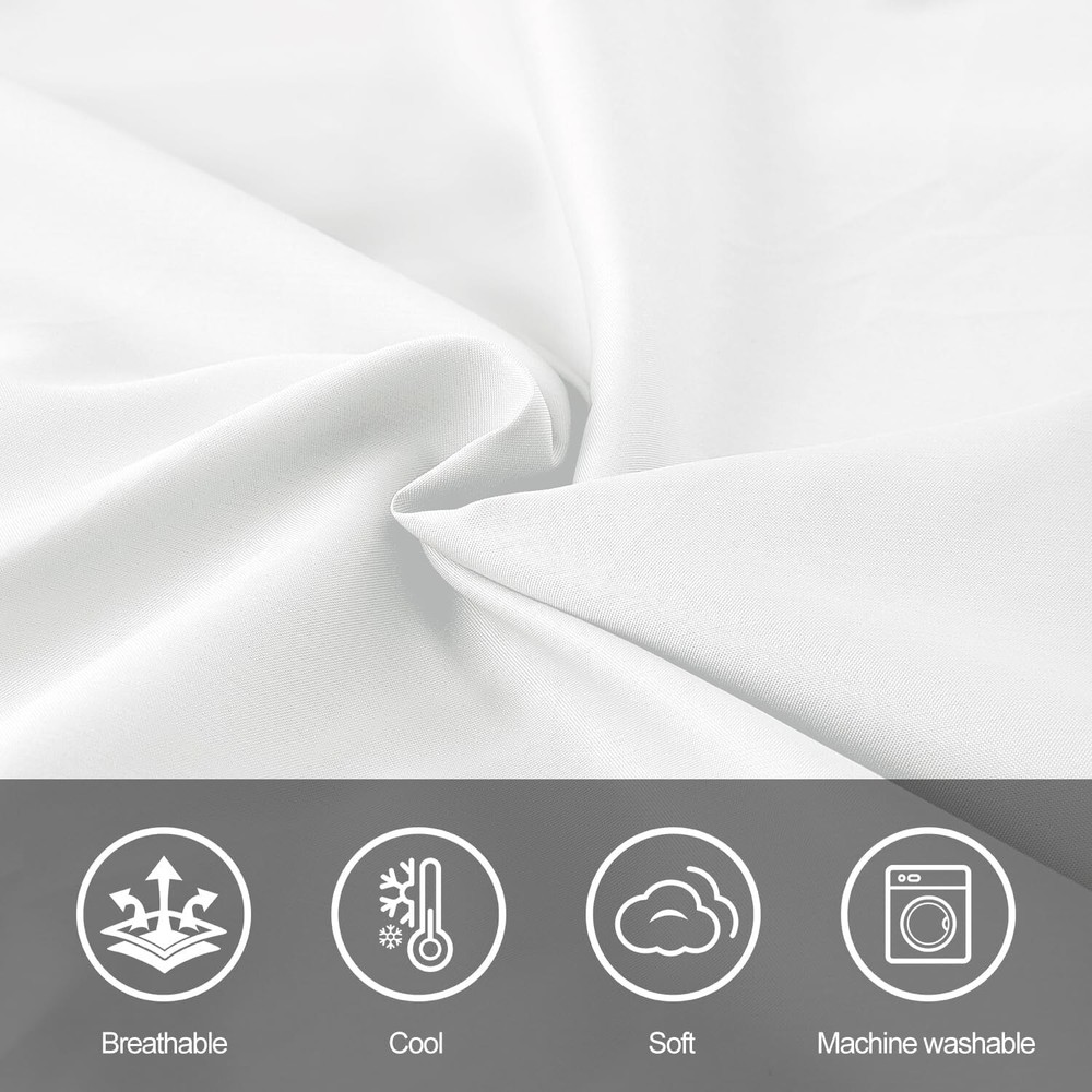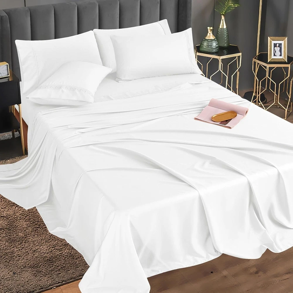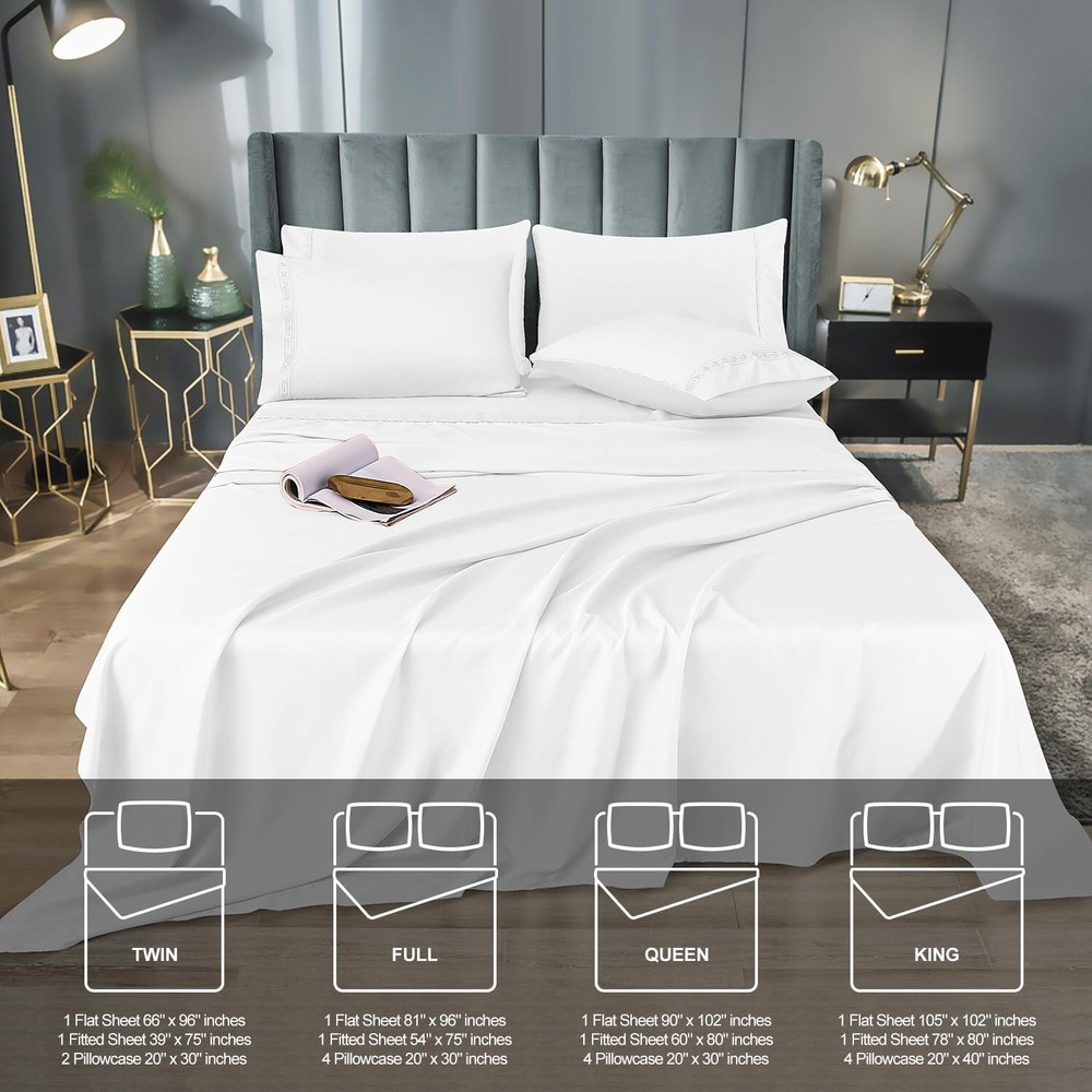 COOLING & BREATHABLE COMFORT - Elevate your sleep experience with our premium bedding set. Lightweight and breathable, our sheets are crafted to keep you cool and refreshed. The sheets' natural temperature regulation and moisture-wicking properties create an oasis of comfort for a restful night's sleep. LUXURIOUS BED SHEET SET - Indulge in the silky softness of our bed sheets set. The bed sheet set is made of 60% polyester and 40% rayon derived from bamboo. Gives you a comfort of nature. PERFECT FIT & STABILITY - Experience a seamless fit on any mattress up to 16 inches thick. Our deep pocket design and all-around elastic ensure a snug fit for memory foam or traditional mattresses, providing stability throughout the night. No more slipping sheets—just uninterrupted sleep. ARTISTIC EMBROIDERY DETAIL - Transform your bedroom with our MCO bed sheets. Each pillowcase features beautifully crafted embroidery, adding an artistic touch to your sanctuary. Elevate your sleep space with the perfect blend of comfort and style. EASY CARE & DURABLE - MCO sheets offer easy maintenance compared to traditional cotton sheets. These sheets are fade, wrinkle, tear, and shrink resistant, ensuring long-lasting durability. Machine washable with cold water and tumble dry low for a hassle-free bedding experience. COMPLETE BEDDING SET - Redefine your bed with our Full sheet set. The 6-piece set includes 1 x flat sheet (81"x96"), 1 x fitted sheet (54"x75") and 4 matching pillowcases (20"x30"). The White color adds an elegant touch to your room. SHOP WITH CONFIDENCE - We stand behind our product with a 30-night risk-free satisfaction guarantee. Your comfort is our priority. If you have any concerns about our sheets, reach out to us. Add to cart now and experience the unmatched comfort of MCO sheets. · Size Full Unit Count 6 Set Fitted Sheet Pocket Depth 16 Inches Style Color White Pattern sollid Style Name Traditional Theme Solid Seasons All