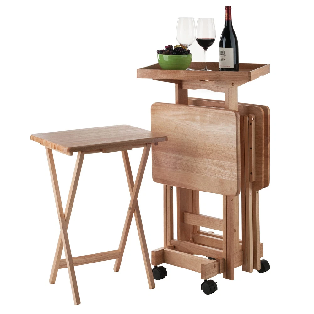 Perfect for entertaining or relaxing on the patio or in front of the TV, this set of Solid Wood Snack Tables comes with an upright stand that stores the folded tables securely and discretely when not in use. A removable wood serving tray that sits atop the stand provides extra table top space when needed. The stand rolls easily on casters, two of which lock to keep the unit stable. And with each of the 4 tables opening to a generous 19"W x 14.5"D, there is plenty of room for a meal, snacks and drinks. Made of Solid Wood in a Natural finish. Sold as 1 Each. 4 Solid Wood Folding Tables. Made of Solid Wood. Upright storage stand. Stand dimensions: 12"W x 15.9"D x 35"H. Removable Serving Tray 19.7"W x 14.9"D. Tables come fully assembled. Stand rolls on casters, two of which are locking. Parts replacement within 30 days.