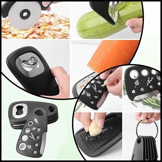 About this Item ✅ STACKABLE & SPACE-SAVING DESIGN Tired of cluttered drawers and misplaced utensils? Our compact 6-piece kitchen gadget set is designed to keep your kitchen or RV organized and mess-free. Each tool stacks neatly together, locking securely in place for easy storage or hanging on the included durable ring. Whether you're in a small kitchen, camper, or RV, this set ensures you save valuable space while keeping your essentials within reach. Say goodbye to digging through drawers or losing tools—everything stays tidy and accessible! ✅ 6 ESSENTIAL KITCHEN TOOLS IN ONE SET This all-in-one gadget set equips you with six versatile tools: a cheese grater, vegetable peeler, pizza cutter, bottle opener, garlic/ginger grinder, and herb stripper. These tools cover a wide range of cooking needs, making meal prep more efficient and enjoyable. Whether you're a home chef, an outdoor cooking enthusiast, or an RV traveler, this set is perfect for slicing, peeling, grating, and more—anywhere you go. Compact yet comprehensive, it’s ideal for both everyday use and on-the-go culinary adventures. ✅ USER-FRIENDLY FOR ALL SKILL LEVELS Our kitchen tools are designed with simplicity and convenience in mind. Whether you're an experienced chef or just starting your cooking journey, these gadgets make meal prep straightforward and stress-free. Ergonomic handles ensure a comfortable grip, while the sharp blades and functional designs make slicing, peeling, and grating effortless. Perfect for beginners, busy families, or anyone who appreciates efficiency in the kitchen. ✅ LIGHTWEIGHT, DURABLE & BUILT TO LAST Crafted from premium ABS plastic and high-quality stainless steel, this gadget set combines durability with portability. The sturdy stainless steel blades ensure precise cutting and grating, while the lightweight construction makes these tools easy to handle and transport. Whether you’re cooking at home, preparing meals in an RV, or packing for a camping trip, this set is built to withstand daily use while remaining lightweight and compact for travel. ✅ AN IDEAL GIFT FOR EVERY OCCASION Looking for the perfect gift? This 6-piece gadget set comes thoughtfully designed and neatly packaged, making it an excellent choice for any occasion. Whether it’s a housewarming, a bridal shower, or a gift for an RV or camping enthusiast, this set is both practical and stylish. It's the ultimate solution for anyone who loves cooking, camping, or keeping their kitchen organized. Compact, versatile, and space-saving, it’s a gift they’ll use and appreciate for years to come. Perfect for enhancing your cooking experience, this set blends style, convenience, and functionality, making it a must-have addition to any kitchen or travel setup!