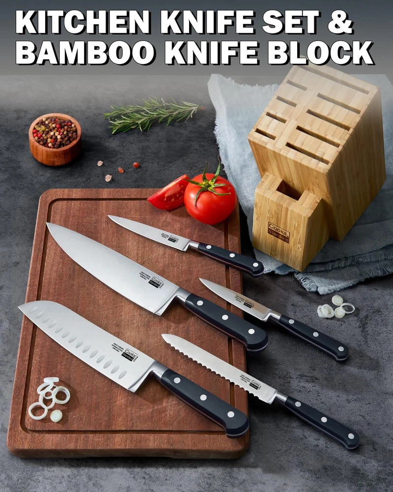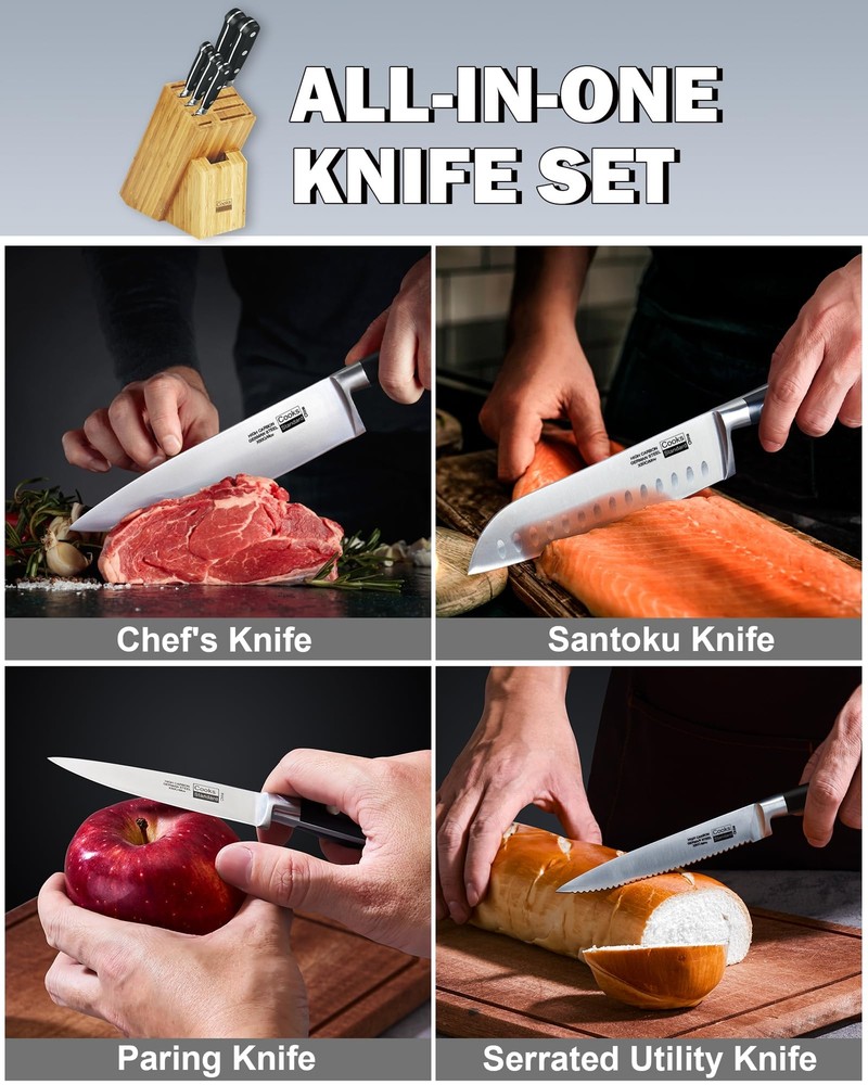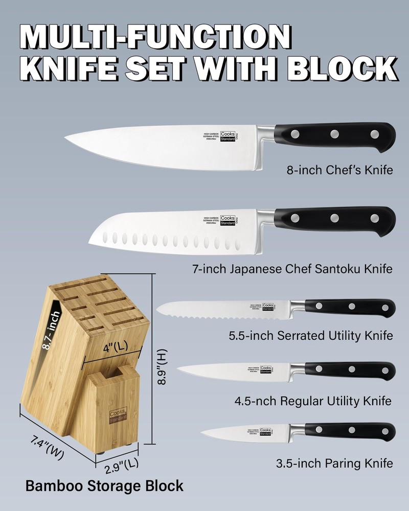 The 6-piece stainless steel knife set with Expandable block for extra slots includes: 8 inch Chef's Knife, 7 inch Santoku Knife, 5.5 inch Serrated Utility Knife, 4.5 inch Utility Knife, 3.5 inch Paring Knife, and an Expandable block. Blade material is German engineered and made of stainless steel that provides strength and balance. Blades are sharp, stain resistant, and releases food easily. Full tang construction with 3 rivets provides durability. Handles are ergonomically designed for Comfort and polished for hygienic benefit. 9 slot block for storage is Expandable and holds wide and long knives. Not dishwasher safe, hand wash and dry immediately. German High Carbon Steel Knife: Our knife set is professionally forged from high-carbon German stainless steel, ensuring excellent sharpness, high hardness, durability, and corrosion resistance Excellent Sharpness: Our blades are finely honed to create razor-sharp edges; Whether slicing or chopping, you will experience the exceptional cutting performance our knives bring to your cooking tasks Triple Rivet Ergonomic Handle: Designed with user comfort in mind, the ergonomic handle has a triple rivet design; This provides a safe and balanced grip while also enhancing the tool's overall durability Nine-Slot Knife Block: Designed with nine slots, the block has a stable pine wood inner layer and a durable outer layer, with a natural texture and unique beauty Durable and Safe: The knife block is equipped with four safety feet, providing a stable and secure base for your countertop, preventing scratches and damage
