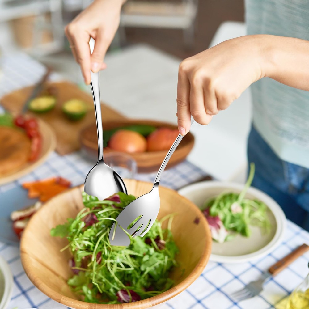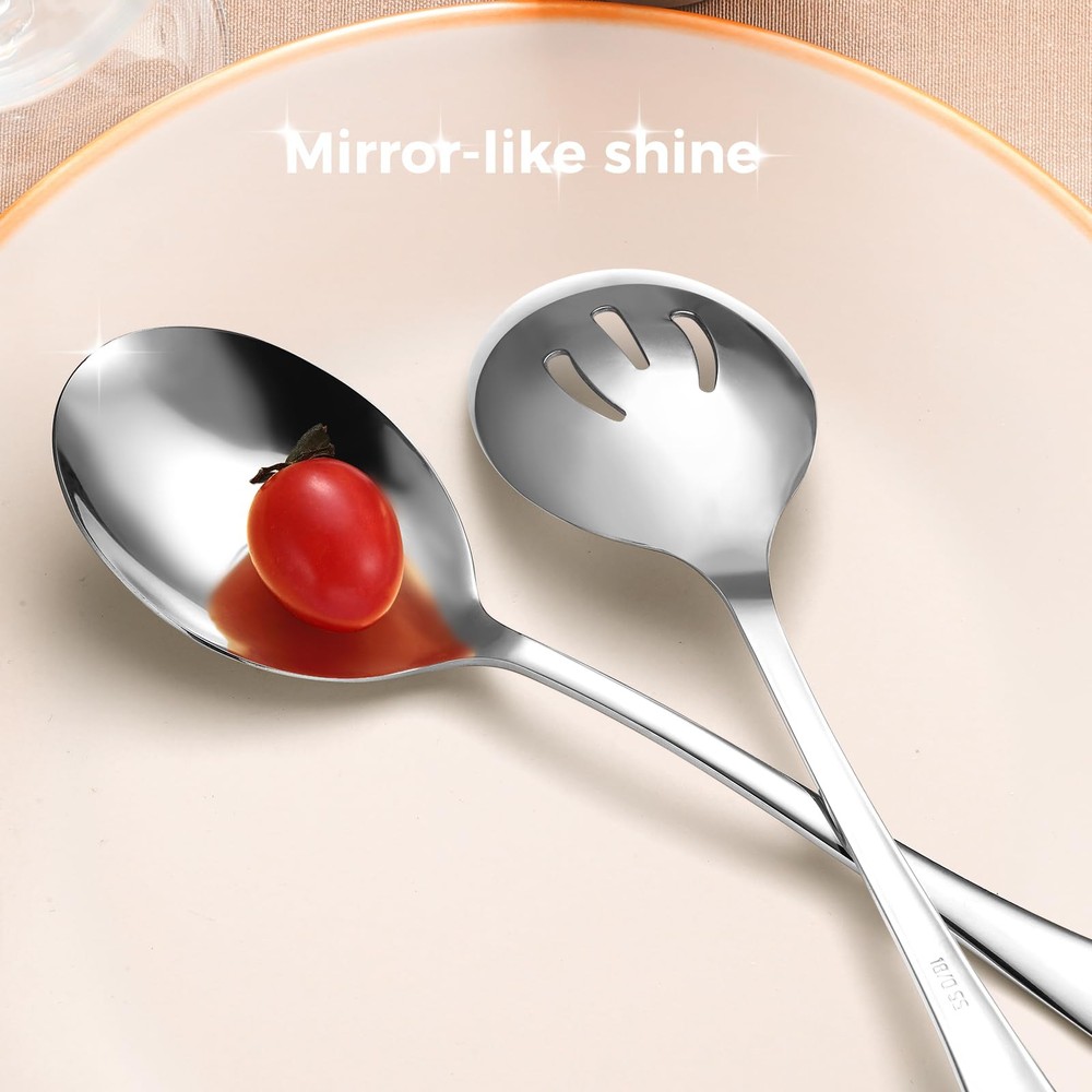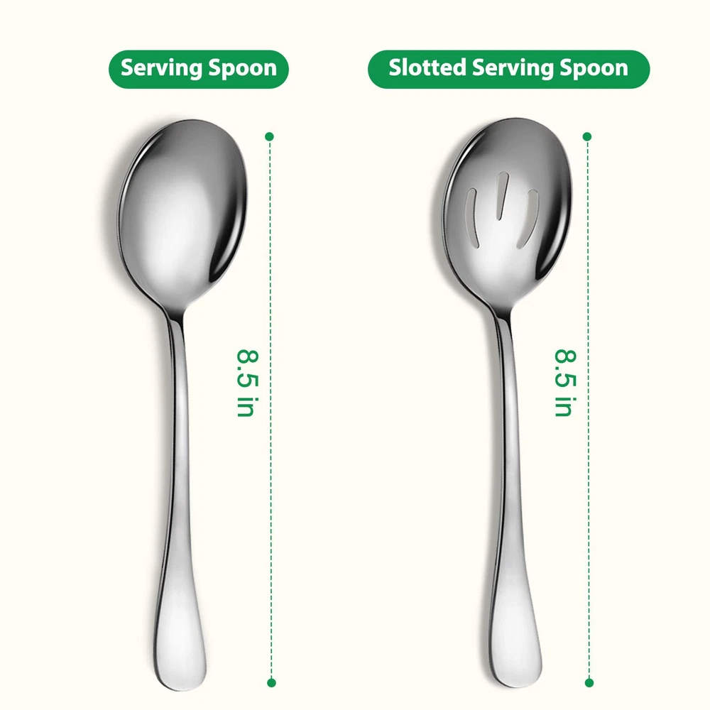 【Serving Spoon Set of 6】In this pretty serving spoon set you will get 3 x 8.5-inch serving spoons, 3x 8.5-inch slotted spoons. 【Sturdy Stainless Steel 】This product is made from food grade stainless steel which is reusable . The metal layer adopts vacuum plating technology to let you and your family away from the worries of peeling paint and discoloration. 【Suitable Size】This product is suitable size, perfect for portioning out from smaller containers, easy to use,easy to handle 【Well-Made】Our product has a smooth mirror finish with a satin sheen. Sturdy but not bulky, non-hazardous Stainless Steel for long-term healthy use. 【Dishwasher Friendly】This product is easy to clean, dishwasher safe and hand washable, perfect for every important gathering occasion, such as picnics, graduation parties, weddings, anniversaries, buffets, and family gatherings.