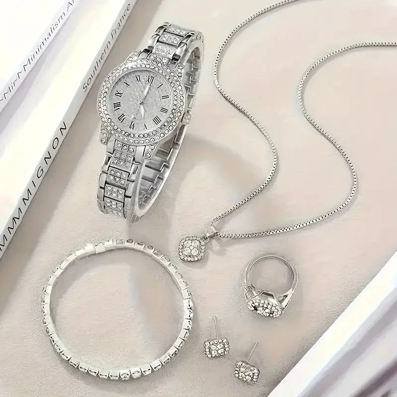 Title 6-Pieces: Elegant Women's Jewelry Set with Quartz Roman Numerals Watch PRODUCT DESCRIPTION Discover the perfect blend of sophistication and versatility with our 6-Pieces: Elegant Women's Jewelry Set with Quartz Roman Numerals Watch. Expertly crafted from high-quality zinc alloy, this stunning set features sparkling rhinestone embellishments that add a touch of glamour to any outfit. At the heart of this collection is a luxurious Quartz watch with classic Roman numerals, offering a timeless and refined aesthetic. Its simple yet elegant design makes it an ideal accessory for both everyday wear and special occasions. The watch's precise quartz movement ensures reliable timekeeping, combining style with functionality. This versatile 6-piece set includes complementary jewelry pieces that perfectly match the watch, allowing you to elevate your look effortlessly. Whether you're dressing up for a formal event or adding a chic touch to your casual attire, this set provides the perfect finishing touch. Premium Materials: Zinc alloy construction with dazzling rhinestone accents Elegant Style: Classic Roman numerals on the watch face Complete Set: Six beautifully coordinated jewelry pieces Timeless Design: Suitable for any occasion, from daily wear to special events Perfect Gift: An ideal present for loved ones or a luxurious treat for yourself Elevate your jewelry collection today with this exquisite set and make a statement that reflects your timeless fashion sense. Don't miss out—add this elegant 6-Pieces Women's Jewelry Set to your cart now! Powered by