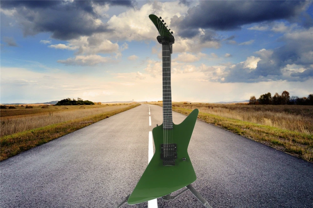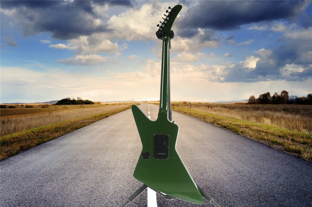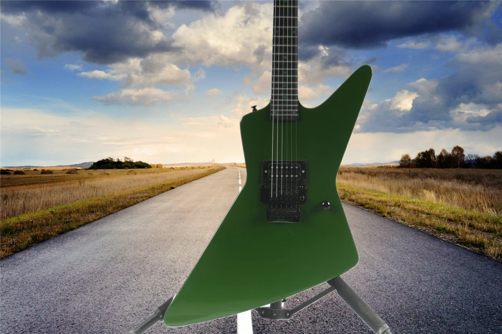 Solid Mahogany Body and Neck Rosewood Fretboard H-Pickups 6-Strings Electric Guitar This is an Explorer style electric guitar, belonging to the classic alien guitar style of hard rock/heavy metal/fast play, with a tough and highly recognizable shape. Guitar Appearance and Details Body: Classic asymmetrical pointed shape (Explorer iconic design), with a glossy army green/olive green paint finish, strong luster, and a hardcore and unique style. Head: Black spike shaped head, paired with black string buttons, forming a "all black hardcore" color scheme with the black hardware of the body, with a tough texture. Pickup: Equipped with a dual coil Humbuck (H configuration), it can output high gain, heavy, and highly penetrating sound, which is standard for metal and hard rock. Qinqiao: Floyd Rose Double Shake System, which can achieve techniques such as large-scale shaking and string pushing, greatly enhancing the expressive power of fast and high distortion playing. Fingerboard: Ebony fingerboard, inlaid with circular dots, simple and practical, comfortable to grip. Hardware: All black metal accessories such as bridge, string code, and pickup frame, combined with the green body to form a "black green" hardcore color scheme, with a wild style. Style and purpose Explorer is a classic irregular guitar style in the history of electric guitars, known for its heavy tone, long sustain, and unique design. It is widely used in styles such as hard rock, heavy metal, rush metal, and fast play, and is the "iconic weapon" of many heavy guitarists. The bright green paint finish and classic Explorer design of this piano not only attract attention in appearance, but also meet heavy playing needs such as high distortion, fast play, and handle skills. It is a "metal weapon" that combines appearance and strength. Note: The quality will be as shown in the photos. But as with any wood product, no two pieces are identical, grain patterns and color will vary. The pictures are taken by our factory staff, There may be color aberrations due to light. Shipping Policy Local transportation from the United States will be shipped to you quickly by Fedex or UPS. For products shipped from China, we will set a longer processing time to facilitate customized items. Tracking number provided with every order. [INTERNATIONAL CUSTOMERS] Please Note That International Custom & Duty Charges ( VAT Etc ) Are Not Included In The Item Price Or Shipment Charges. These charges are the buyer's responsibility. We provide an invoice with a very low value, allowing you to pay little or no customs duties. Please consult your local customs before purchasing our products. Return policy Returns within 30 days are supported. If there is any problem with the goods, please contact me as soon as possible, and I will communicate with you immediately to solve it. If our product is not damaged and there is no delivery error, the buyer issues a return refund, the buyer must pay the return fee, and we will not pay the return fee. Refunds are only applicable to defective products reported within 7 days of receipt, after which they can only be replaced. Replace Shipping costs are non-refundable. If there is any problem with our product, the buyer needs to take a photo and send it to us in time, and the item must be returned to us before we can refund or replace it. For any situation or parts problem that you can solve by yourself, you can negotiate with us at the first time to refund the difference or reissue parts.