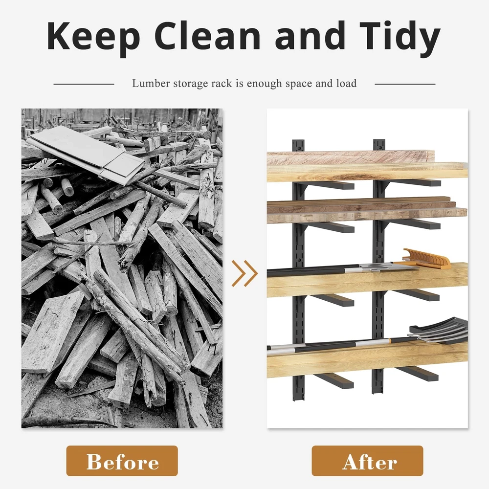 Wall Mount Wood Rack Organizer 【Disassemble & Adjust Different Hight】Wood organizer rack can adjust the different hight according your wall's space. Meanwhile, it is detachable to install separately one by one. The package will include six detachable racks. 【Premium Heavy Duty Material】Wood storage racks made of heavy duty scratch resistant steel, each layer holds up to 100 lbs. It is easily store items with the durable rack. 【Easy to Install】The package includes the installation manual that you can install it step by step with electric drill (Excluding electric drill). This wood rack is easy to install on the wall of your garage or workshop. 【Space Saving】On the wall of garage & workshop, lumber rack can maximize your space and eliminate garage room clutter with wood storage racks, keeping your space clean and tidy. 【Perfect Storage Rack】Wood rack is compact & strong storage solution for lumber, firewood, ladders, skis, snowboards, golf clubs, garden tools, rugs, and so on. It creates more space in your house, garage, basement, shed or workplace.