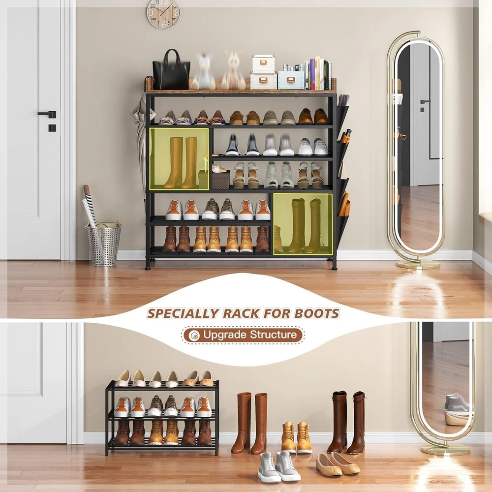 Product Description About this item • [Entryway Shoe Rack That Saves Space at The Entrance] Are all your shoes piled up in the corridor? This wooden shoe rack is 39.4"W x 11.9"D x 41.4"H. Metal shoe rack can hold up to 22 pairs of shoes, maximizing your small storage space and avoiding messy hanging of shoes at your entrance. Shoe racks is very suitable for limited entrances, corridors, porches, closets, mud rooms, living rooms, bedrooms, apartments and dormitories. • [Sturdy Metal Shoe Rack] Compared with other entrance shoe racks, our industrial shoes rack storage organizer is made of metal grid frame and wooden board, which is more sturdy and durable. Therefore, no matter what condition our rustic shoe rack is in, you don't have to worry about its bearing problem. Four adjustable feet keep balance on uneven ground and protect the floor from scratches. • [Thoughtful in Details Shoe Rack Closet] The wooden top of the shoe rack provides an ideal place for your bags, hats, keys or decorations. The raised edge can prevent your glass vases and ceramic artworks from falling. The shoe closet is equipped with 2 high grids (13.9 inches), which can hold your high boots and rubber boots. There are 4 rows of hanging side pockets, allowing you to store items such as slippers, wallets, shoe covers, umbrellas, sock bags and more. • [Adjustable Black Shoe Rack] The height of our heavy duty shoe rack can be adjusted. If you have many boots at home, you can detach the two of the layers so that you have more space for boots. • [Easy Assembly ] Easily set up this freestanding shoe rack. With a simple structure and detailed instructions, you can assemble this freestanding shoe rack immediately and begin the great "shoe cleaning"! Sturdy Metal Shelves Enhomee Entryway Shoe Rack with Large Storage Space Metal Shoe Rack for Entryway, gives "shoes" a home, bring home warmth. On Aug 11, 2025 at 18:55:07 PDT, seller added the following information: