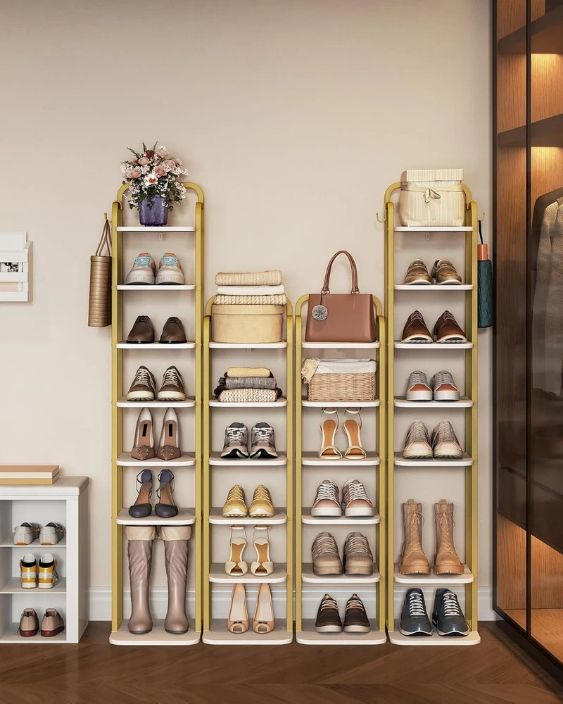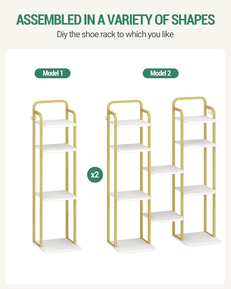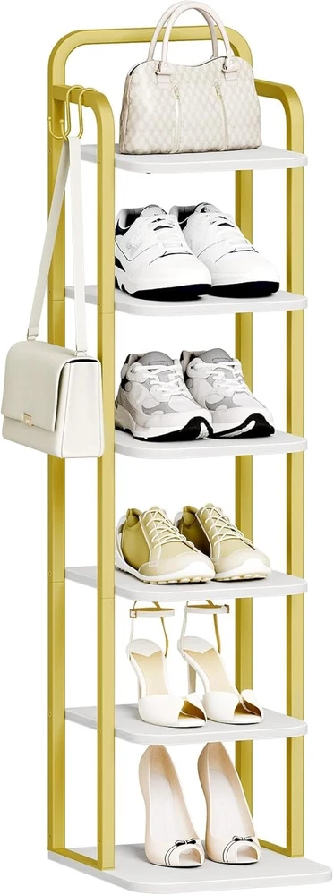 This shoe rack is a game-changer for small spaces! It fits perfectly in tight spots while holding plenty of shoes vertically. Love that it's adjustable and the extra hooks are super handy for keys or bags. Sturdy yet lightweight, and looks great as a plant stand too. So versatile—saves so much floor space while keeping everything organized. Highly recommend!