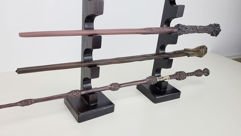 About item ELEGANT DISPLAY - The way this wand stand displays provides an amazing decoration for your home or office SOLID & STURDY - Made of high quality solid wood, with big base, it's very stable to hold 6 wands MULTI-PURPOSE STAND - Comes with 2 separated parts, it perfectly fit long or short wands and swords SIZE MATTERS - Measuring 2.5"x2.5"x12.5", holes size 1", compact and nicely display your wands Amazing Gift Idea for Wands Enthusiast. Material: Pine Wood with dark finish. Wands not included