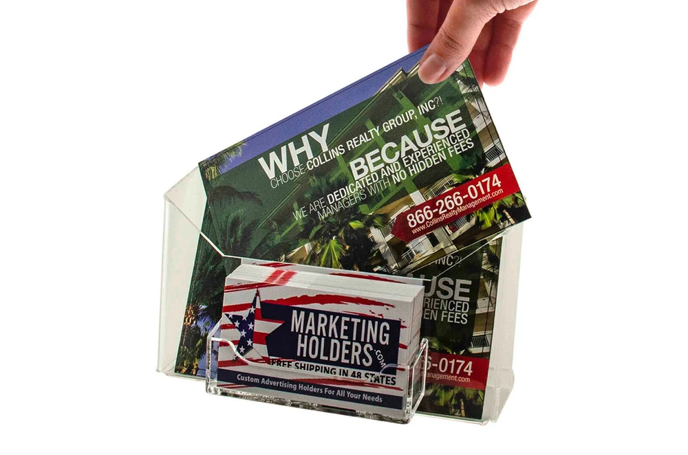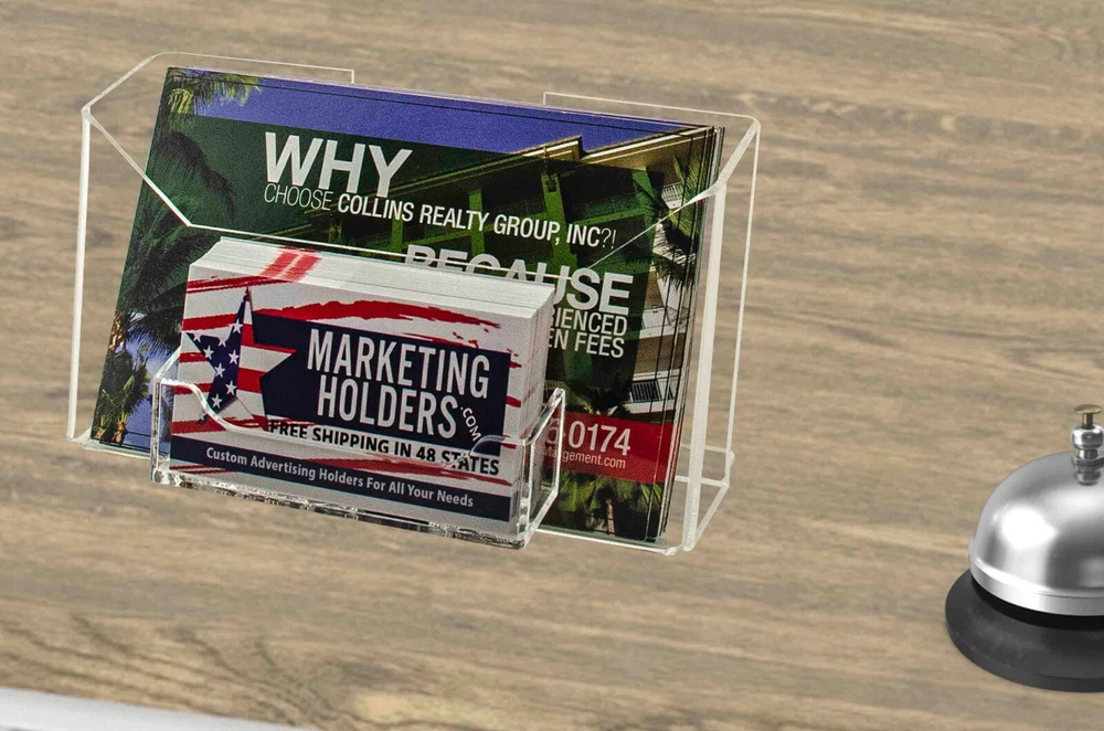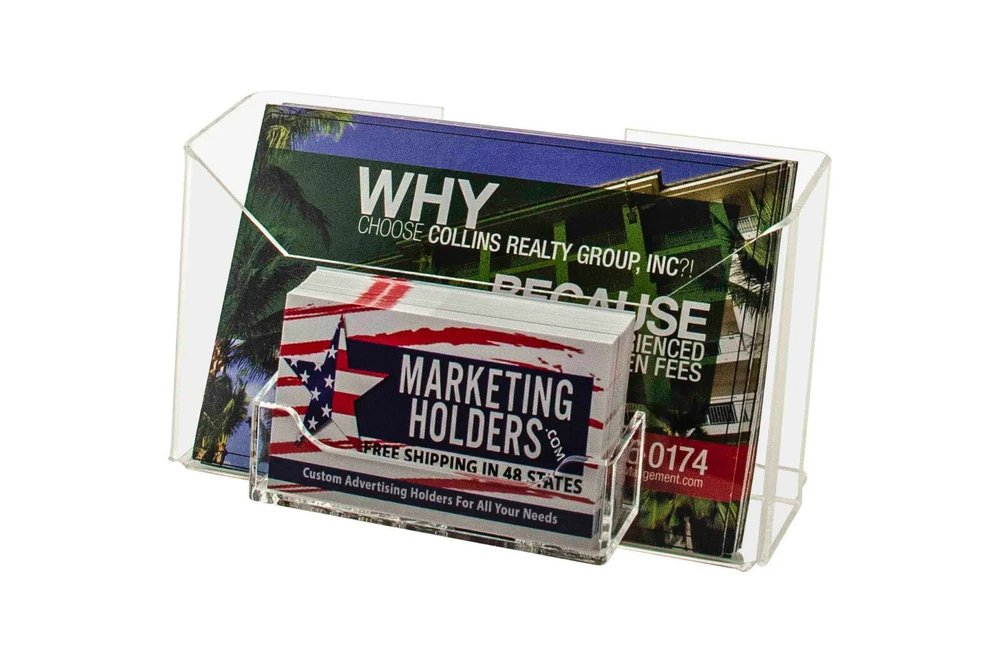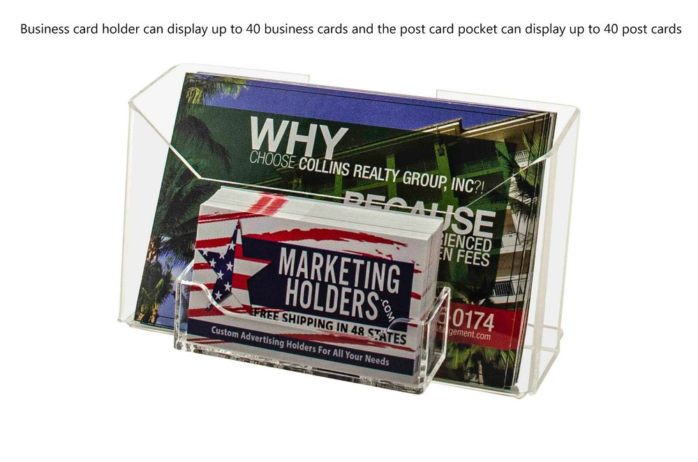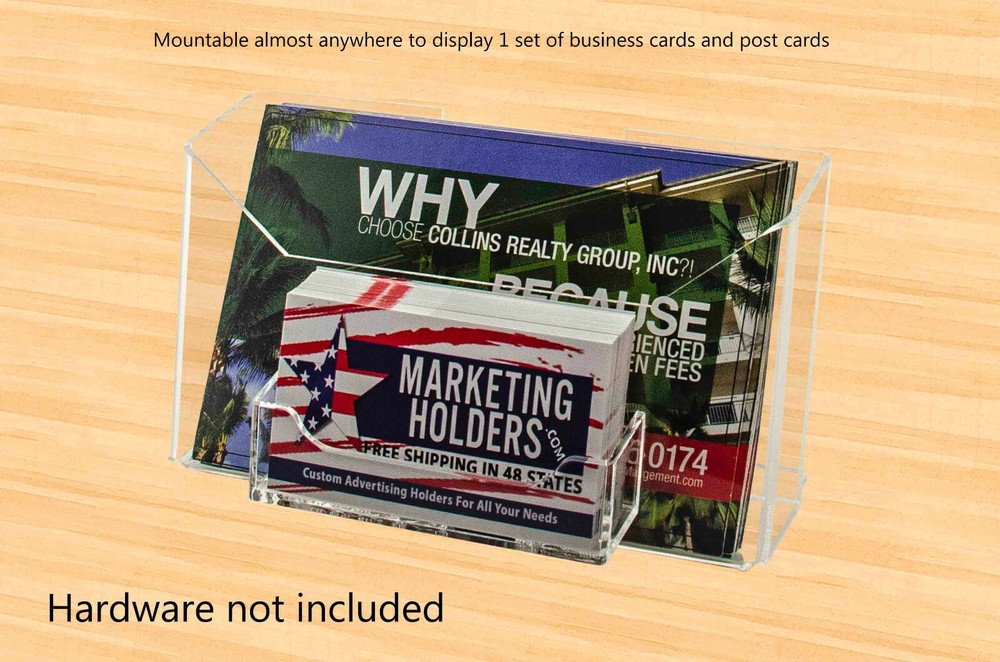 6 Pack Booklet Organizer for 6"W Materials with Business Card Pocket Product Features: Holds 6"W postcards and standard 3.5"W business or gift cards Business Card Pocket Dimensions: 3.5”W x .75”D x 2"H Postcard Pocket Dimensions: 6.5”W x 1.5”D Overall Dimensions: 6.75"W x 3"D x 4"H Multi pocket countertop or wall mount display for postcards, index cards, horizontal recipe, prayer cards and business cards Proudly made with premium high quality materials Marketing Holders literature holder provides a simple yet effective tabletop or hanging display for promotional literature, postcards, index cards, horizontal recipe and prayer cards. Many businesses find these marketing aids useful to spread the word about their upcoming promotions, products, services and events. These heavy duty stands can be used on flat surfaces such as tops of a table, counter or desk near entrances and exits or reception areas so customers are prompted to take one when visiting your business. In addition to brochures, the acrylic caddy has a business card pocket that can also be used to display other small media like Security Gate Code Cards, Membership Cards, Appointment Cards, VIP Cards, ID Badges, Security Cards or Gift Cards. This holder comes with 2 pre-drilled keyholes and is designed to easily hang on smooth surfaces if counter space is limited. Elegantly showcase attraction pamphlets or menus while saving space and keeping areas looking professional, clutter free and organized. These multi use bins are versatile and can be used to store a variety of other items. These flyer displays are suitable for any location where information is exchanged or gathered. These display bins are ideal for placement in doctor offices, hotels, motels, amusement parks, government and business buildings, community centers, or travel agencies. This holder is durable for use at colleges and universities, convention centers, restaurants, sports stadiums or museums. Made of clear see through materials, this economical display stand is a great addition in high-traffic areas where you want to display and provide your promotional literature for the taking. This literature holder is the perfect solution to display your advertising materials in a crowded or small location where there is limited space. *All sizes are approximate **Hanging Hardware Included ***Under no circumstances is Marketing Holders responsible for any actions involving hanging products using self purchased or provided hardware. It is up to the purchaser to make sure they are using the hanging hardware correctly. We will also not be responsible for the product if it cracks during the hanging process or if it falls and breaks. Return Policy 30 Day Return Policy: By purchasing our product you are agreeing to our return policy, so please read! Perfect returns (NO used merchandise) on stock items are accepted within 30 days of delivery. Any visual appearance that the product is used will result in 00 refund. All returns are subject to a 20% inspection, re-boxing and restocking fee. All returns must be repacked and returned in their original packaging for protection. (MUST return on pallet if received on Pallet) Packages being returned should be insured by you for your protection No credits are issued on shipping costs. Absolutely no returns accepted on custom order displays, including orders with custom text, imprinting or graphics
