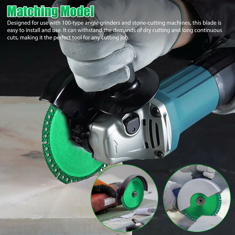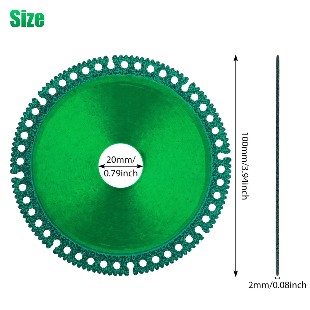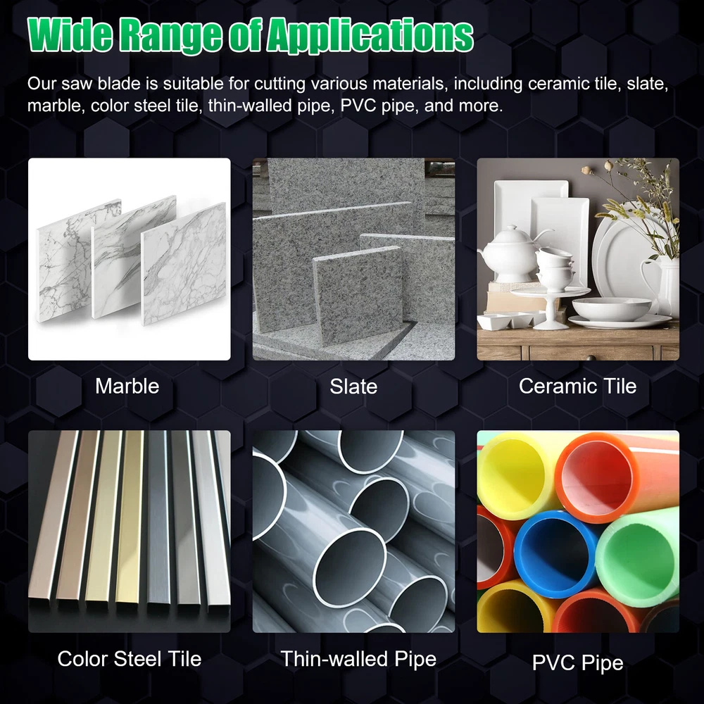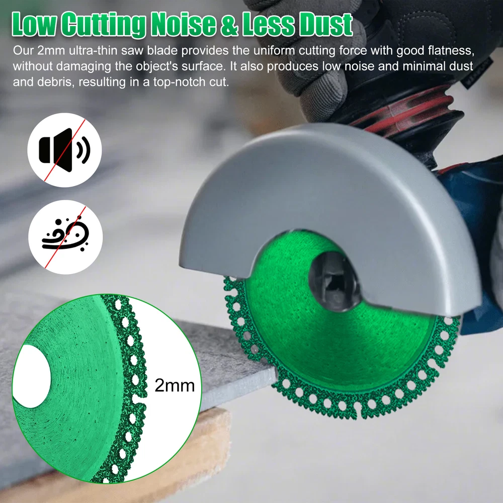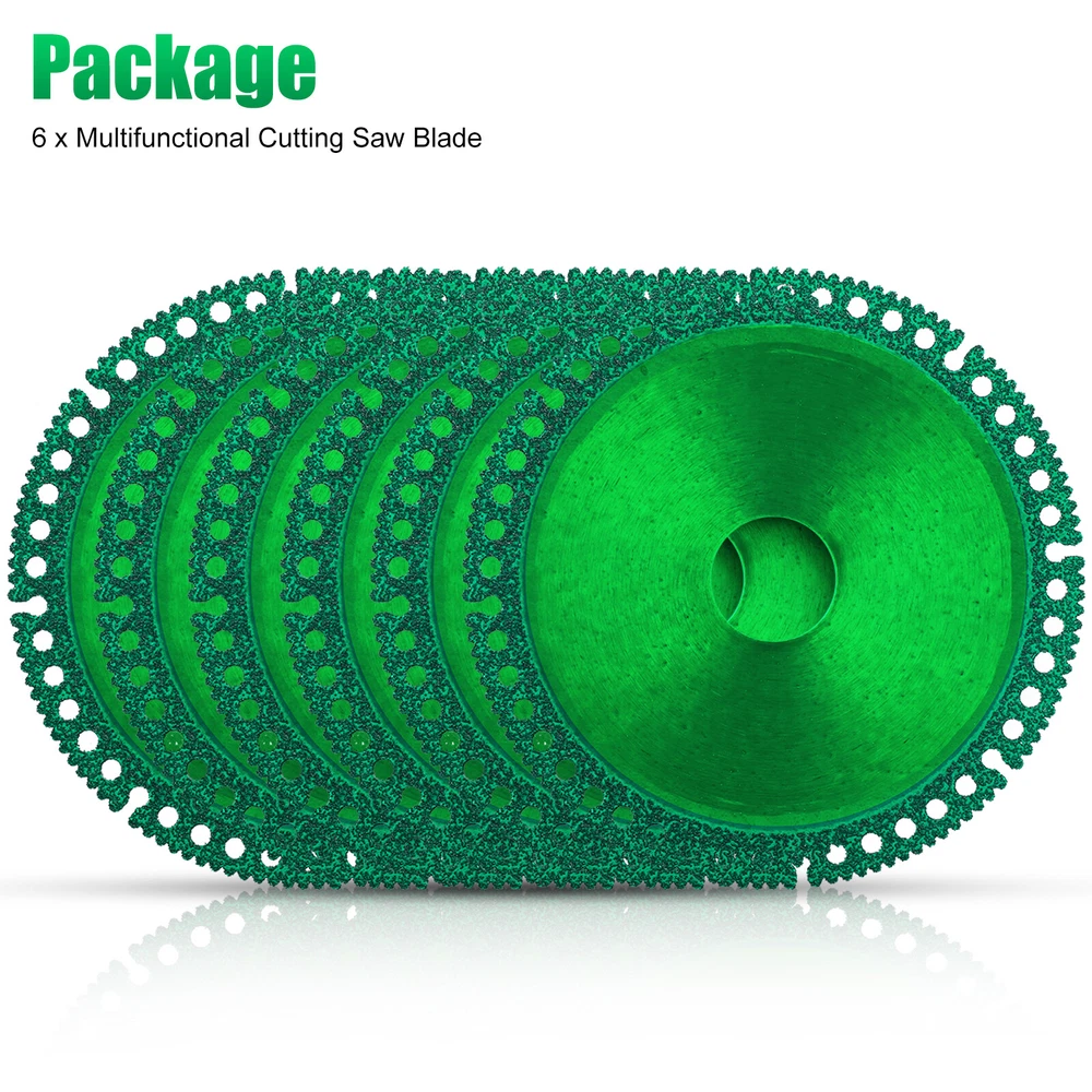 Product Feature ✨ Fast, Precise Cuts: Our saw blade is designed to deliver straighter, faster cuts with reduced vibration. Its sharp and durable one-piece construction allows for multi-purpose use, making it resistant to wear. ✨ Low Cutting Noise & Less Dust: Our 2mm ultra-thin saw blade provides the uniform cutting force with good flatness, without damaging the object's surface. It also produces low noise and minimal dust and debris, resulting in a top-notch cut. ✨ High-quality Material: Our saw blade is made of diamond high manganese steel matrix with a new brazing process, ensuring no deformation or cracking. It's also safer to use and eliminates the need for frequent blade replacements, saving you time and improving production efficiency. ✨ Matching Model: Designed for use with 100-type angle grinders and stone-cutting machines, this blade is easy to install and use. It can withstand the demands of dry cutting and long continuous cuts, making it the perfect tool for any cutting job. ✨ Wide Range Of Applications: Our saw blade is suitable for cutting various materials, including ceramic tile, slate, marble, color steel tile, thin-walled pipe, PVC pipe, and more. Product Specification Type Composite Multifunctional Cutting Saw Blade Material Diamond + High manganese steel matrix Color Green Thickness 2 (mm) Inner diameter 20 (mm) Outer diameter 100 (mm) Qty 6Pcs Features Fast, Precise Cuts,Low Cutting Noise & Less Dust. Applications For cutting various materials,including ceramic tile, slate, marble, color steel tile, thin-walled pipe, PVC pipe, and more. Package Included 🎁 6 x Multifunctional Cutting Saw Blade Location Descriptions To improve your buying experience and ensure fast delivery, Your order will be shipped from the warehouse located in either new jersey or california that is closest to your address. If you have any questions, Please contact us. Thank you for your support !