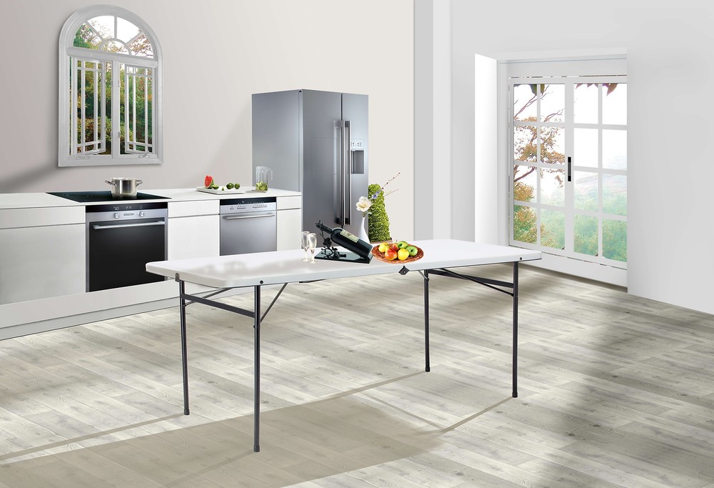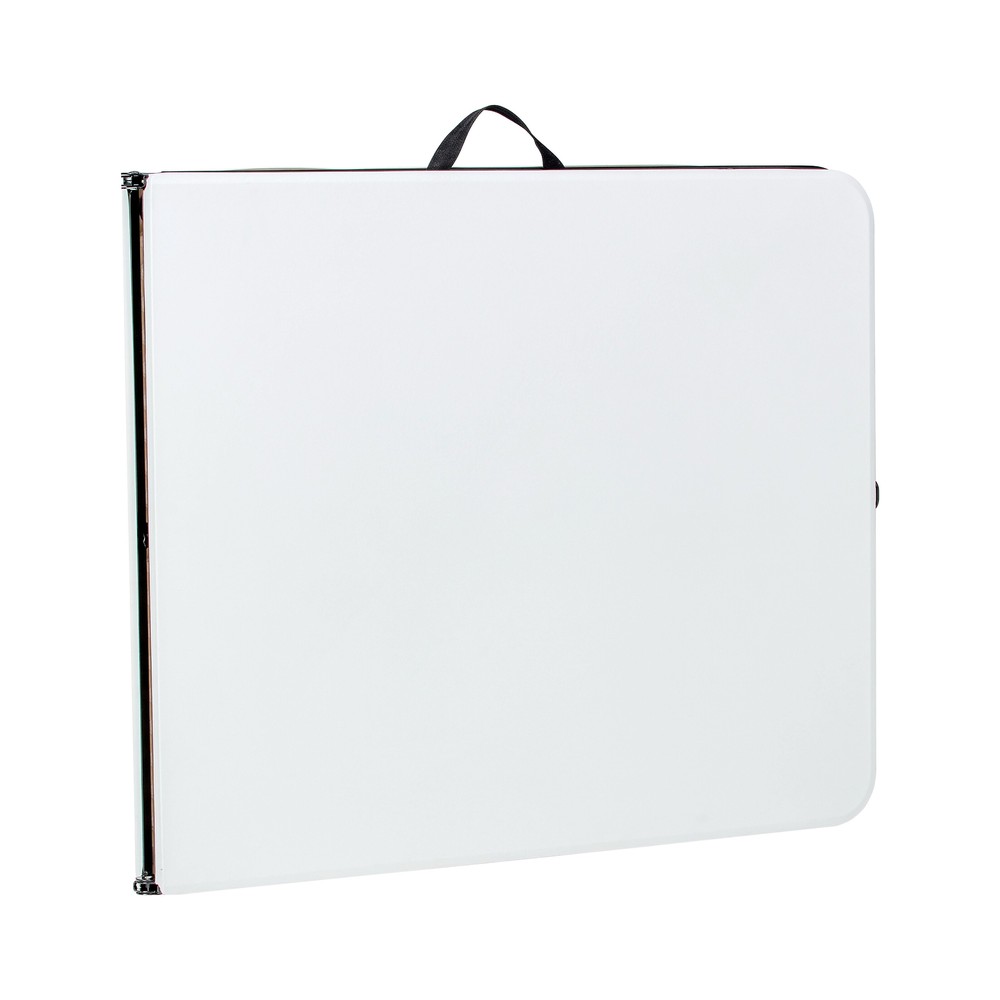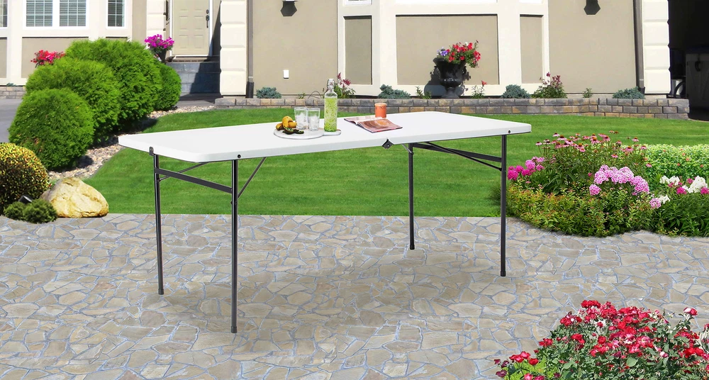 Mainstays 6-Foot Fold-in-Half Folding Table – White Plastic Table with Carry Handle, Indoor/Outdoor Use Add convenience and functionality to any setting with this 72" Mainstays fold-in-half table. Designed for both indoor and outdoor use, it offers a spacious surface, easy portability, and a clean, modern look—perfect for events, gatherings, or everyday use. Key Features: Large Surface Area: 72" L x 30" W tabletop comfortably seats up to 8 adults—ideal for meals, crafts, or displays Fold-in-Half Design: Legs fold in, and the table folds in half for compact storage and easy transport Durable Construction: Made from strong, powder-coated steel and a resin top that resists wear, water, and stains Built-in Carry Handle: Integrated handle allows for easy transportation—great for on-the-go use Rubber Leg Caps: Provide extra grip and protect floor surfaces from scratches Classic White Finish: Neutral color fits effortlessly into any event décor Easy Maintenance: Simply wipe clean with a damp cloth Perfect For: Indoor/outdoor dining Crafting and workstations Tailgating, BBQs, parties, and school functions Garage sales, displays, and more Specifications: Dimensions (Open): 72" W x 30" D x 29" H Seating Capacity: Up to 8 adults Includes: 1 × Folding Table Material: Resin top with powder-coated metal frame Color: White A versatile and portable solution for any occasion—durable, lightweight, and ready when you are.