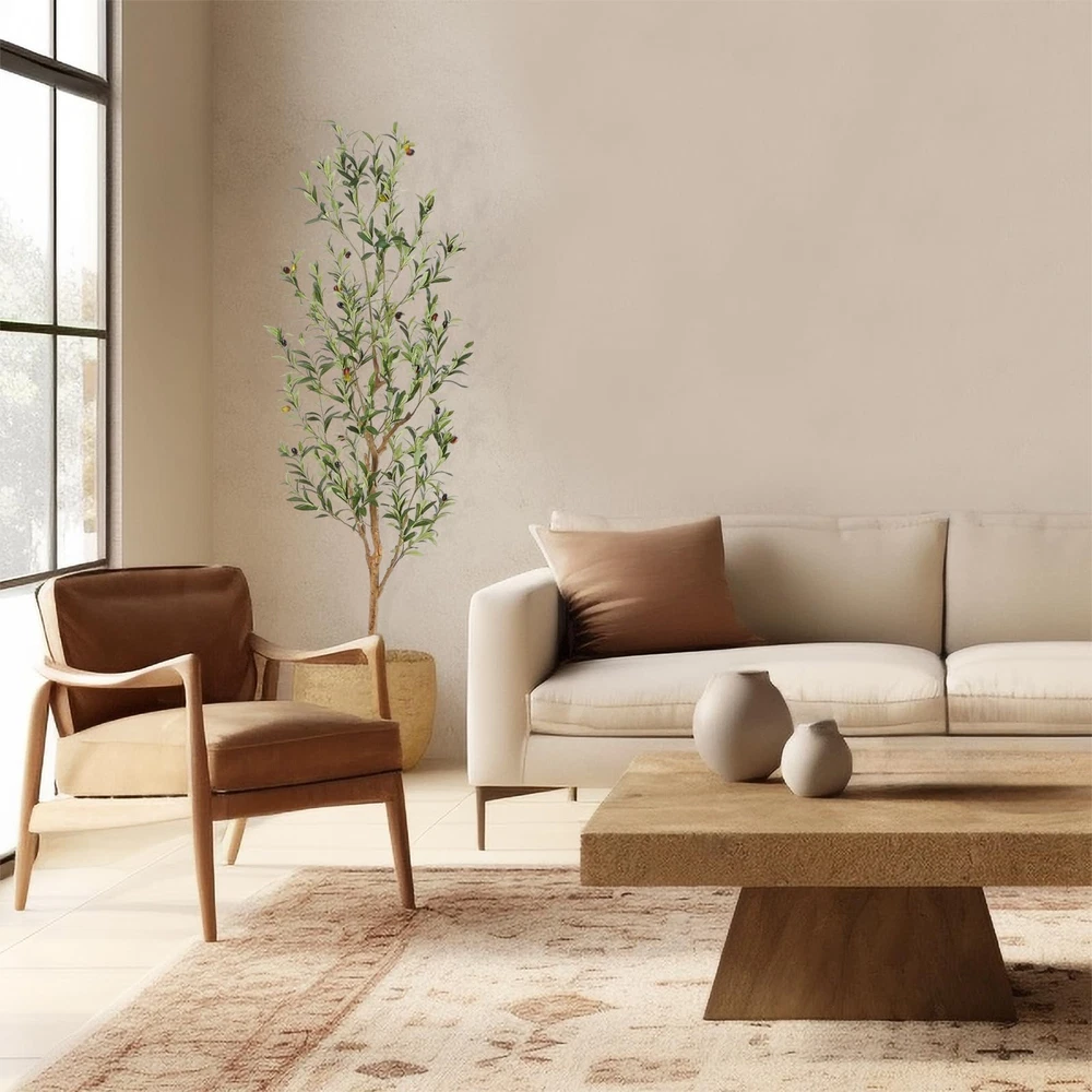 Lifelike tall faux plants: Our faux olive trees are made of natural wood trunk, silk leaves,6 colors of fruits, and long stem which make the tree have a realistic look and airy feel. A touch of natural elements will make your environment more comfortable and trendy. Easy Maintenance: Our artificial olive tree don’t need water or light, which means that you can enjoy the beauty without spending too much time and effort to maintain them. You just need to treats its dust regularly. It stays in perfect condition forever. Great Decoration: Our fake olive tree can be used for various occasions, including offices, hotels, malls, homes, living room, bedroom, patio, dinning room, entry way, outdoor spaces. It’s perfect for filling empty corners and low light Areas. Easy to Assemble: Our faux olive tree 7 feet are easy to install, and you can shape the branches according to your preferences. The tree comes with a non-decorative pot, recommend you place this tree into a decorative pot, which will enhance the overall decorative effect. Modern Decoration: This faux olive tree's modern minimalist design adds style to any space, seamlessly blending with diverse decor styles. Ideal for indoor and outdoor settings, it infuses homes, offices, shops, patios, and gardens with a touch of vibrancy.