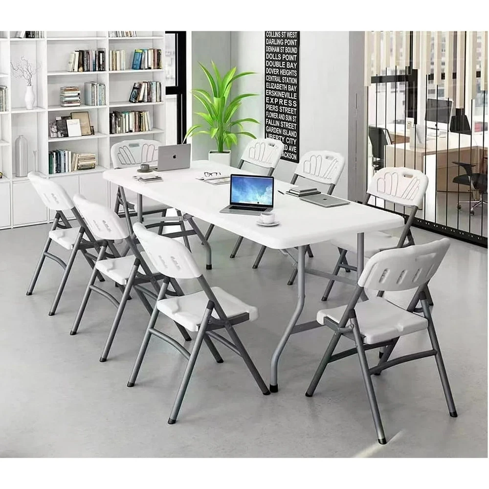 6 Foot Folding Table,Fold-in-Half Plastic Table, Picnic Party Dining Camp Tables 6 Foot Folding Table,Fold-in-Half Plastic Table,Indoor Outdoor Picnic Party Dining Camp Tables,White This big enough for almost any project, yet doesn't take up much floor space, and even old or child can easily set it up by themself. Multipurpose Table:It weights only 21.6 pounds lightweight makes it easy to move. This portable square table can be used as dining table, picnic table, party table, etc. Sturdy Construction:It is constructed of premium HDPE top and solid steel legs .The surface is waterproof, scratch and impact resistant which also can withstand up to 100 lbs, and includes non-marring foot caps to protect your floors from scratches. Stable Legs:The key to the outstanding stability is an arced tube welded between each pair of legs. These tubes plus the tight tolerances of the leg locking hardware eliminate any wobble for all practical purposes. Perfect Size:70.9 x 27.5 x 29.1 inches; it was a perfect size for the purpose and could easily be folded and stored,especially suitable for small space use. For any inquiries or issues, please feel free to contact our dedicated customer support team via the "Contact Seller" section. We are committed to providing you with the best possible service. We are always here to assist you! Note -We do not ship to warehouse addresses -We do not ship to island addresses -We do not ship to Po Box addresses