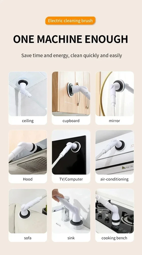 Features: 1. Powerful: Strong magnetic motor, high torque, non burning, high power. 2. Simple operation: Electric operation saves time and effort, freeing hands. 3. Humanized design: Scalable design, cleaning without bending down, making cleaning more convenient. 4. Multipurpose: Suitable for flooring, furniture, bathroom, kitchen, car, interior, etc. Specifications: Function: mopping/cleaning/washing dishes Product category: Cleaning brush Material: Plastic Package List: Electric cleaning brush * 1 Soft polishing head * 1 Velvet brush * 1 Toilet brush * 1 Large flat brush * 1 Small flat brush * 1
