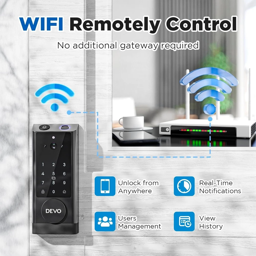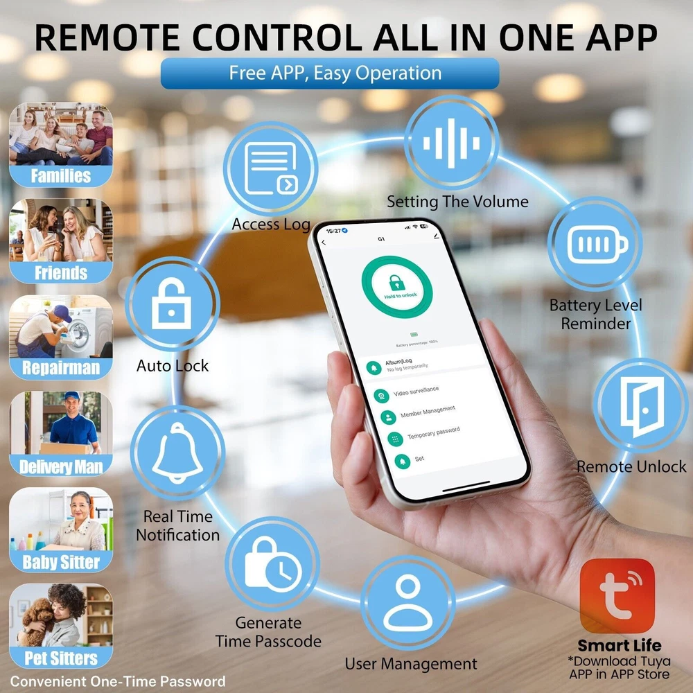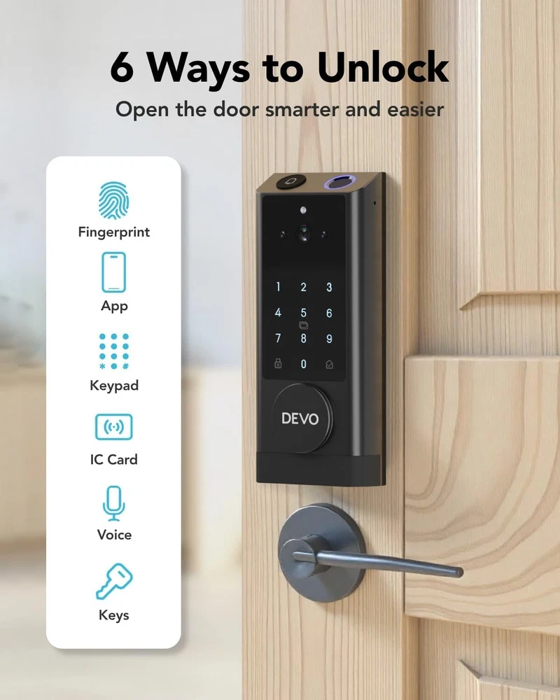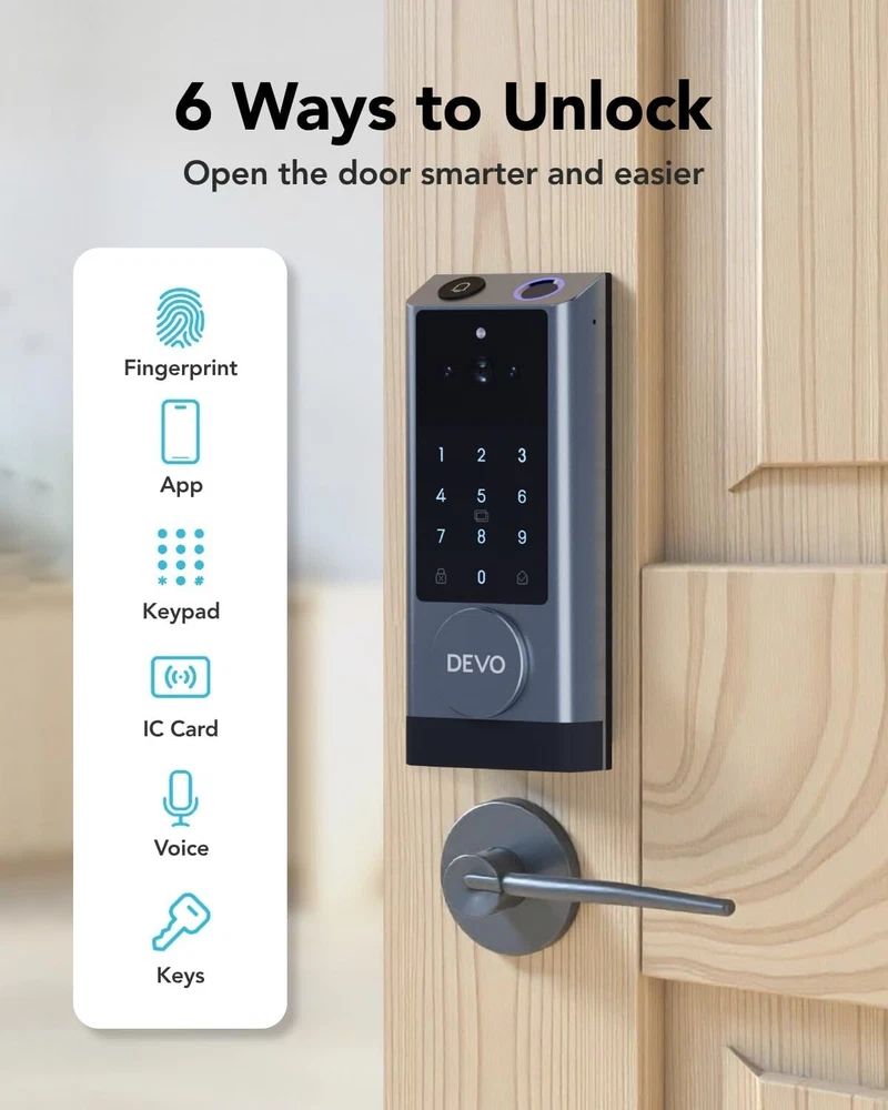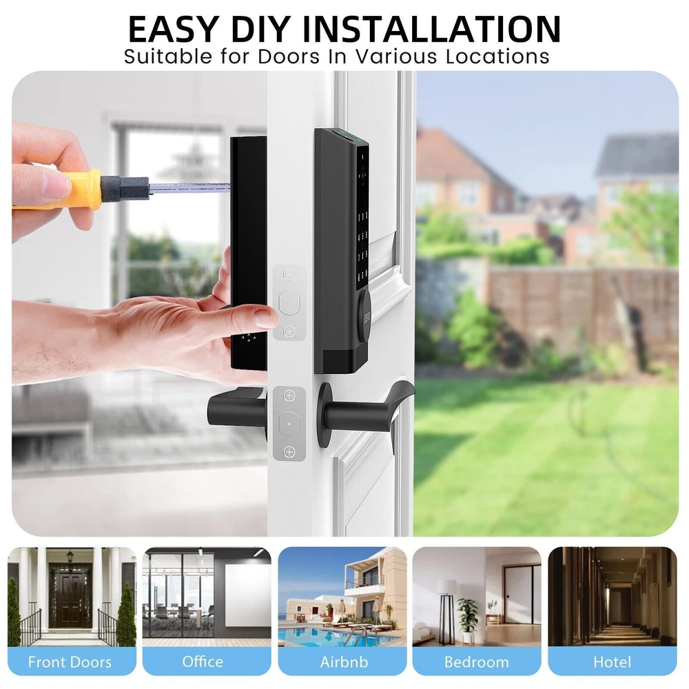 The 6-in-1 Upgraded Smart Lock is a keyless entry electronic lever door lock that allows you to program up to 30 user access codes that can be customized for family, friends or guests. It is easy to install, program and use, and it also features smart key security as a backup key slot. This entry lever can be locked or unlocked using a keypad or key on the outside and a rotary button on the inside. Combine the convenience of keyless entry with the highest residential security ratings and leading designs and finishes to enhance any door in your home. Perfect for a home office, storage room or interior garage door, the 6-in-1 Upgraded Smart Lock provides the right access solution to make your life more convenient, stylish and secure. Our smart locks are available in two styles - traditional and modern to match your home decor. In addition to this, our smart locks are available in three colors: Metallic Black, Premium Gray, Silver Gray. 【Wi-Fi Enabled】:6-in-1 Smart lock is a Wi-Fi-enabled door lock that connects directly to your home Wi-Fi network and smartphone for a secure smart home that does not require a third-party smart home hub, panel, or subscription 【APP Remote control】 Tuya APP, support Google Assistant, Amazon Alexa,Support remote unlocking and authorization, convenient for managing visitors or temporary users,Increase convenience.Receive notifications of your lock's activity and view the lock event history from your smartphone using the app for easy query and management 【Improve security】: Multiple unlocking methods (such as fingerprint, password, mobile phone App, etc.) Intercom, human body detection, automatic capture and upload to APP, automatic lock (timed anti-lock). Independent door Bell button, approach light reminder, automatic recognition of left and right door opening,reduce the safety hazards of traditional keys 【Multi-user management】: Support fingerprint, password or mobile phone authorization for multiple users, convenient for family members or employees,Switch between three entry modes: Multiple locking settings include ""Auto Lock"" (locks after every entry and exit), ""Passage"" (stays unlocked and no key or code required), and ""Disable Passage"" (for property managers, auto-locks every time and a key or code is always required for entry). 【SecureScreen&Digit Keypad&】Patented security feature for touchscreen deadbolts that prevents on-screen fingerprint user code identification by employing random digits prior to entering a personal user code,eypad deadbolt is backlit and comes with a dedicated one-touch locking button for keyless convenience"