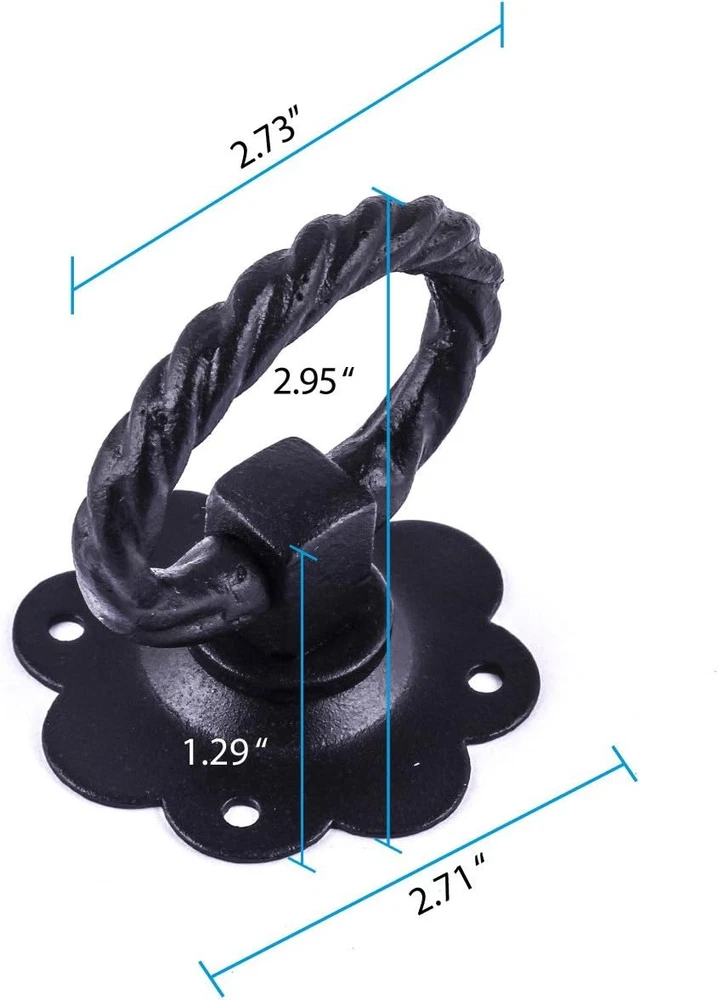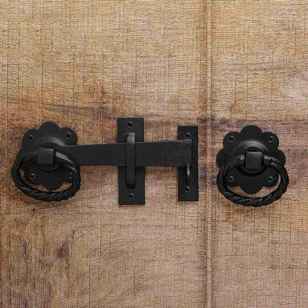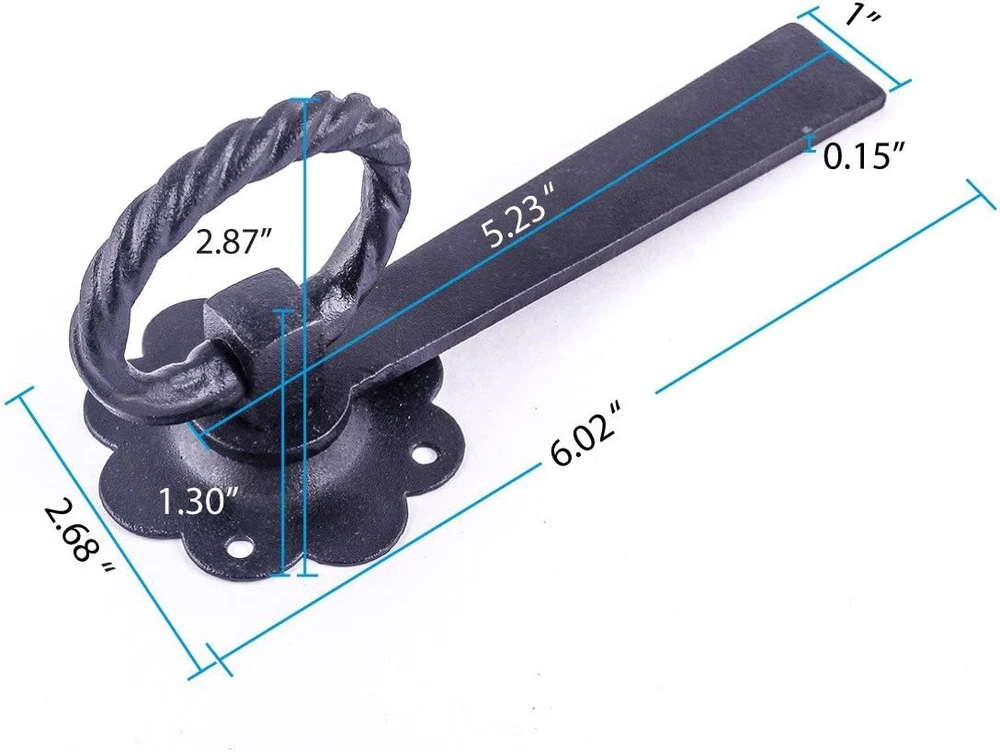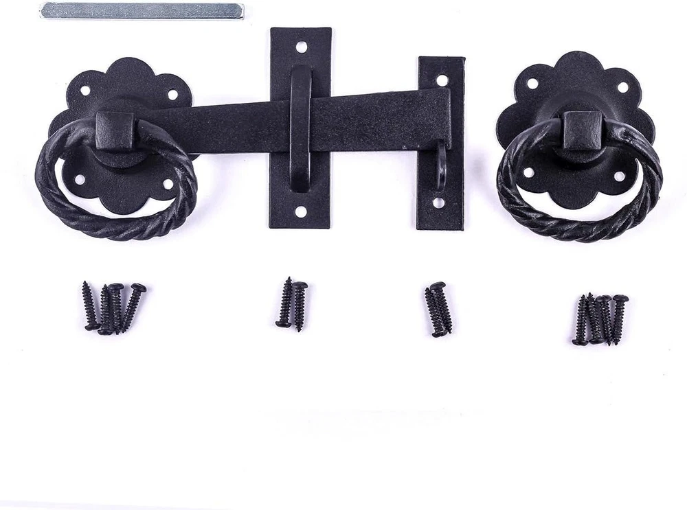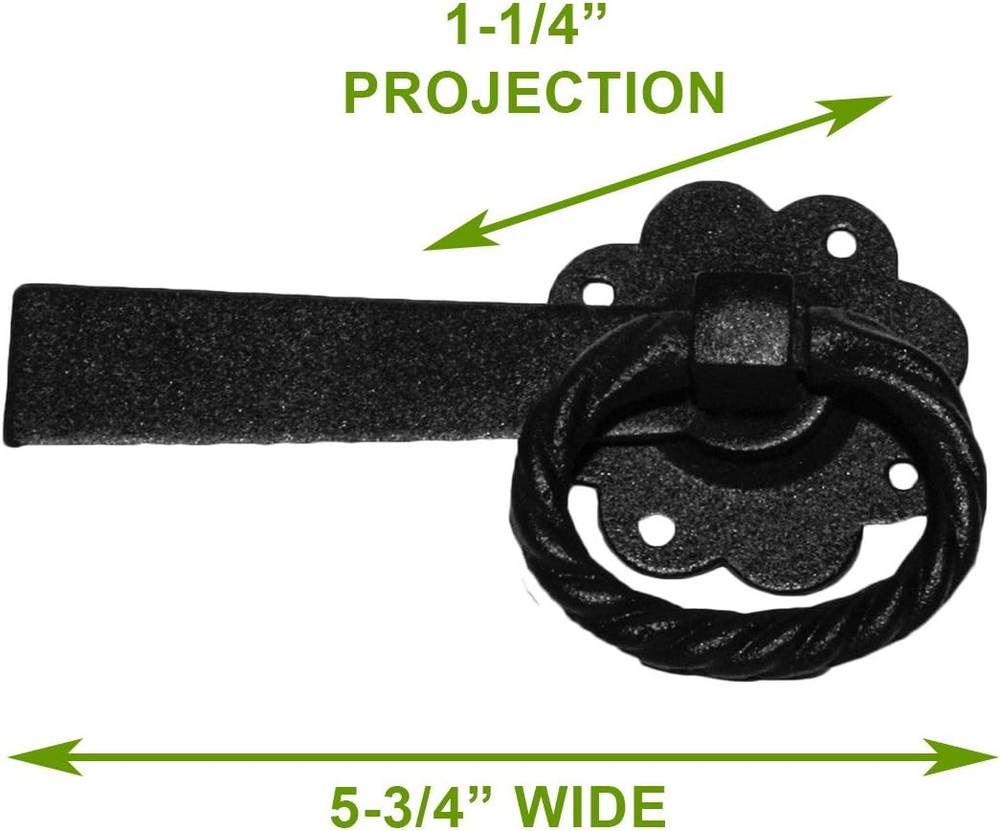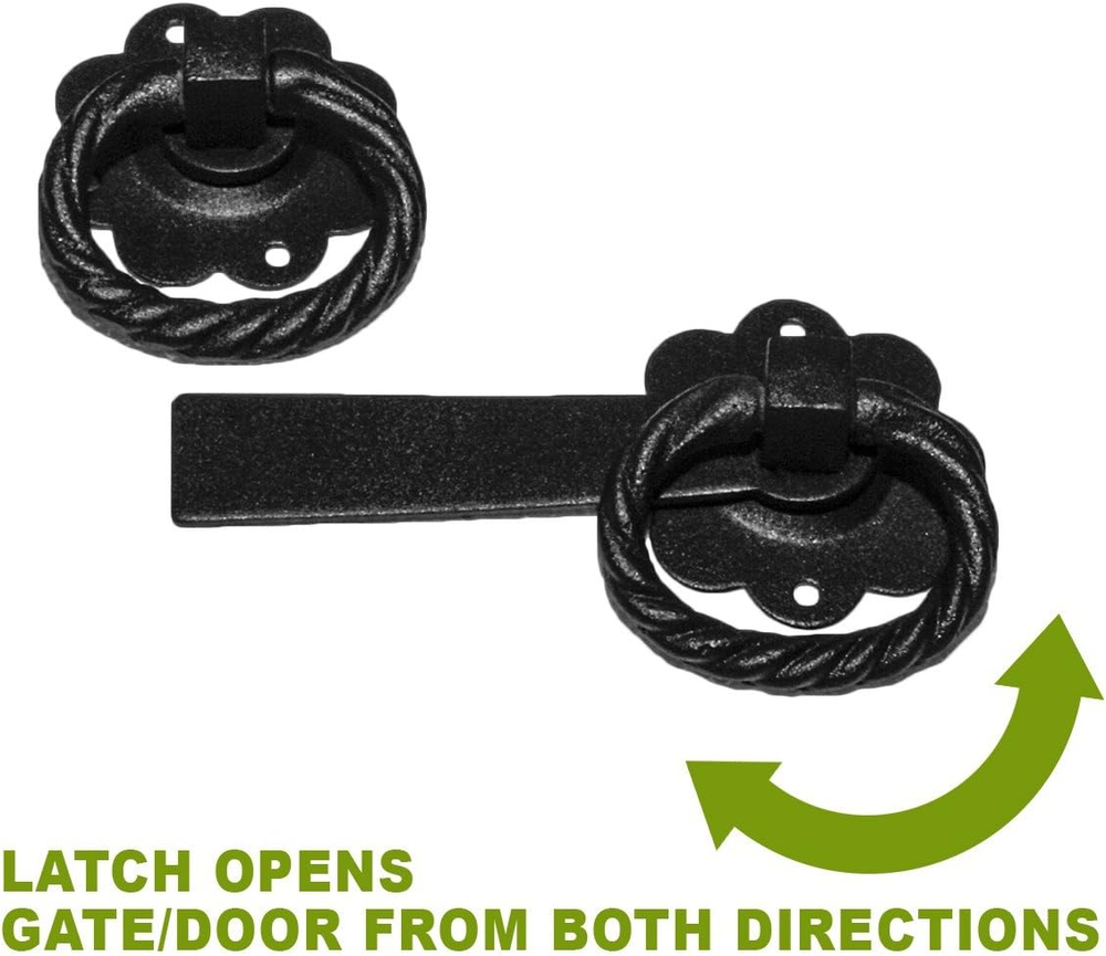 DURABLE MATERIAL - This Floral black barn door gate latch is made of wrought iron material and spindle bar is of steel. Recommend indoor use or apply protective coating for outdoor use. MEASUREMENTS - The Latchbar length = 6 Inches, Projection = 2.9 Inches, Spindle Bar = 2.75 Inches. Opens/Closes = Both the direction, Left or Right! PACK INCLUDES - Black pull ring drop with flip latch strap, single pull ring, a spindle bar, two Latch bar pieces and the mounting hardware. Included screws are intended for indoor use. EASY INSTALL - Place latch on gate, mark all screw holes, mark centre of ring drop, drill centre, insert spindle bar via central hole and connect it to both of the ring drops to function together, install latch using the given screws, and it's done! BUY WITH CONFIDENCE - These door flip Floral latches are carefully packed to avoid any damage in the transit process. We offer you great value products for your money and a perfect way to spend wisely. BLACK WROUGHT IRON DOOR GATE TURN FLORAL RING FLIP LATCHES The colonial door latch reproduction floral locks are sure to bring charm to your gates. FEATURES - Latch made of Wrought iron - Apply Protective Coating for Outdoor Use - Two-sided latch opens in both directions - left or right - Mounting Screws are included - Spindle bar is made of Mild steel - Affordably update old gates and doors - Overall measurement - 6" Length, 3.4" Width and 2.9" Proj. - Involves an easy installation INSTALLATION INSTRUCTION GUIDE 1. Place the latch on the gate where you wish to install it and mark its screw holes 2. Mark the centre of the flip latch's ring drop 3. Drill the centre hole all the way through the door wide enough to rotate the spindle bar smoothly 4. Connect the main ring flip latch to the spindle and insert it via the door or gate 5. Cut extra edges of the spindle bar based on the thickness of your gate 6. Install flip latch on the gate using screws 7. Place the next ring drop plate on the spindle bar head on other side of the door 8. Ensure the spindle bar is rotating free on turning 9. Close the gate and align the flip latch bar straight 10. Install the remaining two latch parts on the same side of the flip bar 11. Turn the ring to lift the flip latch and lock/unlock the gate - And you are done! Come set it up as your curb appeal - Create a great first impression!