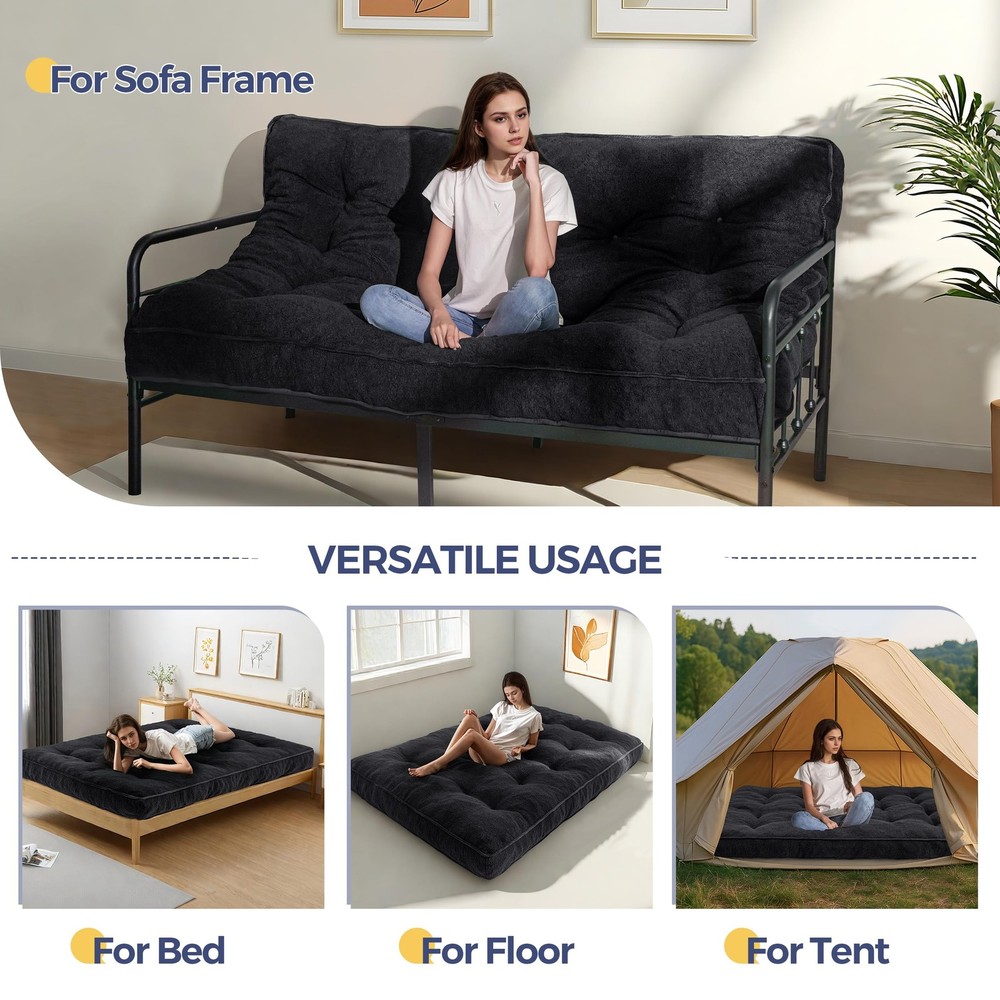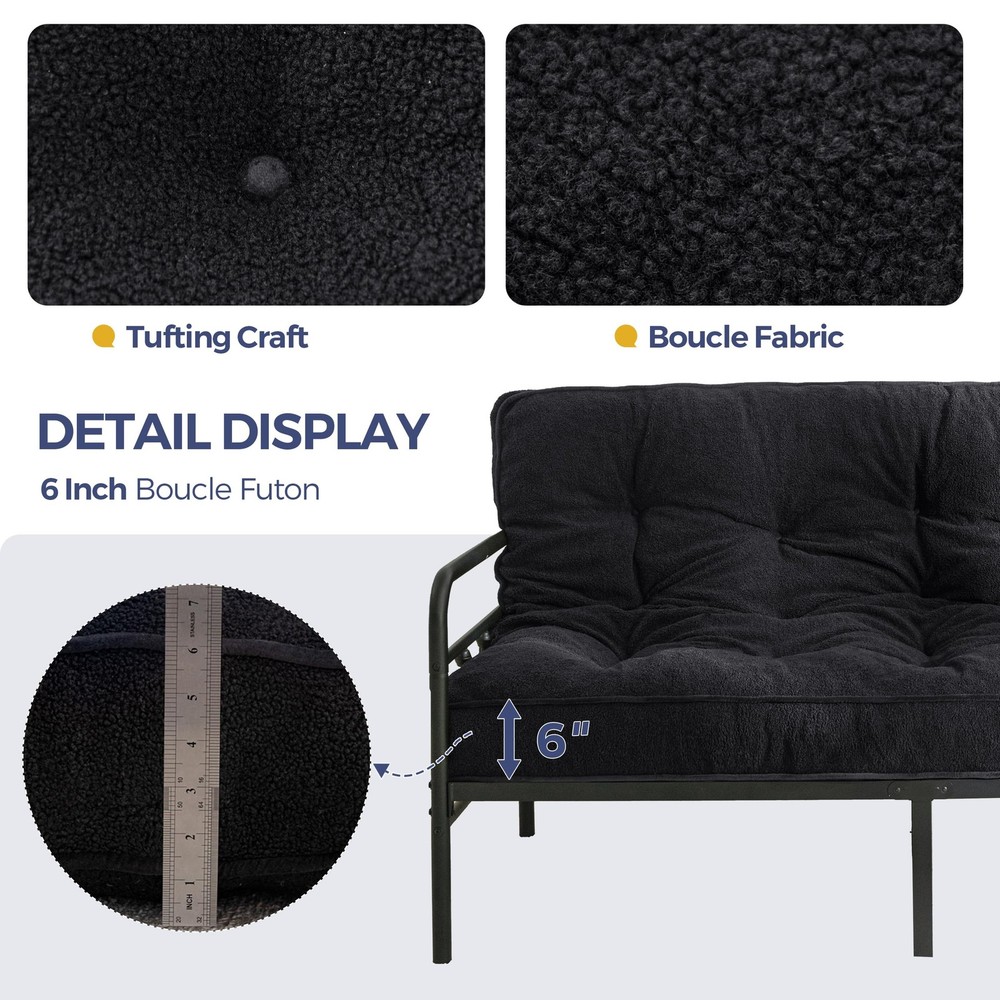 Comfortable and Supportive: The futon is equipped with high-density shredded foam that provide excellent support and comfort. The thickness is about 6 Inch. Whether you're lounging, reading, or sleeping, enjoy a relaxing and comfortable experience with every use Hand-Tufted Craftsmanship: The hand-tufted details are meticulously placed to secure the internal cushioning, preventing any shifting or bunching. This technique not only enhances the futon's durability and stability but also contributes to its refined and elegant appearance, offering both comfort and a polished finish Luxurious Boucle Fabric: Experience the soft, textured comfort of our thick futon mattress, crafted with high-quality boucle fabric. This material not only provides a plush and cozy seating experience but also adds a touch of sophistication and style to any living space Versatile Futon: The futon is versatile enough to be used on futon frames or directly on the floor as a standalone mattress. It can be used as a sofa/bed/floor mattress. Perfect for small apartments, guest rooms, or living rooms, this futon offers practical functionality without sacrificing aesthetics. Important Notice: After unpacking, allow the futon mattress to expand and air out for 48 hours. It will fully return to its original shape and size, making it ready for use.