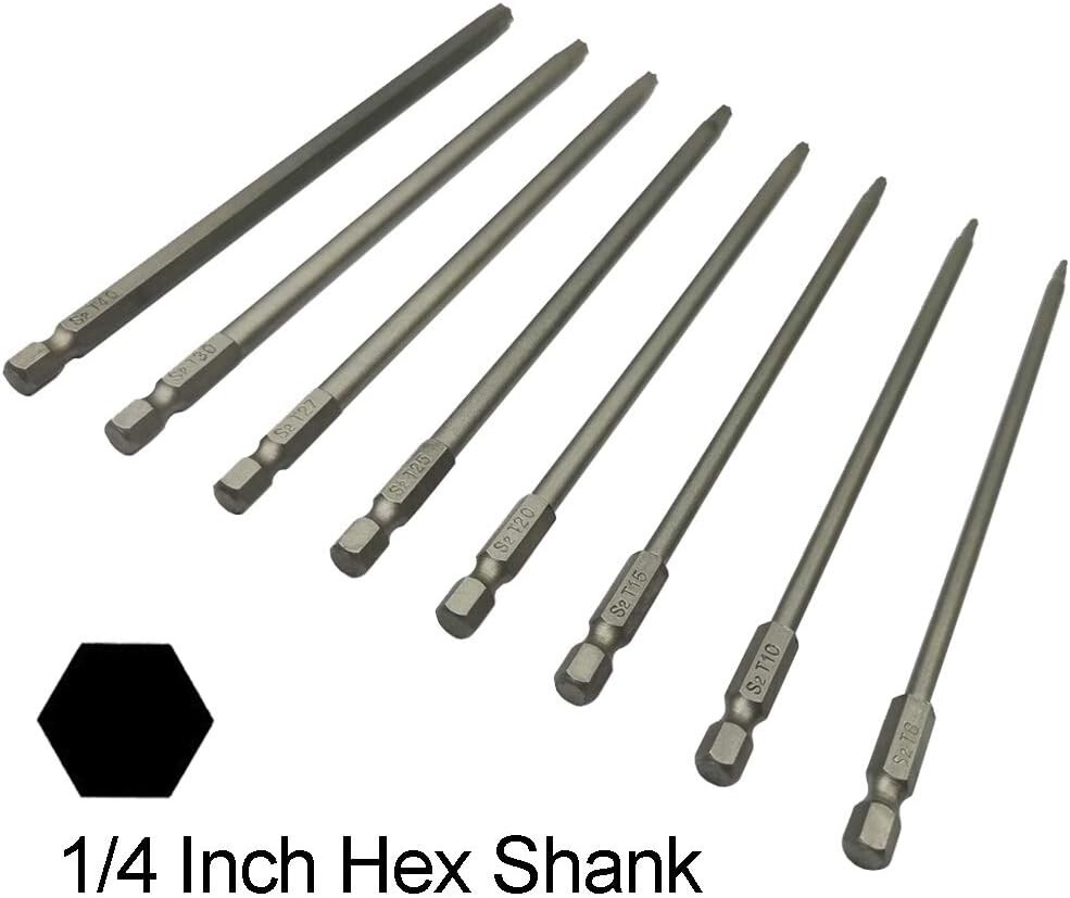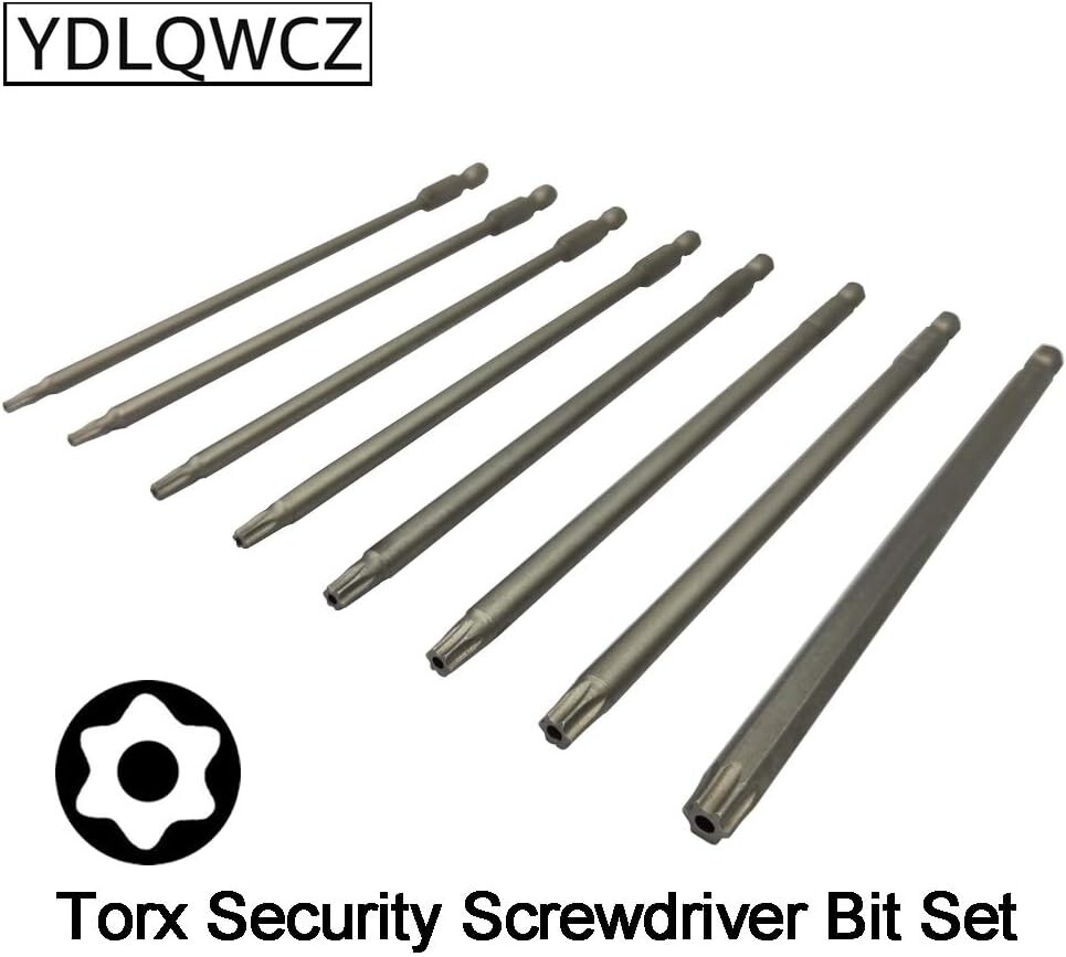 Long Torx Security Screwdriver Bit Sets 6 Inch Length T8 T10 T15 T20 T25 T27 T30 Item Length: 6 Inches Material: Alloy Steel Drive System: Star, Torx, Hex Finish Type: Steel 8 Size Torx Screwdriver Bits T8, T10, T15, T20, T25, T27, T30, T40, 8 in 1 Professional Size long torx security driver bits set can meet your different needs. Size is clearly engraved on the shank for easy identification. Widely Application 1/4” inch hex shank, and 6 inch (150mm) length. Can be used with electric screwdriver, manual screwdriver, electric drill, group general tools, air drill and other any standard bit holders. S2 High Quality Steel Made of S2 high quality shock-resisting tool steel, a hard and abrasion-resistant alloy metal. Torx head bits surface for steel material color,from inside to outside are the same. Magnetizable Head Magnetizable torx security screwdriver bar(New Bits with Weak Magnetic). After Magnetized with a magnet it would with a strong magnetic, can suck the screws easily when used it. Exquisite Workmanship This torx security tamper proof star bit set, exquisite workmanship, each edge can be accurately locked screws, no damage to the screw, and the screwdriver head.Such a practical aid in many situations. Return Policy: We offer a 30 day return policy from the receiving date. Please contact us for a Free Return Label. Please use our return label so it will go back to our supplier and we can do a refund or replacement afterwards. Feedback: Your satisfaction is very important to us! If you have any problem with your order, please contact us and we will do our very best to make you satisfied. As long as you are happy with your purchase, please leave a positive feedback for us. We will always leave you a positive feedback in return. If you have any problem with your purchase, please do not leave a negative feedback. Please Contact us ... and your issue will be solved quickly and positively We are a small family-owned business trying to make a living, not a huge company that does not care ... We will ALWAYS do our best for you!