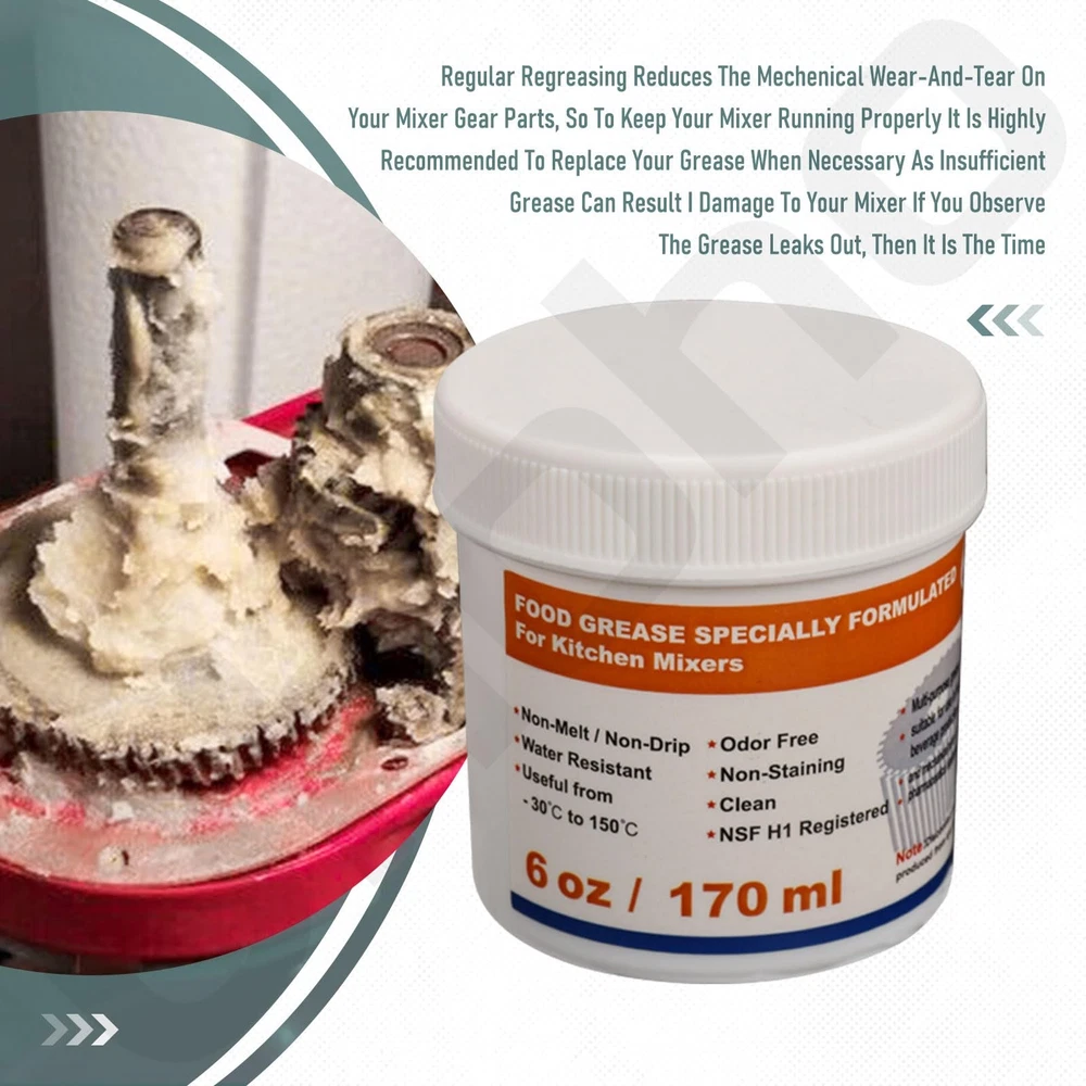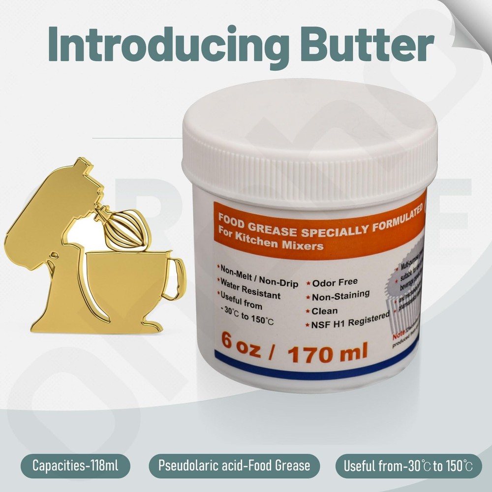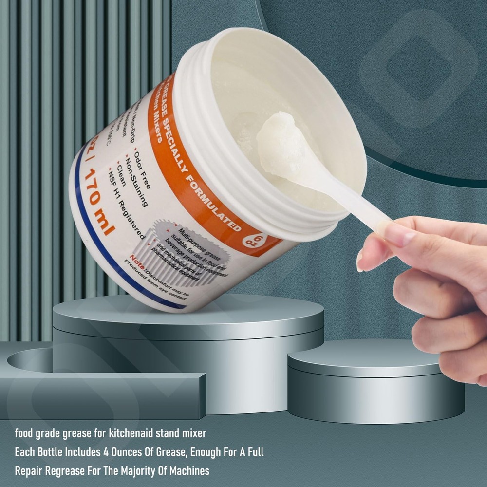 Keep your KitchenAid stand mixer and other food processing machines running smoothly and quietly with this versatile, 6 oz food grade grease. Ideal for regular maintenance, it extends machine life by preventing corrosion and protecting internal parts. The large jug container and included spoon ensure easy application, while the grease's high temperature resistance ensures longevity. Perfect for lubricating and maintaining your kitchen appliances, this grease is a must-have for any home chef. VERSATILE USE: This food grade grease provides lubrication for your kitchen appliances including stand mixers and other food processing machines.The large 6 oz. capacity is ideal for machines that require more grease. For smaller machines, be sure to replace it once and use the extra next time This food grade grease has the lubricating properties to get your kitchen mixer and other appliances that need to be re-lubricated running smoothly and quietly again, which can increase efficiency Ideal for Regular Maintenance: This product helps to extend the life of your machine by not degrading its performance compared to greases that can turn black, leak and damage gears after years of use. This is an ideal product for regular maintenance, protecting internal parts such as gears and keeping the machine in top working order We offer price and guaranteed quality. So you can buy with confidence and no need to hesitate when you want to buy a second one to keep your kitchen utensils in good condition The grease comes with a spoon for extra convenience when oiling Due to high temperature event, the food grease may experience mild melting. To solve this, simply store the grease in a fridge or cool room for a short period to solidfy (and make sure it is not accessible to children) and it is ready to use