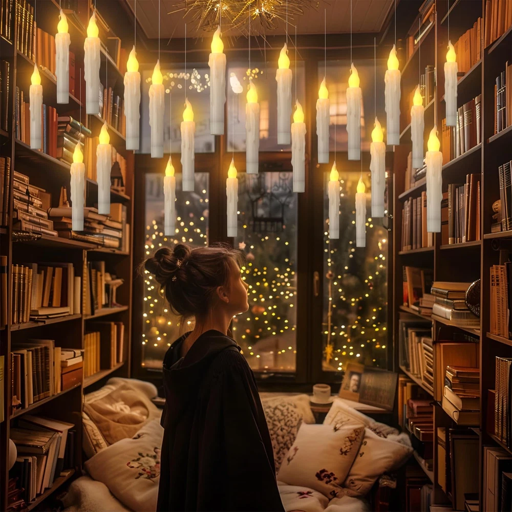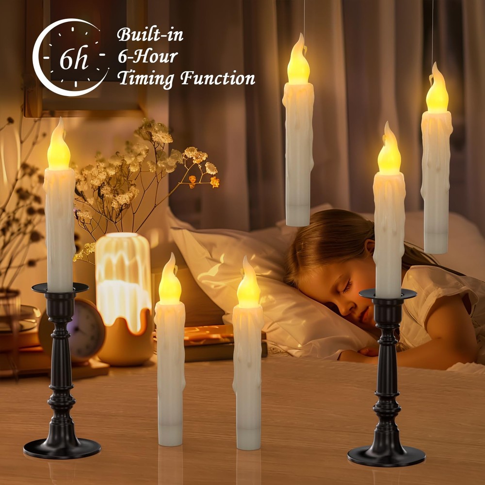 1. These flameless taper candles are amazing! The built-in timer makes them so convenient—no need to worry about turning them on or off. The updated hanging design works perfectly with fishing lines, creating a magical floating effect for parties or decor. The warm LED glow is so realistic, and the auto on/off cycle saves so much hassle. Perfect for classrooms, bedrooms, or themed events! Super easy to use and absolutely stunning.