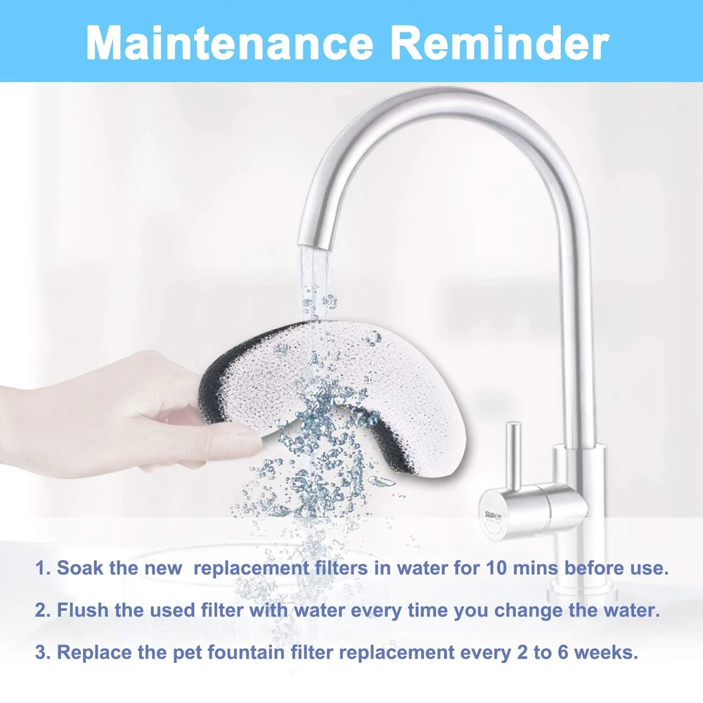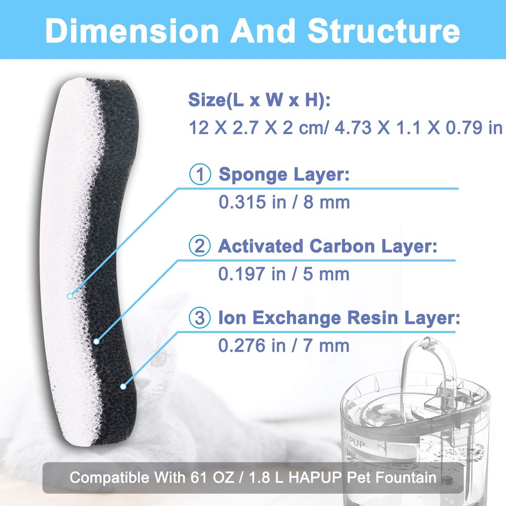 [Perfect Match] This Black-White cat water fountain filter is with our 61 OZ / 1.8 L Cat Fountain. Encourages your cats and dogs to drink more, helping them replenish water and keep well. [Triple Filtration System] Pet water fountain filters are composed of a white high-density filter cotton layer, black high-content activated carbon, and an black ion exchange resin. Sponge could catch cats hair and debris, the ion exchange resin layer could soften the tap water, the carbon layer could remove bad taste. The cat fountain filter can effectively maintain water quality by the multiple filtrations to provide good and hygienic water to pets. [Safe and Friendly] The cat fountain filter is made of premium fabric, reusable, easy to install and remove. Furthermore, black high-density and high-content activated carbon filter is matched with white high-density cotton filter to monitor the filter dirty clearly. The cat water fountain filters help to make life easier for you and your pet. [Period] Pet water fountain filter can be cleaned and reused. It is strongly recommended to replace the filter every 1-4 weeks to ensure a clean water source! Please soak the cat fountain filters in water for 10 minutes and rinse it thoroughly under running water before use. [Value Pack & Risk Free Sevice] 6-pack of premium Black-White pet fountain filters, suitable for dogs or cats of all sizes about a 6-12 months using time, and , and is with WF060, WF050, WF050TP, WF100, WF210. Each cat water fountain filter is individually packaged and sealed to maintain high quality. If you have any problems, please us freely.