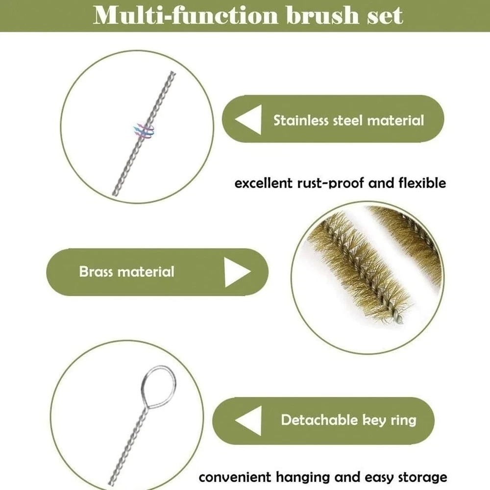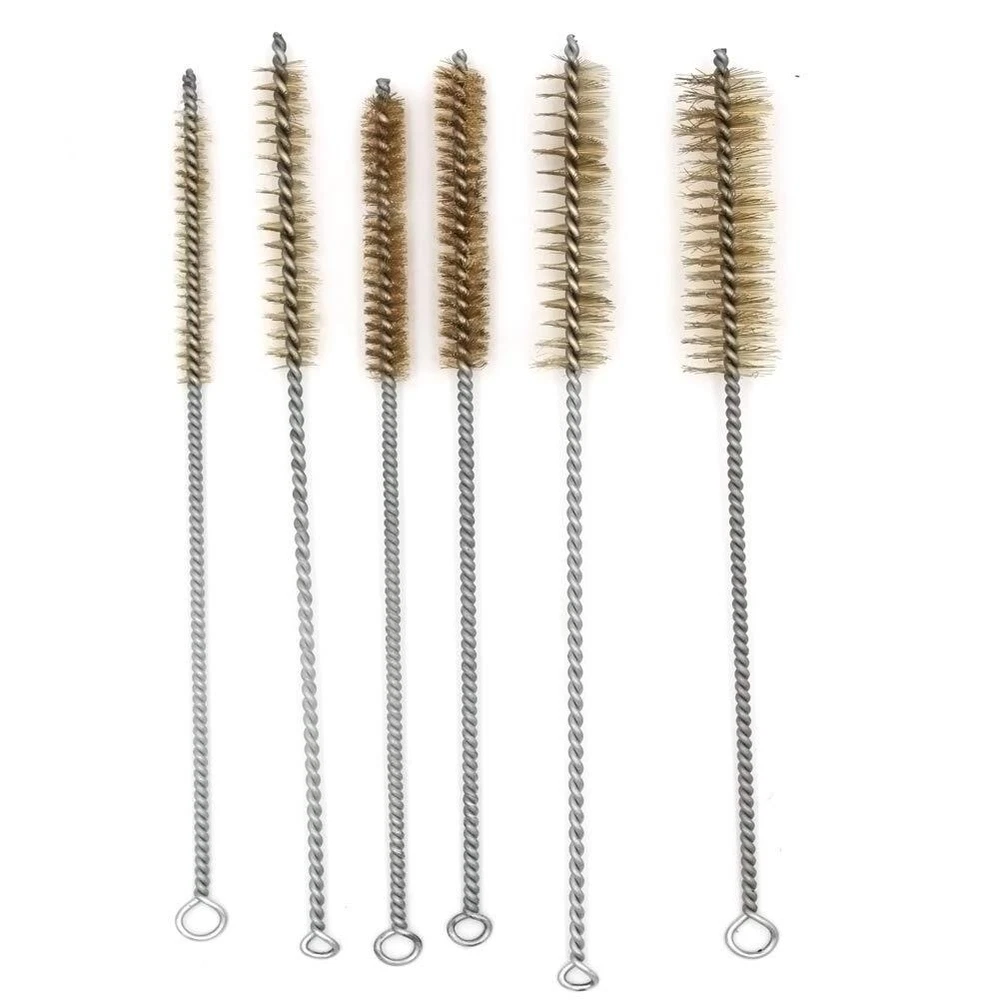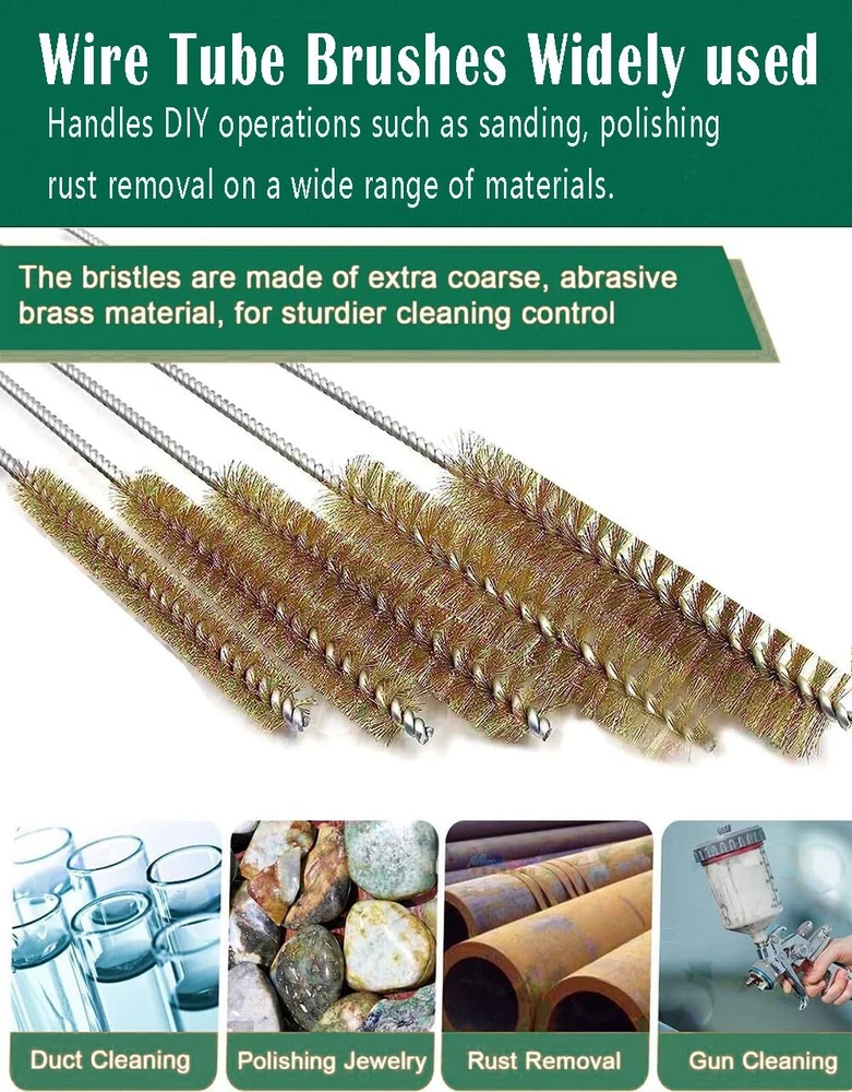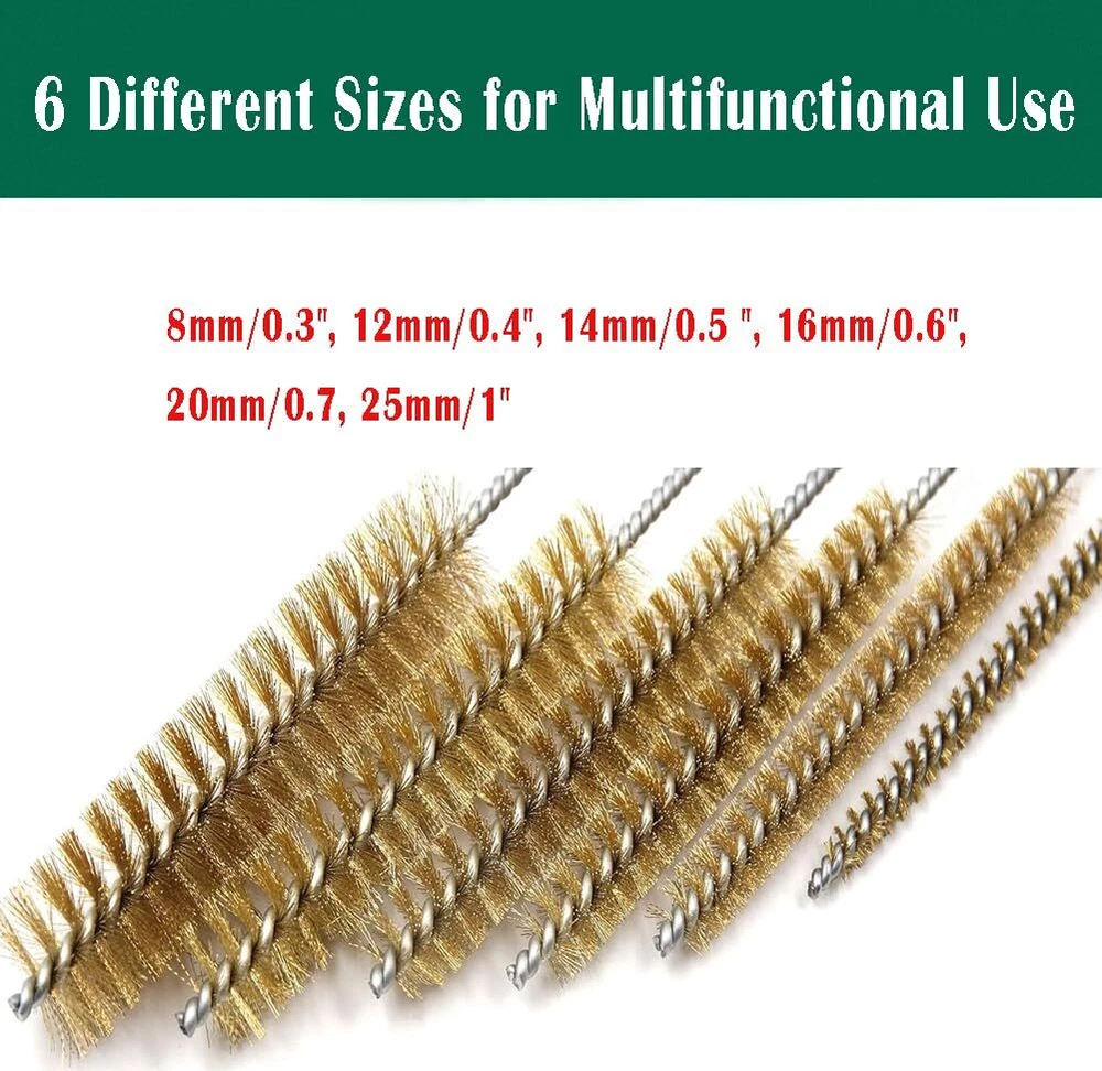 【Material】:Made of high quality stainless steel handle and brass brush ,the spiral copper wire bristles are not easy to separate for long life and precise cleaning polishing experience, high working efficiency, saving you energy and time. 【MULTIPLE SIZE】:6 Different diameter pipe cleaners set for most commonly used types, diameter(8mm/0.3", 12mm/0.4", 14mm/0.5 ", 16mm/0.6", 20mm/0.7, 25mm/1".) 【EASY TO USE】:Simply insert it into the pipe, rotate it, remove and wash it. The bristles are made of extra coarse, abrasive brass material, for sturdier cleaning control. Cleans all kinds of dirt and removes rust 【Widely Use】:Ideal for DIY or Professional , This flexible Wire brushes for cleaning set can be used for automotive parts brushes,straw cleaning brushes, bottle washing brushes,glass cleaning brushes,pipeline cleaning brushes,spray gun cleaning brushes,computer keyboard cleaning brushes,coffee cleaning brushes 【Long Shank】:11" long handle brush set design,flexible to use, allows it to brush wherever you need,and can be bent and not easily damaged.With a little modification, brush cleaner can also be used on a power drill 【Quality Guarantee】:We provides 3 months quality guarantee and after-sale service for every customer. If you have any problems, please feel free to contact our customer services team, solutions would be within 24hours