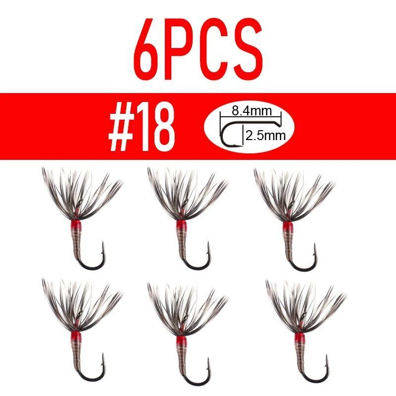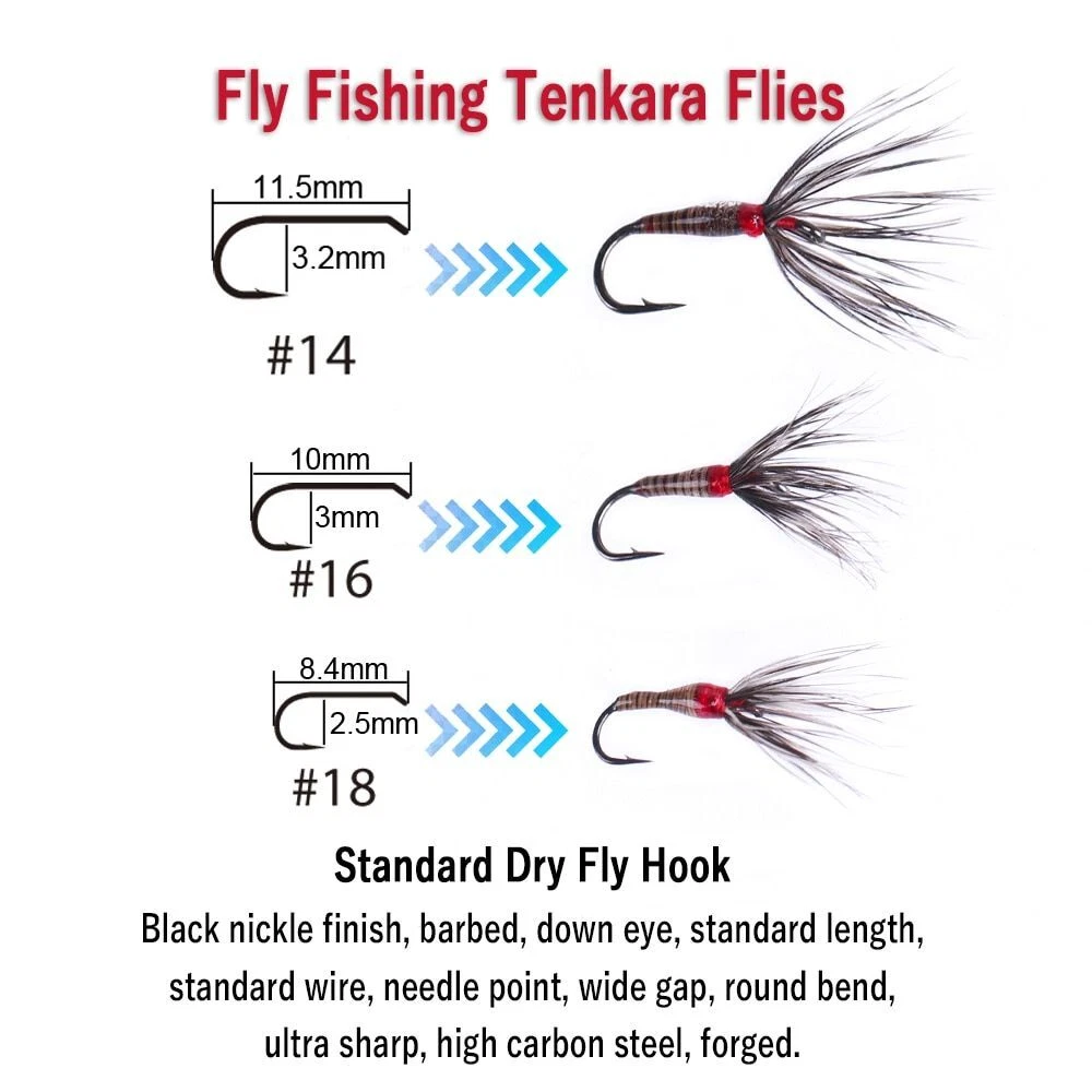 Fly Fishing Tenkara Flies Hook Material: High Carbon Steel Hook Size: #14,#16,#18 Feature: Standard dry fly hook, black-nickel finish, barbed, down eye, standard length, standard wire, needle point, wide gap, round bend, ultra sharp, high carbon steel, forged. Features: Tested, efficiency flies, tied with good quality fly hook. Native trout are the main target of tenkara anglers. Can be easily skated through the film or at shallow depth. It is great for a dead drift in most any current. Background of Tenkara fishing: A very ancient fishing style practied on mountain streams in Japan. Now it is attracting the attentions of all fly fishing men from the western world.This fishing style targets both warm and cold water streams, ponds and lakes for fishing trout, bluegills, largemouth bass, smallmouth bass, and crappies. The Sakasa Kebari, or reverse hackle fly is probably the iconic "Tenkara fly." Their characteristic that they are dry and that their wings, and legs oriented towards the eye of the hook where it is made. The hackle shape, and the heavy hackle, act like a sea anchor or drogue chute (an underwater parachute), resisting the pull of the lime. That helps minimize line sag and allows a tenkara angler to keep his line tighter and off the water's surface. Slight rhythmic pulsing flies by raising and lowering the rod causes the fish to jump. When the rod is lifted, the string is corrected and flies slowly pulls up and down. By lowering the rod down flies to sink slowly and feathers flies (Saccas Chebar) to bend towards the hook eye. Gently lifting up the rod,feathers flies to bend backwards. Thus pulling the fly looks like it was alive it irritates the fish shot. Pulsing should be very skillfully, and that can be a feathers, open and close.Tenkara has no strict rules. Enjoy Tenkara in your fishing time.