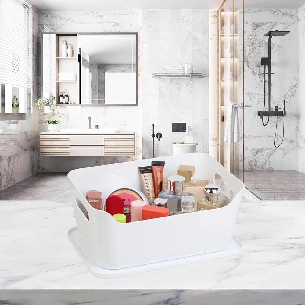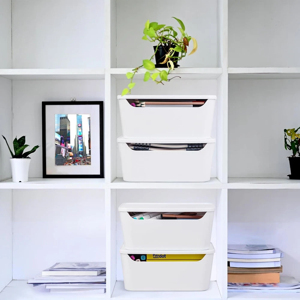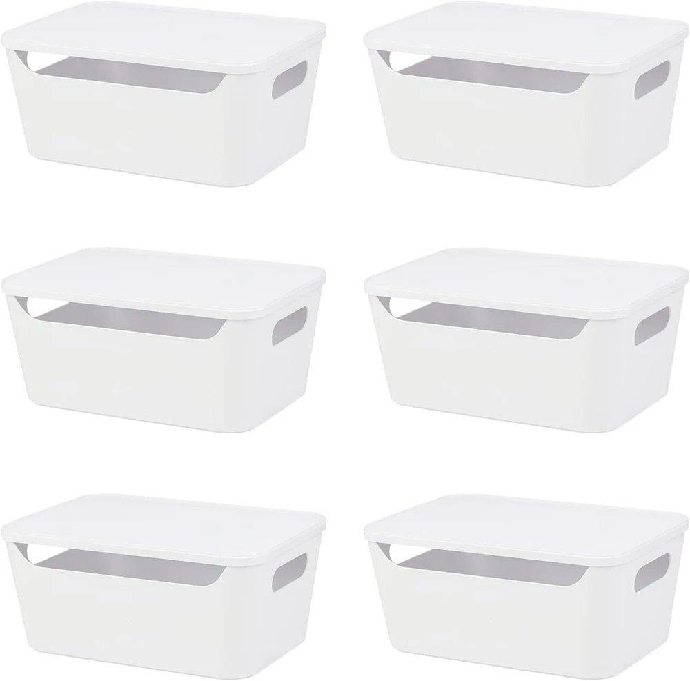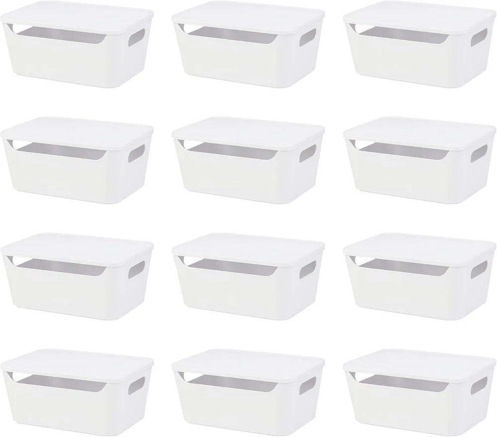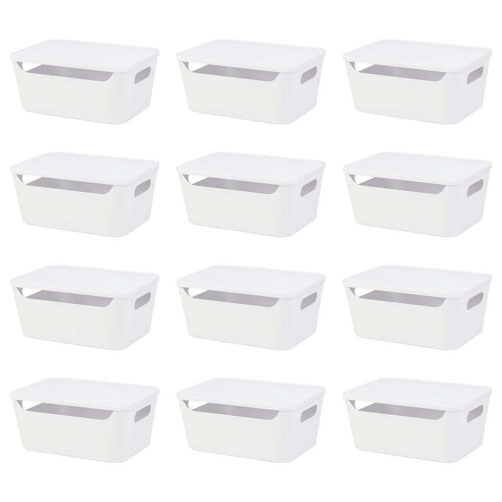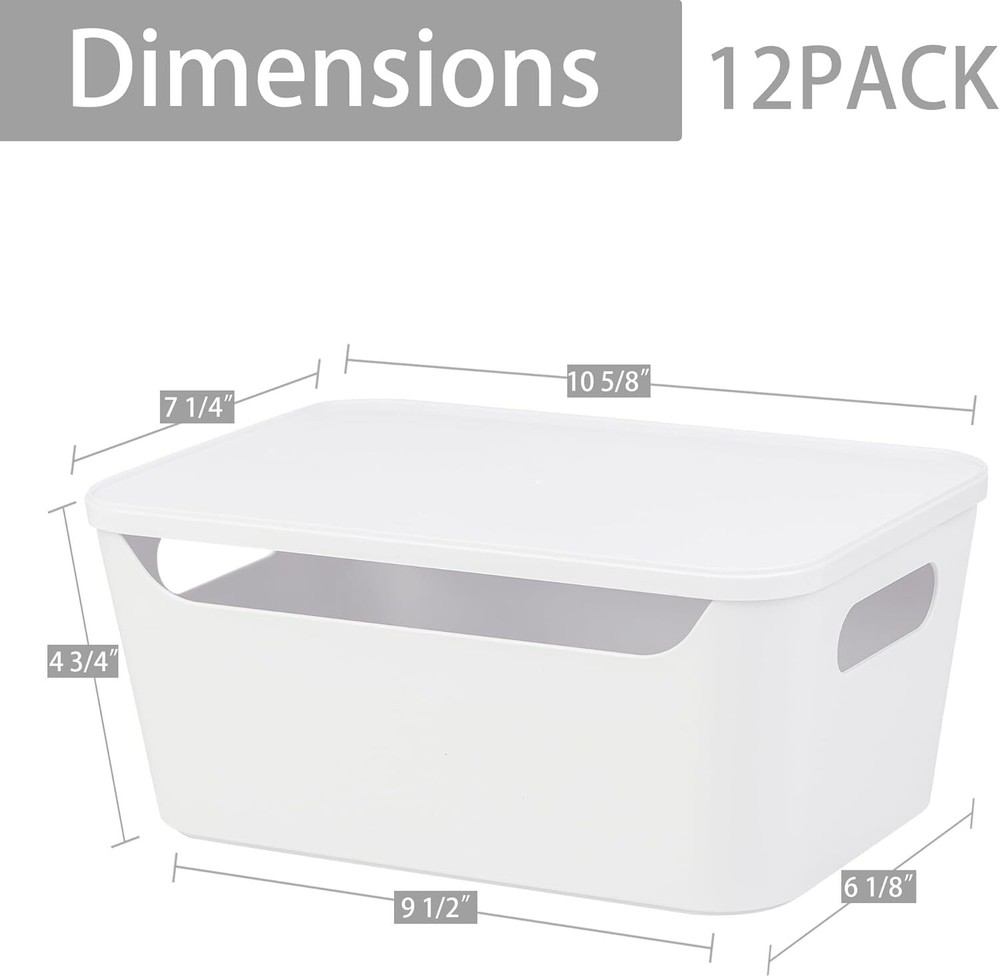 Features: Sturdy: These sturdy and long-lasting storage bins are made of premium durable plastic. It is BPA free. They are in nice white and elegant design. They are perfect to fit all your rooms. Stackable with Lids: These storage containers are stackable. They are the simple space-saving storage solutions great for organizing any area of your home. With lids design, the containers keep items dust-free. Versatile: Designed to keep your closet neatly organized. Our organizer bins are great for home and office use for organization. Also use for the bathroom, laundry room, kids room and kitchen. Expand your possibilities with our versatile organizer. Perfect Size: Our storage bin is 3.7L each. Suitable for all your home usage. Great help to organize your lotions, cleaning tools, towels even toys. Measurement: 10-5/8"x7-1/4"x4-3/4". Specifications: Material - PolypropyleneMaterial - Polypropylene Special Feature - stackable Recommended Uses For Product For Cosmetics & Make-Up Package List: 6pcs or 12 pcs