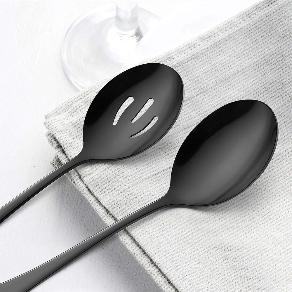 This sleek 6-piece black serving set is a game-changer for any gathering! The mix of solid and slotted spoons handles everything from salads to soups effortlessly. Heavy-duty stainless steel construction feels premium in hand—no bending or rust worries. Perfect weight for comfortable serving at parties, buffets, or daily meals. The matte black finish adds modern elegance to any table setting. Washes up easily and stays scratch-resistant even with frequent use. A steal for the price compared to flimsy alternatives—worth every penny for hosts who entertain often!