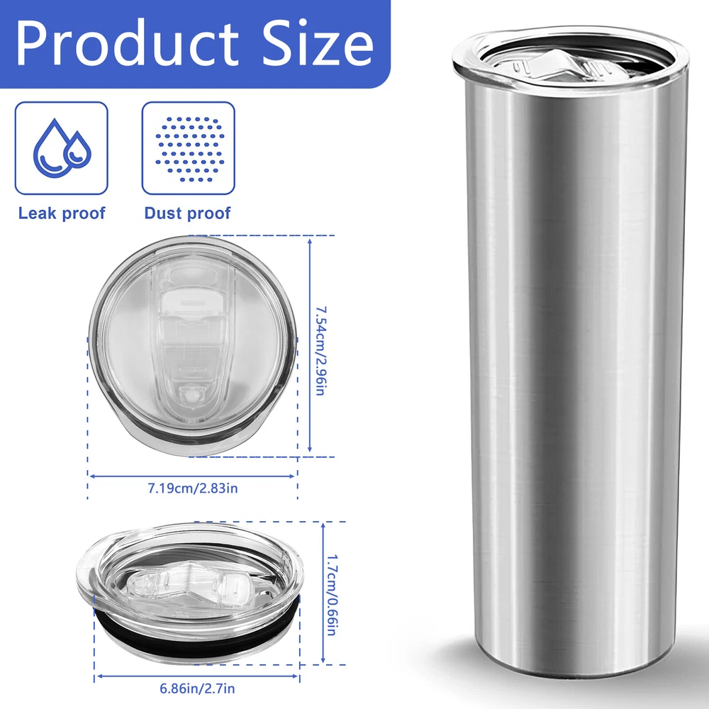 Parts List: 6×Skinny Tumbler Lid Highlight description: [Safe Plastic Material] The tumbler cover is made of premium plastic material, which is lightweight and has high transparency, BPA free. The cup lid is safe and reliable to use, dishwasher safe. [6 Pieces Tumbler Lids Set] The package includes 6 clear tumbler lids. Each size is about 7.54x7.19x1.7cm, inner diameter about 6.86cm/2.7inch. Note: This product is suitable for 20oz skinny stainless steel tumblers. Please confirm the size carefully when purchasing. [Spill Proof and Splash Resistant] This cup lid has a good seal, which can effectively isolate the contact between air and beverage. It is spill proof and splash resistant, prevent the liquid inside from spilling. [Easy to Use and Carry] The lid features a sliding button that slides easily to close or open with one hand. It is also easy to carry, meeting daily use and replacement. [Dust-Proof Tumbler Lids] The lid can cover the cup to prevent dust from entering and enjoy delicious beverage. It is practical and can be applied to multiple life scenes. Detailed description: Product Name: Skinny Tumbler Lid Material: Plastic Size: about (length x width x height) 7.54x7.19x1.7cm, inner diameter about 6.86cm Fits: Suitable for 20oz Skinny Stainless Steel Tumblers Notes: 1.This product is suitable for 20oz skinny stainless steel tumblers. Please confirm the size carefully when purchasing. 2.There may be slight differences between the picture and the actual color of the commodity. We will try our best to show you the exact color. 3.Please allow slight dimension difference due to manual measurement.