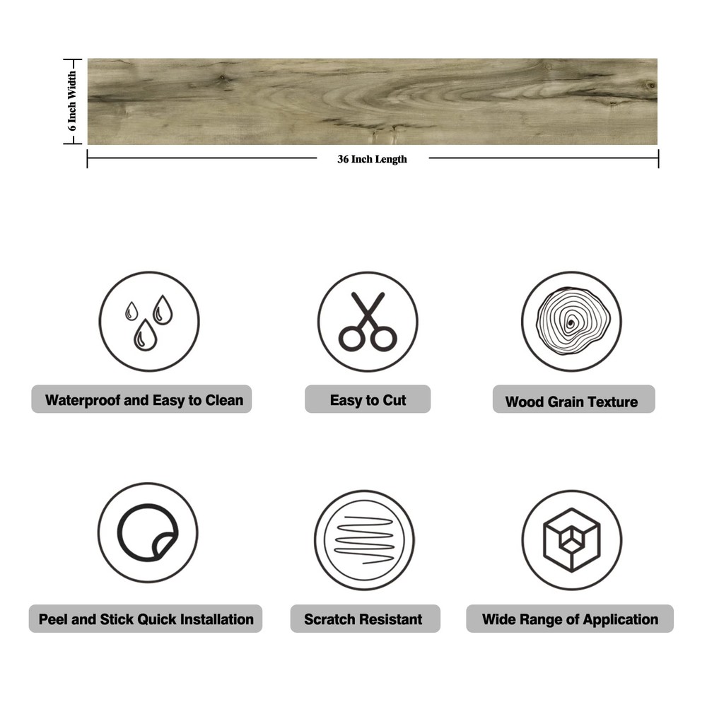 Rich Wood Visuals with a fine lustrous finish make the realistic wood-finish vinyl planks indistinguishable from real wood flooring! Our realistic wood look vinyl is easy to install as a DIY project: simply peel off the paper backing and stick to a flat and dry surface. For durability, the flooring is waterproof, scratch, stain, and dent resistant. Perfect for high-traffic areas, including kitchens, bathrooms, and basements. Dimensions ➡ Wood vinyl plank flooring measures 6 inches width x 36 inches length and 0.63mm thick. Each box contains 16 floor tiles, covering 23.3 sq. ft. Strong adhesion vinyl floor tiles, durable and anti-stress Light Brown Wood Grain Texture ➡ Natural wood visuals with a low gloss matte textured finish that adds warmth and beauty to your space. This wood vinyl flooring made of high quality vinyl material, scratch resistant, wear resistant, perfect for renters or homeowners Waterproof & Self Adhesive ➡ Peel and stick floor tile wood vinyl planks is waterproof, oil-proof, removable, easy to clean, easy to maintain, flexibility. Self adhesive floor tiles, simple DIY peel and stick installation, just peel off the paper backing and stick to a flat and dry surface, no messy glue or adhesives needed Application ➡ You can enjoy the look and feel of hardwood in any room of the house with this wood vinyl plank, such as bathroom, kitchen, bedroom, laundry room, living room, dinning room, mudroom, basement, garage, farmhouse, office, hotel, renter house, RV, furniture, desk, table, floor, walls, laminate flooring, stairs and so on Warm Tips ➡ Wood flooring also can be installed over most existing surfaces including ceramic tile, wood, concrete, terrazzo and vinyl. For aesthetic consistency it is recommended that you purchase sufficient wood vinyl plank at once