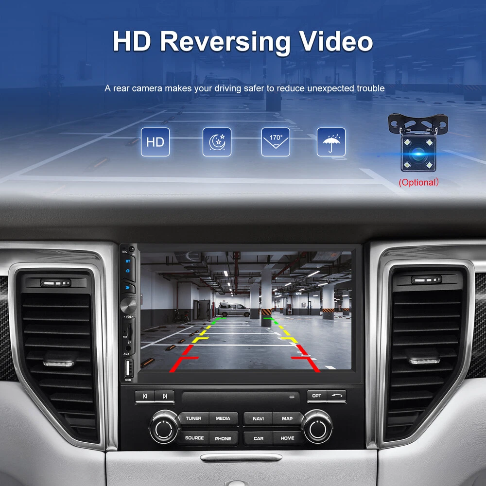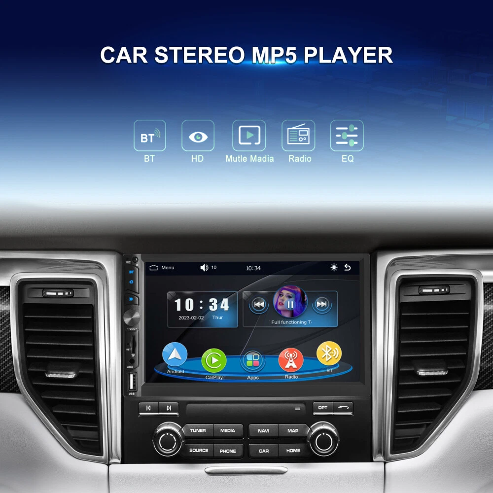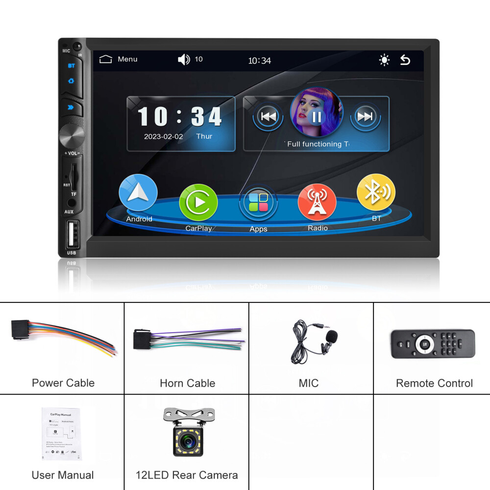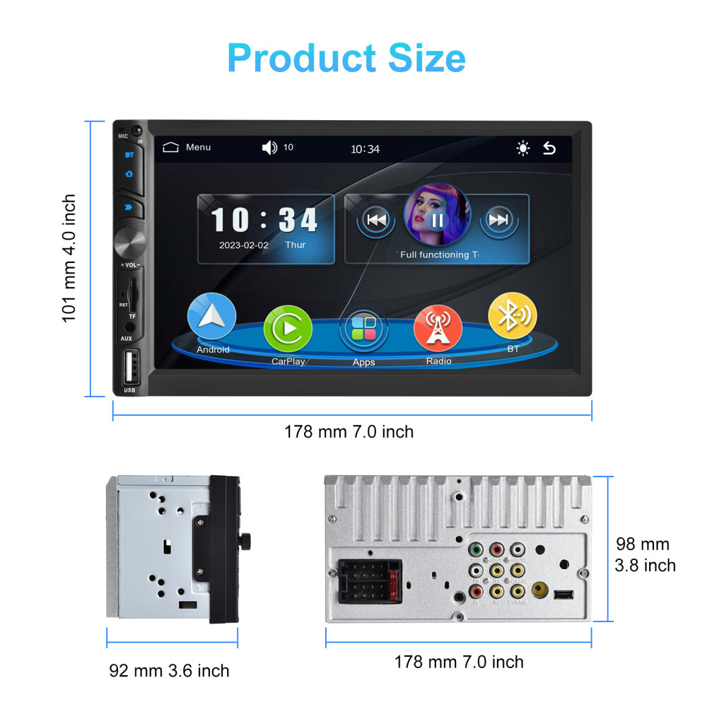 Double Din 7" Car Stereo Apple Carplay & Android Auto Play MP5 Radio+Camera Description Features : ● Wireless Carplay: You can choose wired connection or wireless connection to carplay, connect to Apple mobile phone, access mobile phone address book, mail, notification, map navigation, music, video and other information, and realize voice control. ● Wireless Android auto: The Wireless Android auto car system can closely integrate the user's Android phone and player, and realize navigation, make calls, send and receive information, listen to music and other operations through data cable connection. ●Screen: 7-inch high-definition video playback. ●Mirror Link: Support Android/ Iphone Mirror Link,through phone's original USB line Can synchronized to the on-board screen,which can support Apple mobile phone 13.4 version, Android mobile phone version 10.1. More than this version or does not support mobile phones, need to upgrade the software after the original factory debugging. ●Built-in Bluetooth function, can connect to phone, and handsfree calling, more safer when driving car, bluetooth music play. ●Various UI theme wallpapers to choose from, switch styles at any time, bringing a different visual experience. ●FM radio: You can listen to real-time traffic, news boradcasts, weather forecasts, etc receiver 18 preset Store Function. ●Support Steering wheel control function : Quickly switch functions which you want with your car's steering wheel,more convenient. ● Rear view camera input function(optional): Need to choose the camera, if connect to a car backup camera, the car stereo monitor will turn to rear view reversing details automatically(require optional). ● Colorful backlight settings:Support seven color backlight,you can select your favorite color in the setup menu decorate your car. ●AUX audio input interface supports external MP3, mobile phones, music players, etc. ●Multi-function USB: support USB input to play music, as well as high current USB output to be charged mobile phone Specification : System: F133 Size: 7.0 inches Voltage: 12V Audio amplifier: 7388 Bluetooth: 5.1 Screen resolution: 1024*600 Output power: 4*45W USB interface: USB2.0 Reversing input: CVBS&AHD720 Radio range: FM 87.5-108.0MHZ (Europe) External microphone: support DVR: Support (designated USB recorder) Working temperature: -20℃ ~ 70℃ Factory Settings Key: 113266 Audio format: MP3/WMA/WAV/APE/FLAC Video format: MKV/AVI/TS/TP/MP4/M4V Max Bit Rate (50Mbps-80Mbps) Languages: English, French, Spanish, Russian, Italian, Portuguese, German, Polish, Chinese (simplified), Turkish, Arabic, Hebrew Package Included : 1 x car player 1 x Power Cable 1 x Horn Cable 1 x Remote Control 1 x external microphone 1 x User Manual Payment Shipping Returns Contact Us 1. Only accept Paypal 2. All major credit cards are accepted through our secure payment processor PayPal. 3. We ship to your Paypal address. Please make sure your Paypal address is correct before you pay. Please make sure your eBay shipping address is correct for your receiving. We will try our best to solve any dispute and try our best to satisfy you. If you are not satisfied with our product, please contact first . We will gladly accept any return and give a full refund (minus shipping costs) on any item. The item must be returned to us in original condition with the health and hygiene seal intact. If you have not got it within the shipping time, please no hesitate to contact us. We will check it for you with the post office and customs. Because sometimes it will be delayed for traffic or flight jams. Please do not open dispute to us. We will take responsibility to resend or refund for any lost item. Please contact us in time if any enquriy under any circumstances. We greatly appreciate your positive feedback and we'll do the same to you. We care about our valued customers, and will always try our best to help you, if you have any problems. Working time: GMT+8 / 9:00-18:30 in normal we will reply you in one working day.