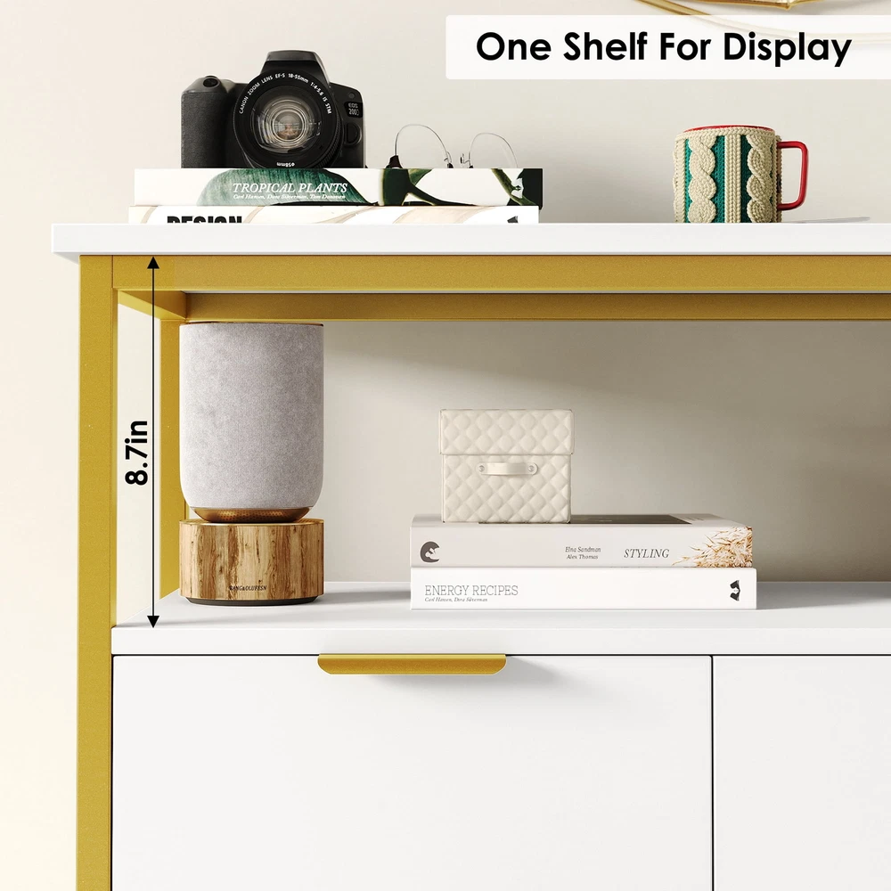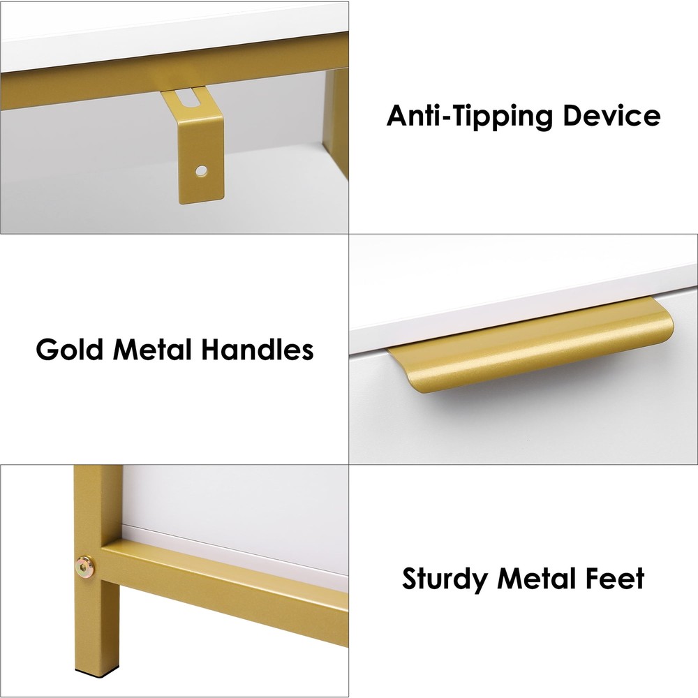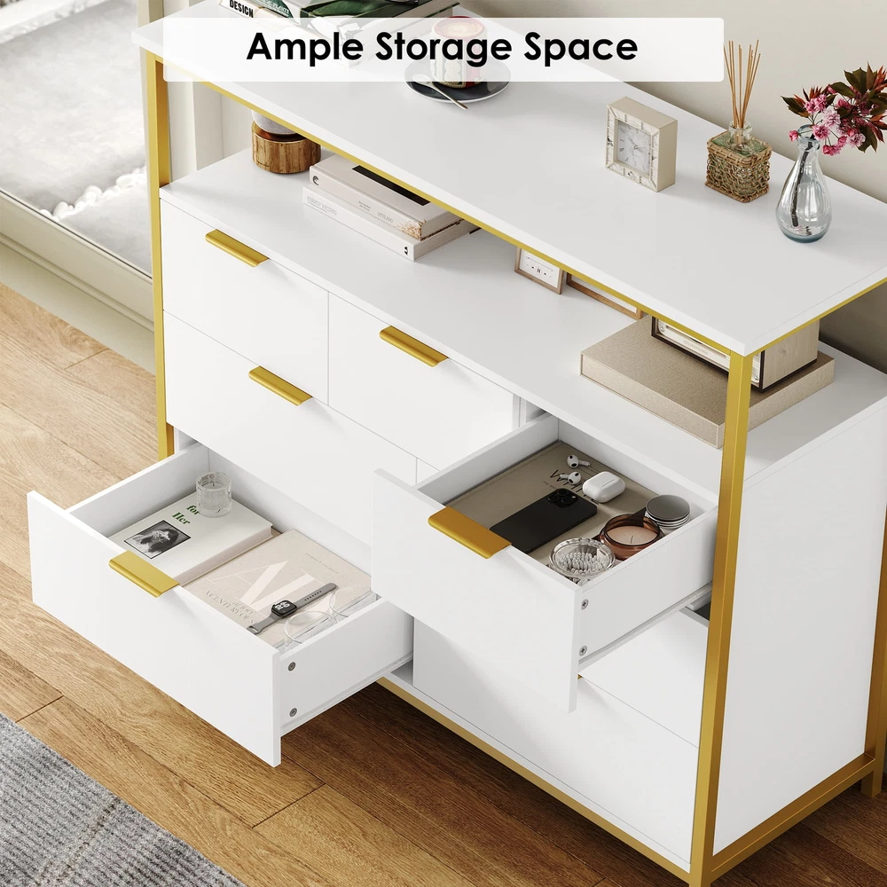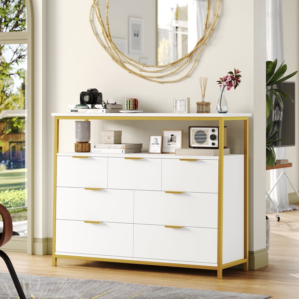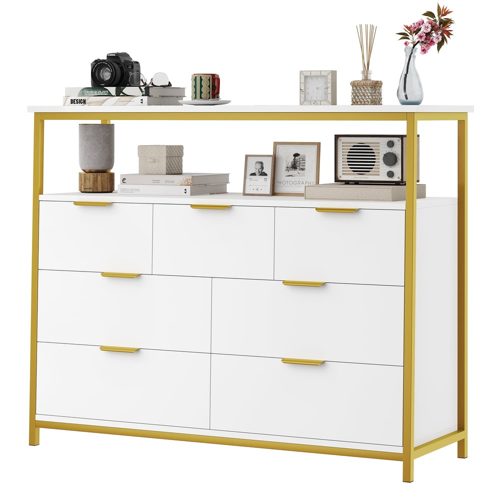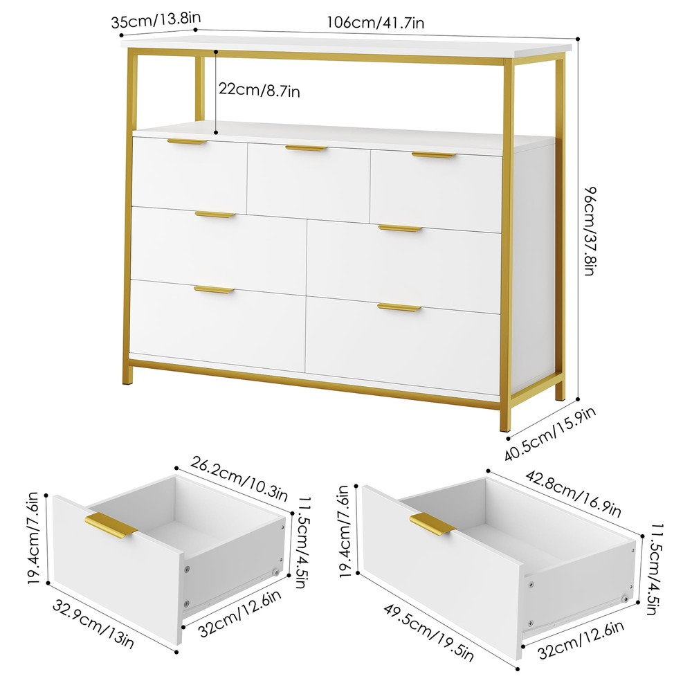 7 Drawer Modern Large Dresser 37 Inch Bedroom with Display Shelf Gold Trim White bedroom dresser matches many space. Whether you want to use it as a dresser in your bedroom, a wooden storage cabinet in your living room, or an organizer drawer set in your kitchen, this storage cabinet is confident that it will be your best choice of bedroom furniture. 2-Tier Open Display Storage Shelves: Wide dresser top with open display shelf Use in Various Places: Can also be used as a sideboard in the kitchen or dining room, bedroom, living room, office or entrywayyour kitchen utensils in your dining room updating your valuable space Stable Premium Metal Cabinet Legs: High quality metal dresser cabinet legs provide more stable support as well as more convenience for daily cleaning Stylish Look in White Gold Combination: Pure white dresser with gold colour high quality metal frame Sturdy Structure + Anti-Falling Device=More Safety: Scientific assembly design and carefully selected wood ensure the stability and durability of this chest of drawers.1 Anti-tip device prevents the wood dresser from tipping over! Durable & Easy-to-Clean: Made of high quality material, easy to daily clean and durable, the surface is finely crafted, dust and scratch resistant Easy Assembly】 Everything needed for assembly comes collected in a package sent to you. The 7 drawer white dresser could be easily assembled in less than 1 hour by 2 adults with the instructions Shipping/Fulfillment We offer FREE shipping to most States except for the following: California, Connecticut, District of Columbia, Massachusetts, Louisiana, Maryland, Mississippi, Tennessee, Washington, New Mexico, Illinois We use a selection of shipping services such as but not limited to: UPS, FedEx, USPS, DGM SmartMail Expedited, etc. We only ship to the lower 48 states, no APO/FPO addresses, or PO Boxes allowed. Local pickups and combined shipping options are not provided at this time. ORDER FULLFILLMENT Most items are forwarded to our supplier for processing, which will then be fulfilled through a distributor that is closest to your location. Th ese distributors may be names you recognize or sourced from smaller local operations. Return You can return a product for up to 30 days from the date you purchased it. Any product you return must be in the same condition you received it and in the original packaging. Payment We accept payment by any of the following methods: PayPal, GPay, Venmo, Visa, Mastercard, American Express, and Discover Feedback Customer satisfaction is very important to us. If you have any problem with your order, please contact us and we will do our best to make you satisfied. Contact Us If you have any queries, please contact us via eBay. We usually respond within 24 hours on weekdays. Please visit our eBay store to check out other items for sale! Thank you for shopping at our store.
