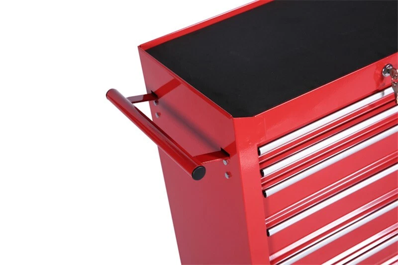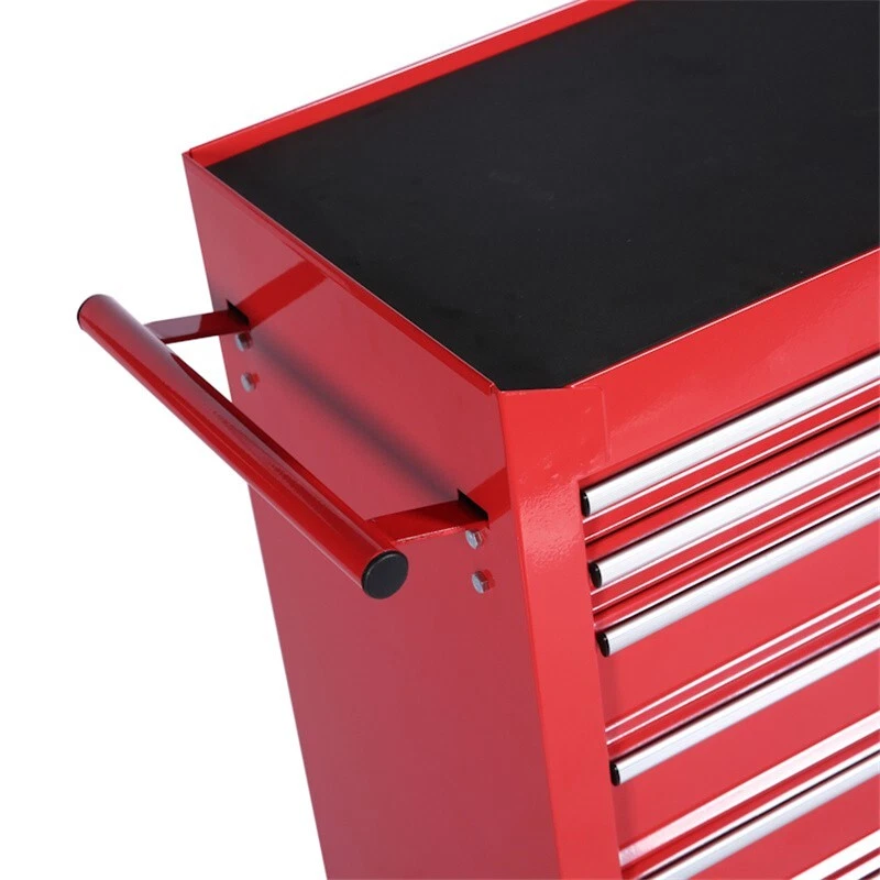 Features and Details : The ARTMAN tool trolley is equipped with a total of 7 drawers . The tool box is also lockable and can be used as a removable, attachable and mobile case attachment The opening and closing of the drawers of the tool cabinet is very gentle thanks to the ball-bearing drawers. The robust and powder-coated steel construction is used for high wear resistance. This assembly trolley has 4 steering wheels, 2 of which with parking brakes, so you can move the trolley freely in the garage, but also stop in one place Specification: Color:Red Material:Cold Rolled Steel Surface Finish :Powder Coating Casters:4" Casters (2PCS with brake and 2PCS without brake) Size :24.2*12.9*29.9inch Drawers Dimension :19.9*10.9*3.1inch Net Weight:25KG