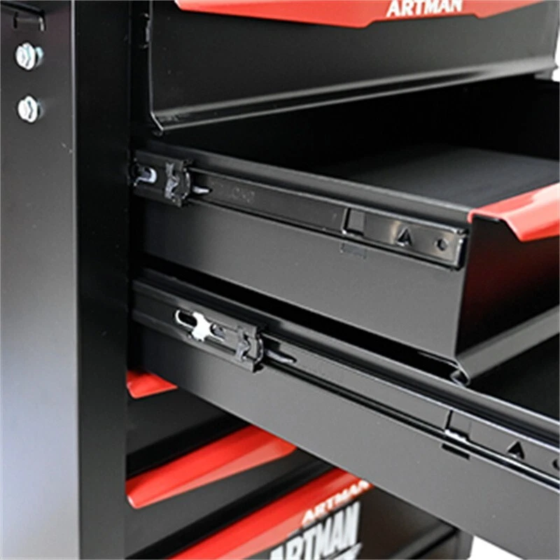 7 Drawers Rolling Tool Box Cart Tool Chest Tool Storage Cabinet w/ Lock & Key Features The ARTMAN tool trolley is equipped with a total of 7 drawers . The tool box is also lockable and can be used as a removable, attachable and mobile case attachment The opening and closing of the drawers of the tool cabinet is very gentle thanks to the ball-bearing drawers. The robust and powder-coated steel construction is used for high wear resistance. This assembly trolley has 4 steering wheels, 2 of which with parking brakes, so you can move the trolley freely in the garage, but also stop in one place This is a set of cabinets, can use a round hook at the bottom of the table to connect another tool car, thus forming a combination. Description Ball Bearing Slide 15KG loading capacity ball bearing slide One Side with Pull Handle This product comes with a handle on one side, which not only helps to push and pull it more, but allows you to move it more freely 4 Universal Wheels With swivel casters could maneuver easily around work area. The wheels have locking mechanisms to prevent the tool cabinet from moving around on its own while in use. With Key Locking Protecting the tools and items stored inside Product Information Product name 7 drawers Workshop tool trolley Metrail Cold Rolled Steel Surface Finish Powder Coating Casters 4" Casters (2PCS with brake and 2PCS without brake) Product Size (with wheels) 20.63*12.99*30.59INCH Prouduct Size 20.63*12.99*25.83INCH Package Size 23.31*15.35*28.66INCH Color Black+Red Net Weight 54.23LBS Gross Weight 58.64LBS