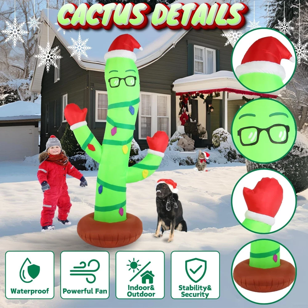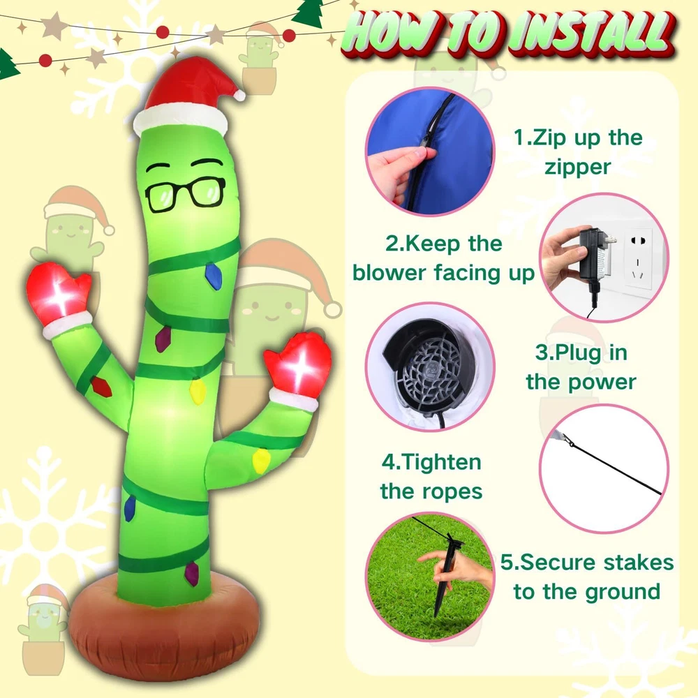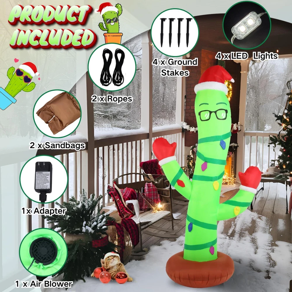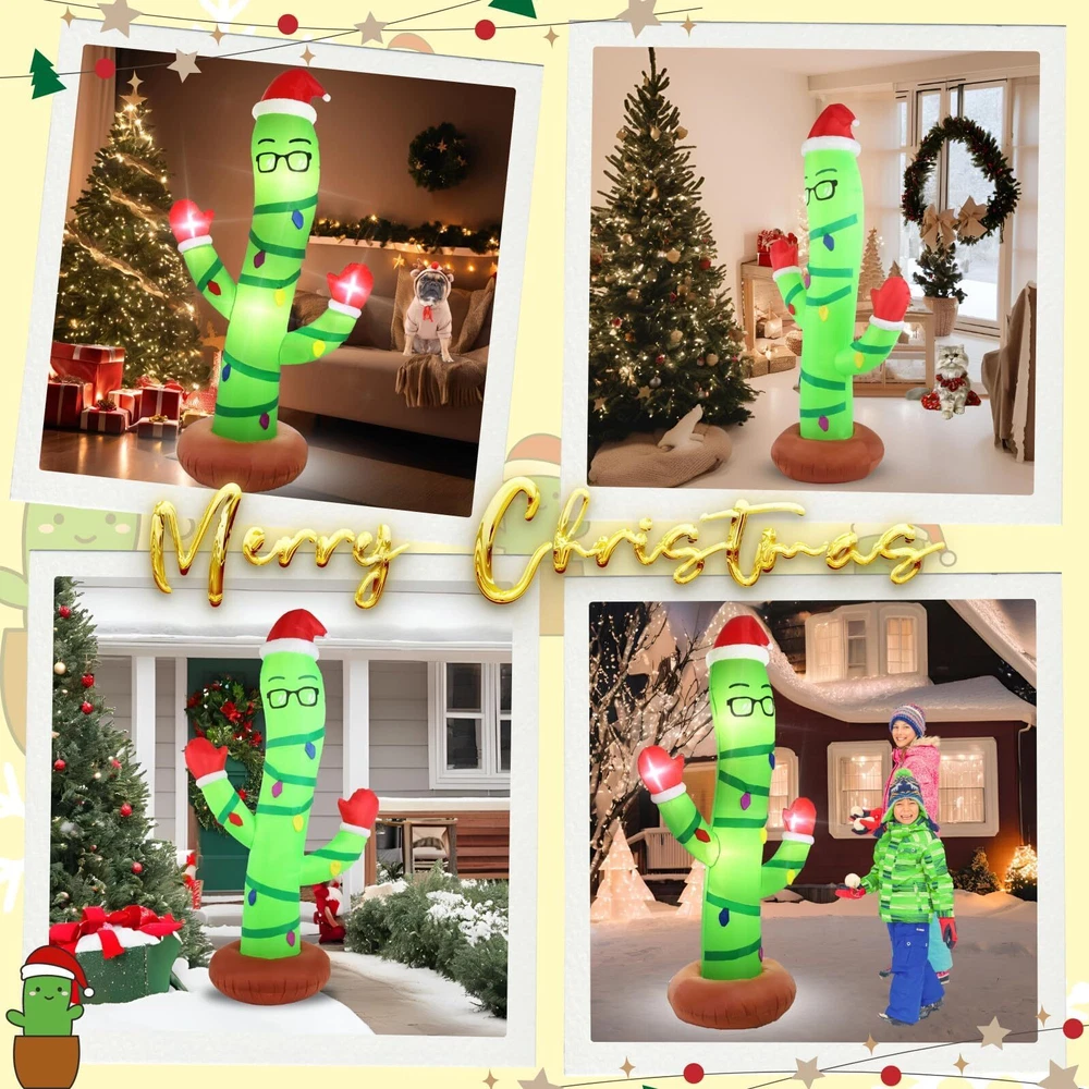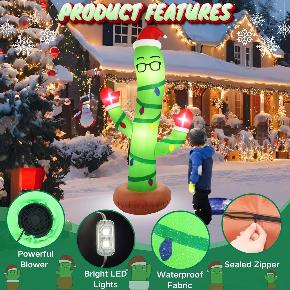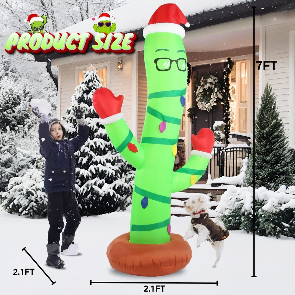 Eye-Catching Design: This Christmas inflatable decoration features a bespectacled cactus wriggled around with a Christmas hat on its head and Christmas gloves on its hands . Perfect for adding a playful twist to your holiday decor, cactus is surrounded by colored light bulbs, ready to celebrate atmosphere. Ideal for brightening up your lawn or garden, this unique decoration combines festive cheer with a touch of summer fun, making it a standout piece for any holiday display Durable & Waterproof Material: This 7ft tall eyeglass cactus inflatable Christmas yard decoration is made of excellent quality thickened polyester material with tight stitching. With its good waterproofing ability, fade resistance, lightweight and breath ability, it offers longevity, vibrant colors, and easy maintenance. Accompany you on Christmas year after year make our inflatable decorations is an excellent choice for anyone looking for a quality blowups décor Safety & Reinforcement Design: This funny Christmas outdoor decorations eyeglass cactus is equipped with 2 fasten ropes, 4 ground stakes and 2 fixed heavy sandbags that make it secure easily in outdoor settings such as gardens and lawns. No need to worry that it will fly away with the wind. Our large cactus blow up lawn decor also come with a built-in fan and a safe adapter plug, making it very safe for outdoor use, so that you can enjoy the joy of the vacation with more confidence Easy Setup and Storage: Built in a powerful blower, just zip up the bottom zipper and plug in the converter, the large eyeglass cactus inflatable outdoor decorations will self inflate in a short time. Then simply secure the inflatable Christmas ornaments with stakes and ropes. At the end of the vacation, just unplug it, self-deflate quickly and store it in the storage bag. Note: please make sure the zipper is closed and the blower is facing up when inflating Great Christmas Decor for Any Occasion: Whether you want to enhance your yard, lawn, porch, or garden, restaurants, cafes, home, indoor and outdoor use, this eyeglass cactus blow up decoration will add a touch of fun to any space. Inflatable eyeglass cactus decorations are an ideal choice for Christmas decorations, which can quickly enhance the festive atmosphere and make homes, communities and commercial places more joyful