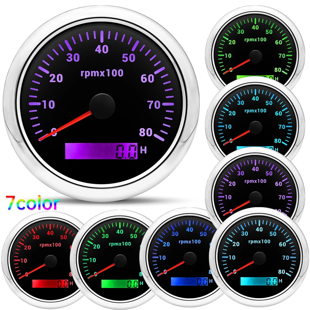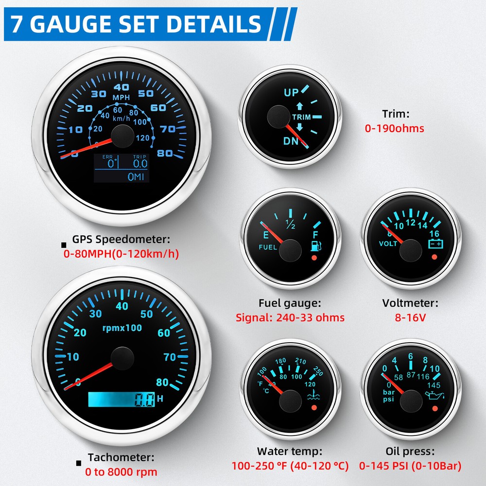 7 Gauge Set with Senders 85mm GPS Speedometer 80MPH/120km/h Tacho Fuel oil Water 7 Gauge Set with Senders 85mm GPS Speedometer 80MPH/120km/h Tacho 8000RPM & 52mm Gauge For Car Boat Feature: High-brightness LED backlight. 316 stainless steel for long-term use even in acid-base, humid environment. IP67 waterproof and dust-proof grade. With curved glass( with anti-fog function). Suitable for all kinds of vehicle modification. Using stepper motor drive pointer, accurate display of the engine speed, and with the LCD display clear display mileage. Gauges have many kinds backlight color (red,yellow,orange,green,blue,purple,white),customers can adjust any color that you like GPS Speedometer Gauge Install Diameter: Φ85mm or 3-3/8" Signal: GPS Working Voltage: 9~32V DC Indication Range: 0-80MPH 0-120Km/H Backlight:7 Colors Backlight Tachometer Install Diameter: Φ85mm or 3-3/8" Engine hours: 0.0-99999.9H Backlight :7 Color backlight Indicating Range: 0~8000 RPM Signal: Pulse Volt Gauge Sizes:52 mm (2-1/16") Measuring Range:8-16 (V) Backlight: 7 Colors Fuel Level Gauge Sizes:52 mm (2-1/16") Measuring Range:Empty - Full Resistance: 240 (E)-33 (F) ohms Backlight:7 Colors Water Temperature Gauge Install diameter: Φ52mm Indication range: 0~120℃/100-250℉ Input signal: 287.4~22.4 ohm Storage temperature: -40~+85 Backlight: 7 Colors Oil Pressure Gauge Install diameter:Φ52mm or 2-1/16" Indication range:0~10bar/0-145 PSI Operating temperature:-30~+75℃ Storage temperature:-40~+85℃ Backlight: 7 Colors Trim Gauge (Right Side) : 7 Color Backlight:Red (default)→green → blue → white →yellow→cyan →Purple →(automatic). Fixing dimension:52mm(2'') Indicating Range:UP-DN Signal:0-190ohms Working Voltage:9-32V(12V/24V) Operation mode:LCD display, stepper motor Package Includes: 1X 85MM Digital GPS Speedometer Gauge 1X GPS Antenna 1X 85MM Tachometer 1X 52MM Fuel Level gauge 1X 52MM Trim gauge 1X 52MM Voltmeter 1X 52MM Water temp gauge 1X 52MM Oil Pressure gauge 7X Installation Instruction The sending units will be included