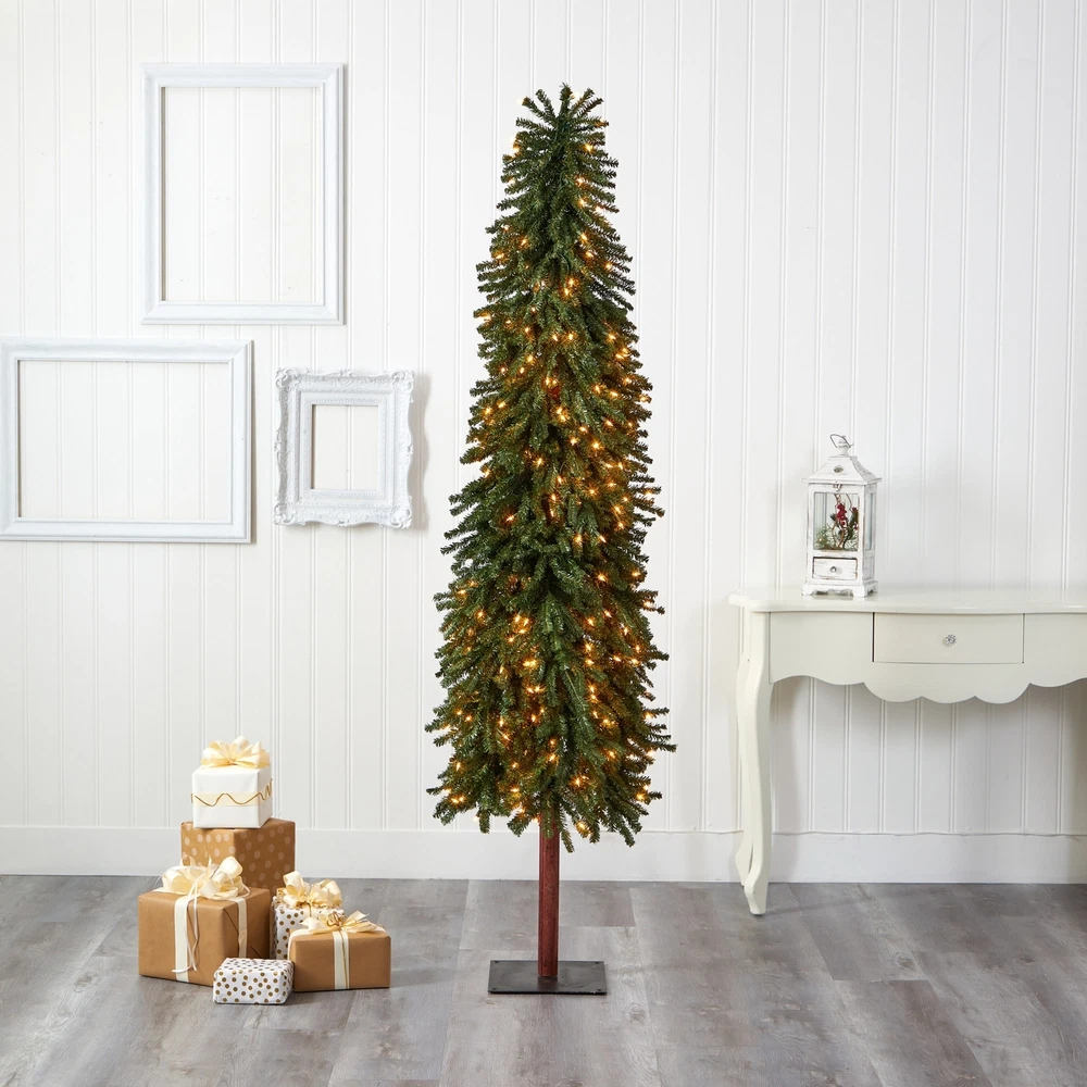 Create a traditional evergreen setting even in the tightest spaces with the help of this artificial Christmas tree. Entirely maintenance free, it features a tight, slimming silhouette made up of mountain pine greenery with 950 easy-to-bend branches for showcasing all your holiday ornaments and pre-strung with 400 lights to help eliminate the hassle of tangles or knots. Guaranteed to make holiday decorating stress-free, this slim-fitting artificial Christmas tree stands 7' tall and comes stabilized on a wooden pole and metal base for effortless display all season long. Free Shipping Over $49.99* Details 7' Grand Alpine Christmas Tree with 400 Clear Lights - Green Product Description: Create a traditional evergreen setting even in the tightest spaces with the help of this artificial Christmas tree. Entirely maintenance free, it features a tight, slimming silhouette made up of mountain pine greenery with 950 easy-to-bend branches for showcasing all your holiday ornaments and pre-strung with 400 lights to help eliminate the hassle of tangles or knots. Guaranteed to make holiday decorating stress-free, this slim-fitting artificial Christmas tree stands 7' tall and comes stabilized on a wooden pole and metal base for effortless display all season long.