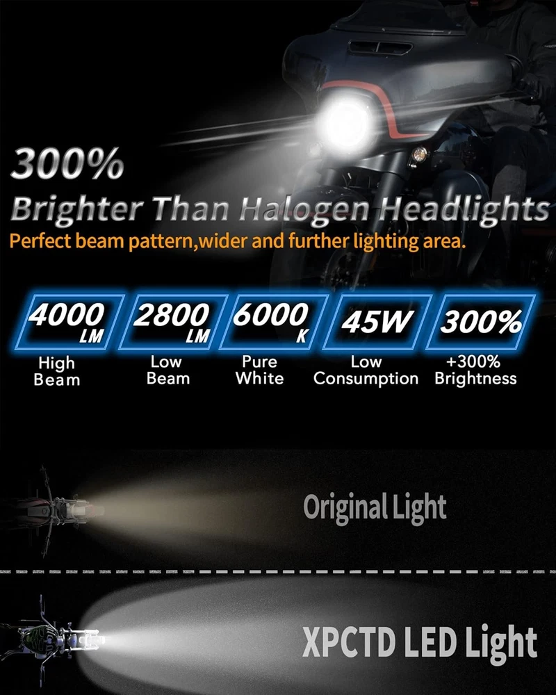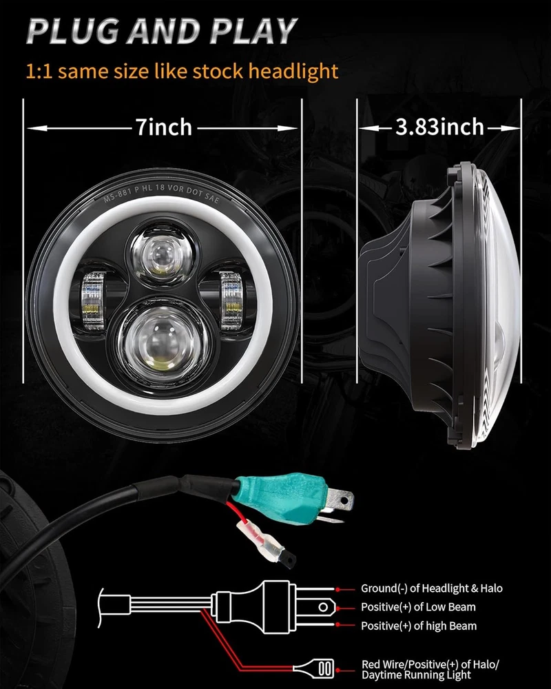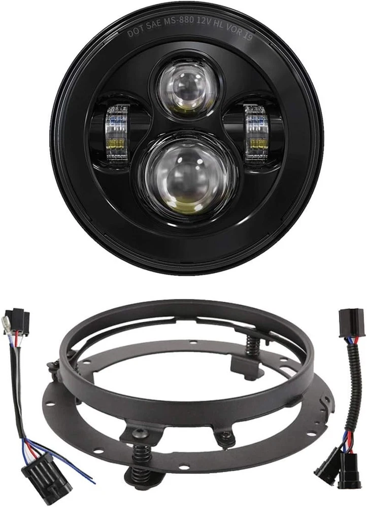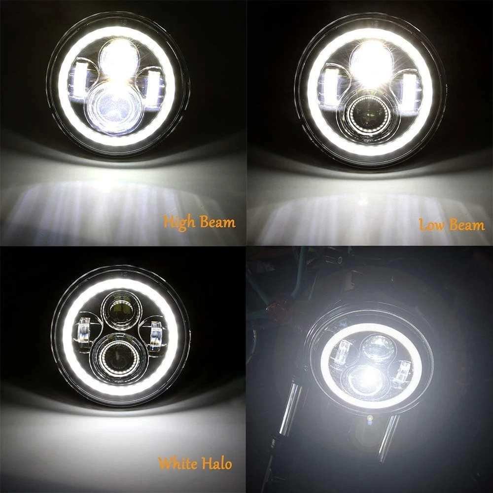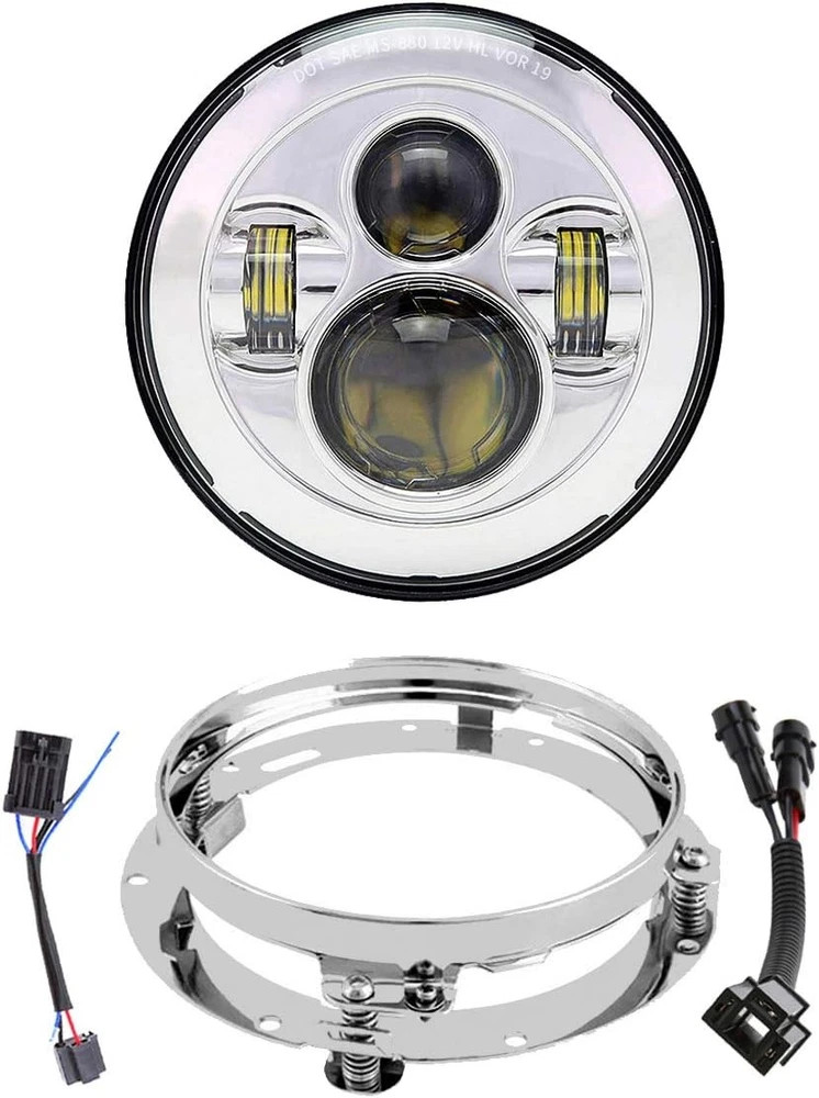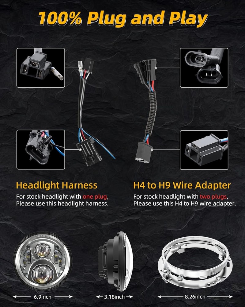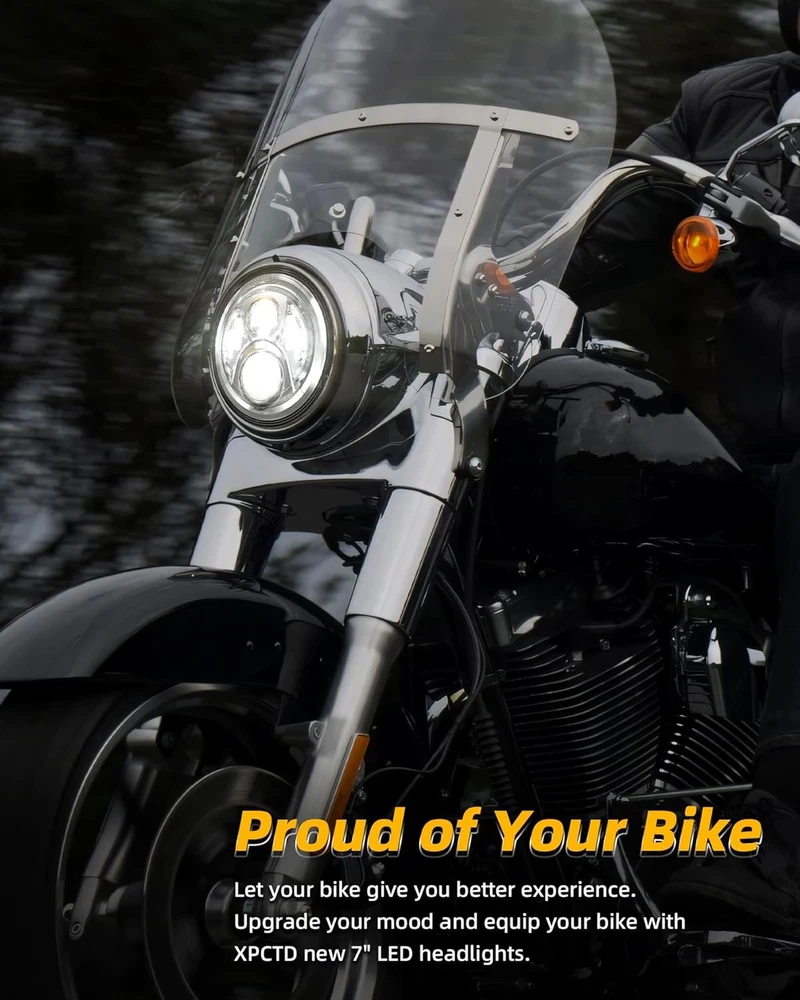 Product description Fitment:(Included but not limited to) Electra Glide 1995-2009 Electra Glide Standard FLHT 2010-2014 Electra Glide Police FLHTP 1994-2013 Electra Glide Classic FLHTC 1999-2002 Electra Glide Classic FLHTCI 2009-2013 Tri Glide Ultra Classic FLHTCUTG 2010-2014 Electra Glide Ultra Limited FLHTK 1994-2019 Electra Glide Ultra Classic FLHTCU 1995-2006 Electra Glide Ultra Classic FLHTCUI Road King & Ultra Classic 1994-2019 Road King FLHR 1996-2006 Road King FLHRI 2004-2007 Road King Custom FLHRS 2004-2006 Road King Custom FLHRSI 2017-2019 Road King Special FLHRXS 1998-2006 Road King Classic FLHRCI 2007-2013 Road King Classic FLHRC 1995-1997 Ultra Classic Electra Glide FLHTCU 2005-2013 Ultra Classic Electra Glide FLHTCU 1995-2004 Ultra Classic Electra Glide EFI FLHTCUI Street Glide & Fat Boy & Heritage Softail & Dyna 2006-2019 Street Glide FLHX 2014-2019 Street Glide Special FLHXS 2010-2011 Street Glide Trike FLHXXX 2001-2006 Fat Boy FLSTFI 2016-2017 Fat Boy S FLSTFBS 1994-2017 Fat Boy FLSTF 2010-2016 Fat Boy Lo FLSTFB 1994-2017 Heritage Softail Classic FLSTC 2001-2006 Heritage Softail Classic EFI FLSTCI 2012-2016 Dyna Switchback FLD CVO 2003 CVO Road King FLHRSEI 2002 CVO Road King 2 FLHRSEI 2004-2005 CVO Electra Glide FLHTCSE 2006-2013 CVO Ultra Classic Electra Glide FLHTCUSE 2009-2016 Tri Glide Ultra Classic FLHTCUTG If your bike has the standard 7 inch light, this headlight will fit your bike, plug and play. But due to the different design of some headlight mounting brackets, some modifications are required,such as Vulcan Classic 900C. Please let us know if you are not sure before purchase. "Y" Shape H4-H9/H11 Wire Harness H4-H9/H11 wire harness fits for some models of vehicles have very special two pcs sockets for headlight,( such as 2014-2019 road king special, street glide special), one for high beam, one for low beam. Package Included: 1 x 7 inch Led Headlight; 1 x 7 inch Mounting Bracket; 1 x Wire Harness; 1 x H4-H9/H11 Wire Harness; 1 x Instruction Super Bright 7 inch Led Headlight Made with high-quality led chips, much brighter than stock light, wider beam and further down the road. With super sturdy PC lens, much resistant and durable than stock or other lights which made of toughened glass or PMMA. DOT Approved, legal on the road. Plug and Play, the installation is a breeze which usually takes you about 10-20 minutes. Good cooling performance, aluminum body acts as a heat sink for up to 10 times longer life than typical headlights. Specification: LED Chip: High-Intensity Led Chips Power: 45W Voltage: 12-24V DC Lumen: 4000lms on high beam, 2600lms on low beam Housing: Aluminum Alloy Lens: PC Plastic Life Span: More than 50,000 hours Product Display: Easy Installation Built-in Anti-flicker, avoid flickering effectively. Straight plug-n-play, easy to install, it usually only takes about 10-20 minutes to install. Make sure all screws and bolts are well locked before driving on the road. Super Bright Electra glide headlight is made with high-intensity led chips, much brighter than stock and other light. With scientific optic design & unique technology, the cutoff is very sharp and straight. It won't blind other drivers. Make your driving much safer. Durability Come with aluminum alloy and sturdy PC lens, good cooling system and high Impact resistance, our headlights are much durable than stock & other lights. IP67 Waterproof, sealed by high-quality waterproof material, they can work well in various weather conditions.