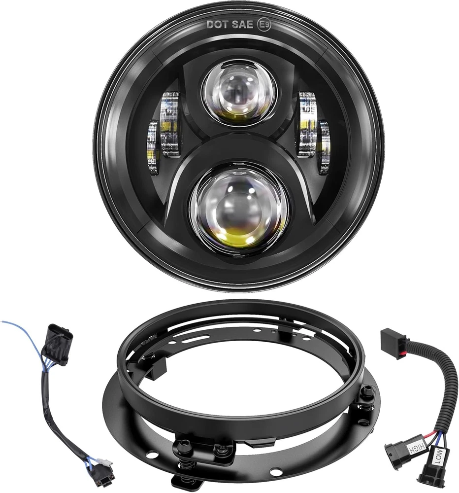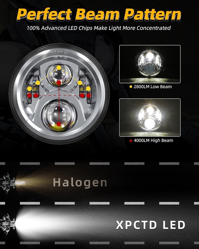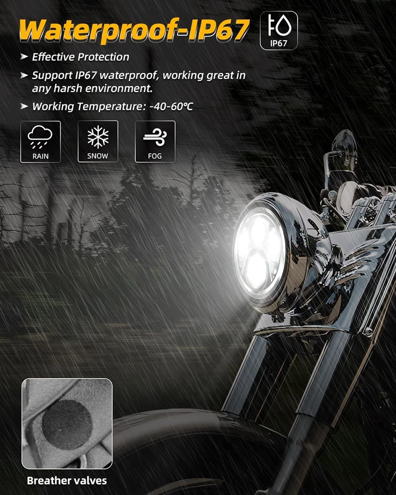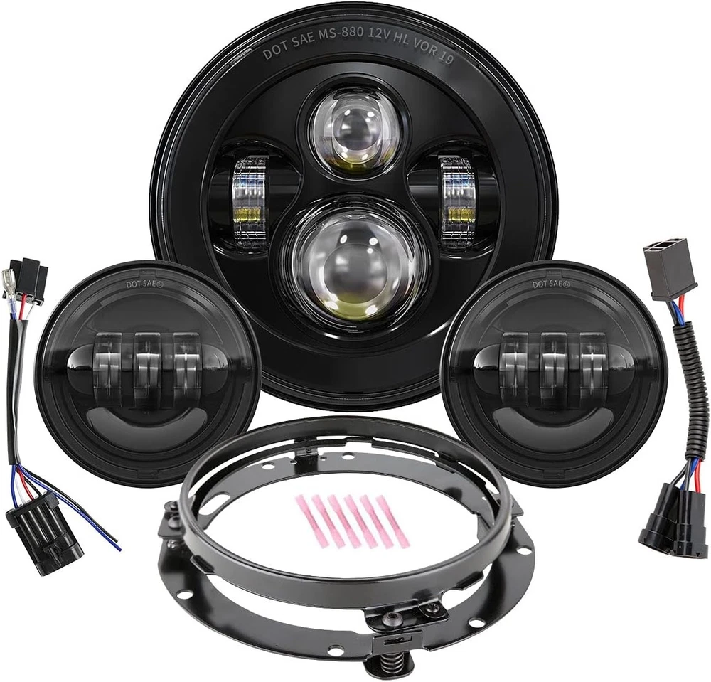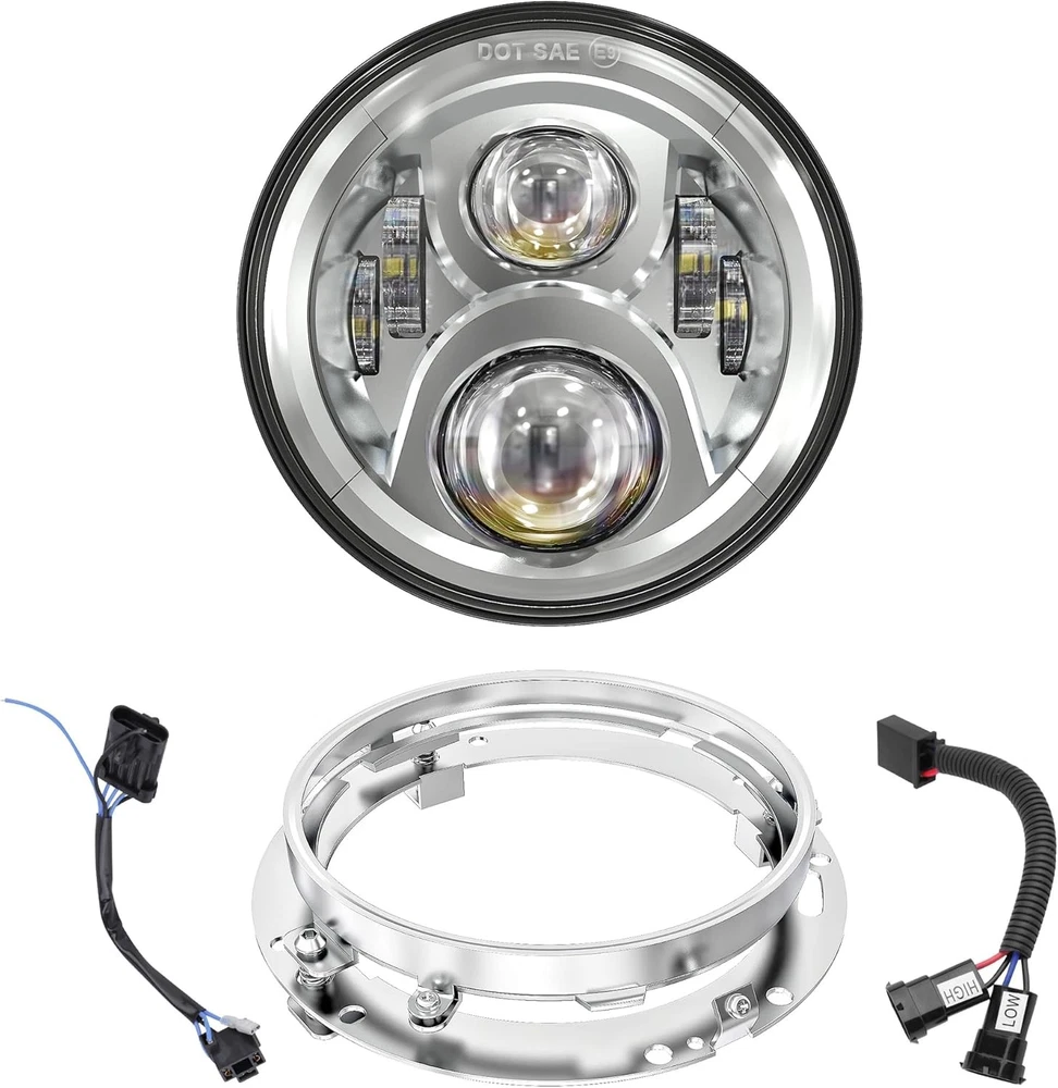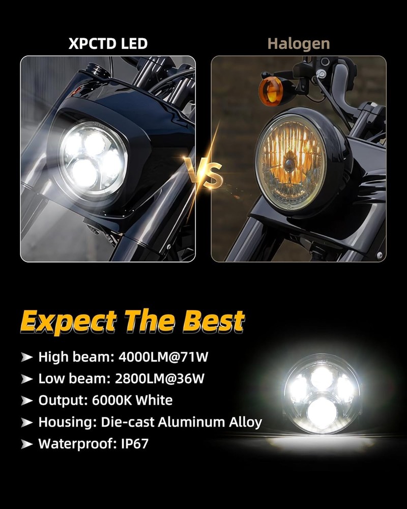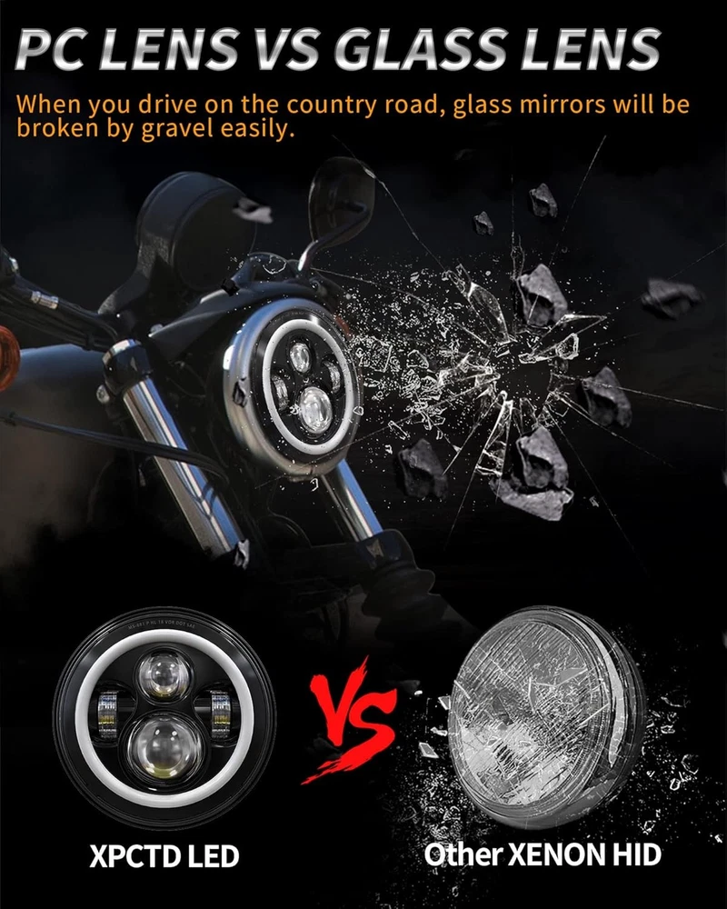 Product description Fitment:(Included but not limited to) Electra Glide 1995-2009 Electra Glide Standard FLHT 2010-2014 Electra Glide Police FLHTP 1994-2013 Electra Glide Classic FLHTC 1999-2002 Electra Glide Classic FLHTCI 2009-2013 Tri Glide Ultra Classic FLHTCUTG 2010-2014 Electra Glide Ultra Limited FLHTK 1994-2019 Electra Glide Ultra Classic FLHTCU 1995-2006 Electra Glide Ultra Classic FLHTCUI Road King & Ultra Classic 1994-2019 Road King FLHR 1996-2006 Road King FLHRI 2004-2007 Road King Custom FLHRS 2004-2006 Road King Custom FLHRSI 2017-2019 Road King Special FLHRXS 1998-2006 Road King Classic FLHRCI 2007-2013 Road King Classic FLHRC 1995-1997 Ultra Classic Electra Glide FLHTCU 2005-2013 Ultra Classic Electra Glide FLHTCU 1995-2004 Ultra Classic Electra Glide EFI FLHTCUI Street Glide & Fat Boy & Heritage Softail & Dyna 2006-2019 Street Glide FLHX 2014-2019 Street Glide Special FLHXS 2010-2011 Street Glide Trike FLHXXX 2001-2006 Fat Boy FLSTFI 2016-2017 Fat Boy S FLSTFBS 1994-2017 Fat Boy FLSTF 2010-2016 Fat Boy Lo FLSTFB 1994-2017 Heritage Softail Classic FLSTC 2001-2006 Heritage Softail Classic EFI FLSTCI 2012-2016 Dyna Switchback FLD CVO 2003 CVO Road King FLHRSEI 2002 CVO Road King 2 FLHRSEI 2004-2005 CVO Electra Glide FLHTCSE 2006-2013 CVO Ultra Classic Electra Glide FLHTCUSE 2009-2016 Tri Glide Ultra Classic FLHTCUTG If your bike has the standard 7 inch light, this headlight will fit your bike, plug and play. But due to the different design of some headlight mounting brackets, some modifications are required,such as Vulcan Classic 900C. Please let us know if you are not sure before purchase. "Y" Shape H4-H9/H11 Wire Harness H4-H9/H11 wire harness fits for some models of vehicles have very special two pcs sockets for headlight,( such as 2014-2019 road king special, street glide special), one for high beam, one for low beam. Package Included: 1 x 7 inch Led Headlight; 1 x 7 inch Mounting Bracket; 1 x Wire Harness; 1 x H4-H9/H11 Wire Harness; 1 x Instruction Super Bright 7 inch Led Headlight Made with high-quality led chips, much brighter than stock light, wider beam and further down the road. With super sturdy PC lens, much resistant and durable than stock or other lights which made of toughened glass or PMMA. DOT Approved, legal on the road. Plug and Play, the installation is a breeze which usually takes you about 10-20 minutes. Good cooling performance, aluminum body acts as a heat sink for up to 10 times longer life than typical headlights. Specification: LED Chip: High-Intensity Led Chips Power: 45W Voltage: 12-24V DC Lumen: 4000lms on high beam, 2600lms on low beam Housing: Aluminum Alloy Lens: PC Plastic Life Span: More than 50,000 hours Product Display: Easy Installation Built-in Anti-flicker, avoid flickering effectively. Straight plug-n-play, easy to install, it usually only takes about 10-20 minutes to install. Make sure all screws and bolts are well locked before driving on the road. Super Bright Electra glide headlight is made with high-intensity led chips, much brighter than stock and other light. With scientific optic design & unique technology, the cutoff is very sharp and straight. It won't blind other drivers. Make your driving much safer. Durability Come with aluminum alloy and sturdy PC lens, good cooling system and high Impact resistance, our headlights are much durable than stock & other lights. IP67 Waterproof, sealed by high-quality waterproof material, they can work well in various weather conditions.