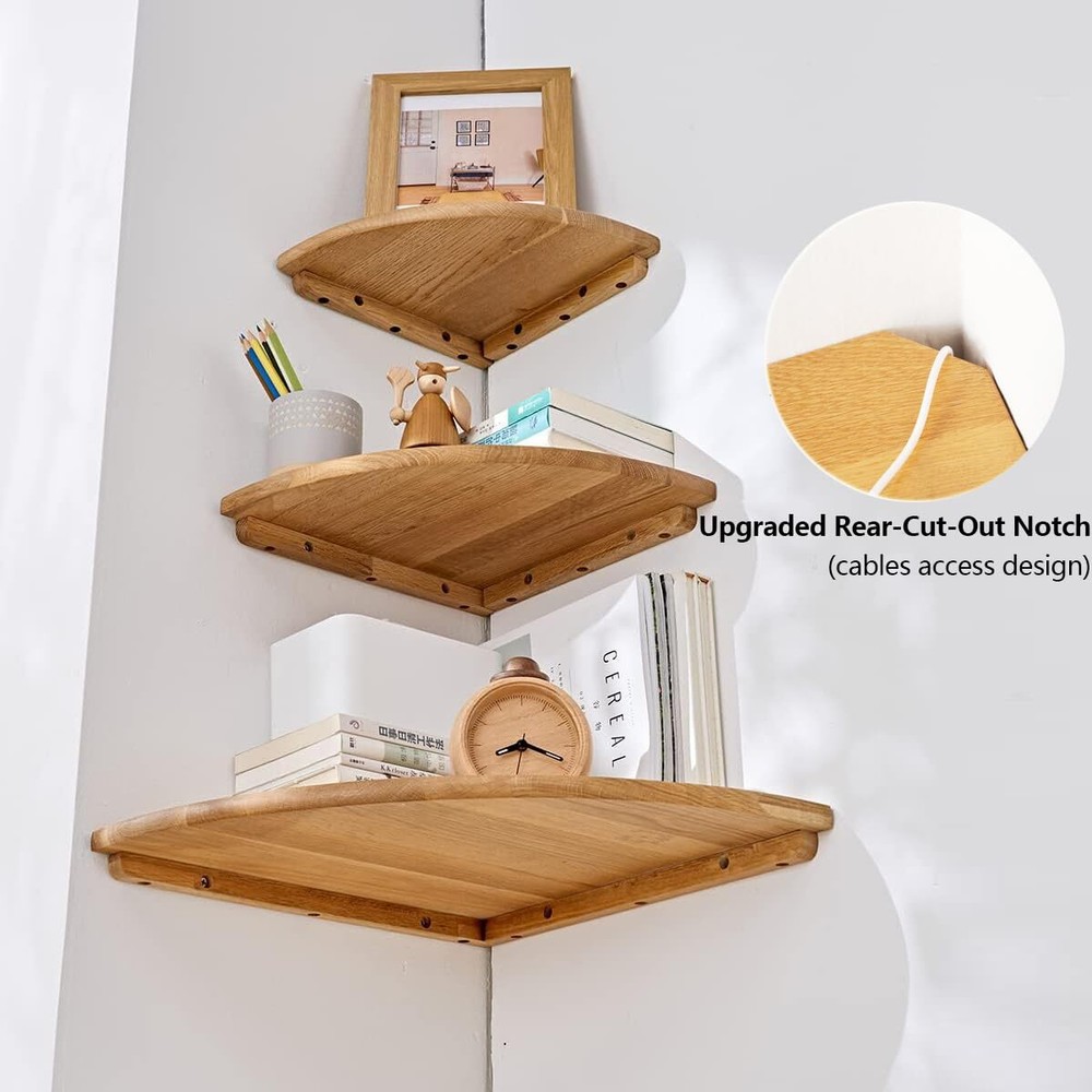 These white oak corner shelves are a game-changer for small spaces! The solid wood feels sturdy and the minimalist design blends seamlessly into any room. I love using them in my bathroom for extra storage—they hold toiletries and decor without cluttering the counter. The eco-friendly finish gives a nice natural look, and the floating design maximizes unused corners. Perfect for plants, books, or displaying trinkets while keeping things organized. Easy to install and surprisingly spacious for their size. Definitely worth it for the quality and versatility!