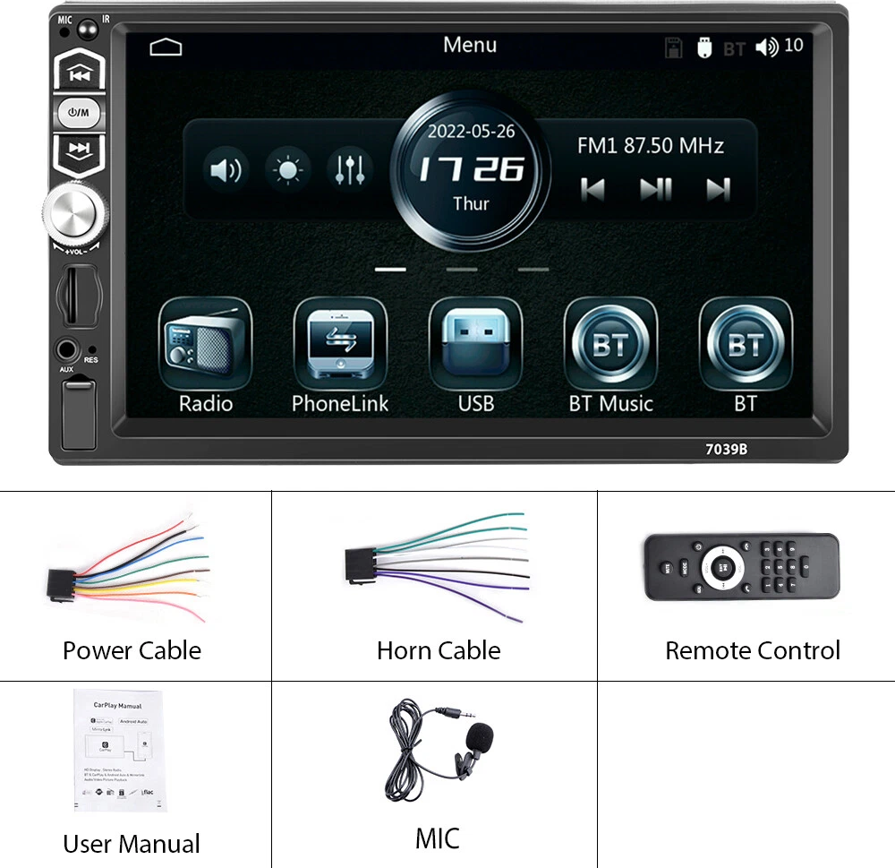 7" Single 1 DIN Touch Screen Car Stereo Radio Apple Carplay Bluetooth MP5 Player Description Features ●Carplay: You can use connection to carplay, connect to Apple mobile phone, access mobile phone address book, mail, notification, map navigation, music, video and other information, and realize voice control. ●Android Auto , use USB data cable to connect. ●Screen: 7-inch high-definition video playback ●Mirror Link: Support Android/ Iphone Mirror Link,through phone's original USB line Can synchronized to the on-board screen,which can support Apple mobile phone 13.4 version, Android mobile phone version 10.1. More than this version or does not support mobile phones, need to upgrade the software after the original factory debugging ●Built-in Bluetooth function, can connect to phone, and handsfree calling, more safer when driving car,bluetooth music play ●FM radio: You can listen to real-time traffic, news boradcasts, weather forecasts, etc receiver 18 preset Store Function ●Support Steering wheel control function : Quickly switch functions which you want with your car's steering wheel,more convenient ● Rear view camera input function(optional):Need to choose the camera, if connect to a car backup camera, the car stereo monitor will turn to rear view reversing details automatically(require optional) ● Colorful backlight settings:Support seven color backlight,you can select your favorite color in the setup menu decorate your car ●AUX audio input interface supports external MP3, mobile phones, music players, etc. Specification: System: WINCE Model: 7039B Size: 7.0 inches Voltage: 12V Audio amplifier: 7388 Bluetooth: 5.1 Screen resolution: 1024*600 Output power: 4*45W USB interface: USB2.0 Reversing input: CVBS Radio range: FM 87.5-108.0MHZ (Europe) Working temperature: -10℃ ~ 60℃ Audio format: MP3/WMA/WAV/APE/FLAC Video format: MKV/AVI/TS/TP/MP4/M4V Max Bit Rate (50Mbps-80Mbps) Languages: English, French, Spanish, Russian, Italian Portuguese, German, Polish, Chinese (simplified), Turkish, Arabic, Hebrew Package Included: 1 x audio player 1 x Power Cable 1 x Horn Cable 1 x Remote Control 1 x User Manual 1 x MIC Payment Shipping Returns Contact Us 1. Only accept Paypal 2. All major credit cards are accepted through our secure payment processor PayPal. 3. We ship to your Paypal address. Please make sure your Paypal address is correct before you pay. Please make sure your eBay shipping address is correct for your receiving. We will try our best to solve any dispute and try our best to satisfy you. If you are not satisfied with our product, please contact first . We will gladly accept any return and give a full refund (minus shipping costs) on any item. The item must be returned to us in original condition with the health and hygiene seal intact. If you have not got it within the shipping time, please no hesitate to contact us. We will check it for you with the post office and customs. Because sometimes it will be delayed for traffic or flight jams. Please do not open dispute to us. We will take responsibility to resend or refund for any lost item. Please contact us in time if any enquriy under any circumstances. We greatly appreciate your positive feedback and we'll do the same to you. We care about our valued customers, and will always try our best to help you, if you have any problems. Working time: GMT+8 / 9:00-18:30 in normal we will reply you in one working day.