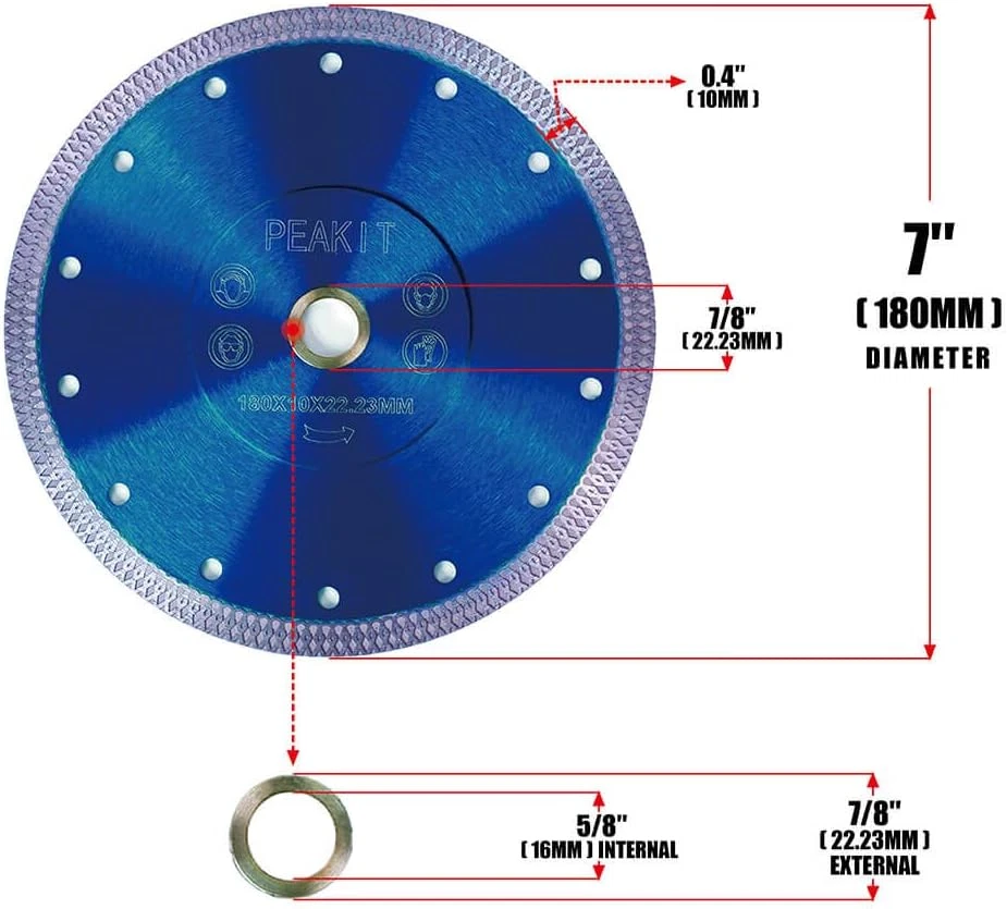 Store New Arrivals Add to Favorite View Feedback Contact 7 Inch Tile Saw Blade Dry Wet Cutting 7" Porcelain Diamond Tile Blade 7In Ceramic Tile Cutter Blade Disc Description Item model number tblade-bs7 Item Thickness 1.6 Millimeters Style Modern Number of Teeth 16 Compatible Material Porcelain, Ceramic, Marble, Stone Part Number tblade-bs7 Color Silver, Blue Material Composite Batteries Required? No Item Weight 12 ounces Shape Circular Batteries Included? No Item Package Quantity 2 Size 7" Product Dimensions 7.09"L x 6.69"W Number Of Pieces 1 FIT SIZE: 180 x 10 x 1.6 x 22.23 mm. Outer diameter: 7 inch / 180mm. Thickness: 1.6mm. With reducer washer suitable for most tile saws and hand-held angle grinders with a 7/8" or 5/8" Arbor. WIDE APPLICATION: Universal for dry or wet cutting. The super thin tile blades are designed for cutting porcelain, ceramic tile, granite, sandstone quartz, marble, slate, and cement backer board. HIGH PERFORMANCE: Turbo mesh rim offer fast and smooth cutting experience for you with minimal chipping. PEAKIT premium-grade 7" diamond saw blade ensures a longer service life. NOTICE: Wear protective equipment when using the tile cutter blade. And make sure that the direction indicated on the tile blade is the same as the direction of rotation of the tile cutter. :. For any questions, please Feel Free to . We will respond to you Within 12 Hours and Give You a Good Solution. PEAKIT 7 in Super Thin Diamond Saw Blade with 7/8" or 5/8" Arbor: Diameter:180mm /7 inch Arbor:7/8", 5/8" Core Thickness:1.6mm Quality:A class FEATURE: 1. Professional quality for porcelain, ceramic, granite, marble or natural stone tiles cutting. 2. Unique mesh rim blade, X teeth offer fast and smooth cutting. 3. Hot pressed tile cutting disc provide long life. 4. Fits most tile saw and angle grinders with a 7/8"or 5/8" arbor, available for both dry and wet cutting work. 100% CUSTOMERS SATISFATION GUARANTEED: If, for any questions, you have questions about our diamond blade, please Feel Free to . We will respond to you Within 12 Hours and Give You a Good Solution. ABOUT US We offer the best prices around on high quality products. Our E-store includes media such as books, movies, music and games while offering electronics, toys, sporting apparel, clothing, tools, general home, garden items and more. SHIPPING We are always working hard to ensure your package arrives as soon as possible. Please understand that some factors like weather, high postal traffic, and the performance of shipping companies are outside of our control. We offer free shipping to the lower 48 states and ship within 2 business days of payment, usually sooner. We do not accept P.O. Boxes. Please provide a physical address. For shipping outside of the continental USA, we only use eBay's Global Shipping Program.The item is shipped to KY and then sent to the rest of the world. International customers are responsible for all duties and taxes. Continue to check out in order to calculate costs for shipping the item to your country. Messages regarding eBay's Global Shipping Program MUST be directed at eBay EXCLUSIVELY. RETURNS We offer a 30-Day Return Policy on items which you are not completely satisfied with. You have the option for a full-refund or an exchange of the item. No returns are available on items shipped outside of the USA. PAYMENT We accept PayPal. CONTACT US This page content is yet to come Please ad us to your favorite seller and visit again later Thank You CUSTOMER SATISFACTION We try our very best to make sure every customer is completely satisfied. If there's a problem, message us! We're happy to help. WE ACCEPT Copyright © 2021 AutoDS. | All Rights Reserved